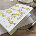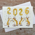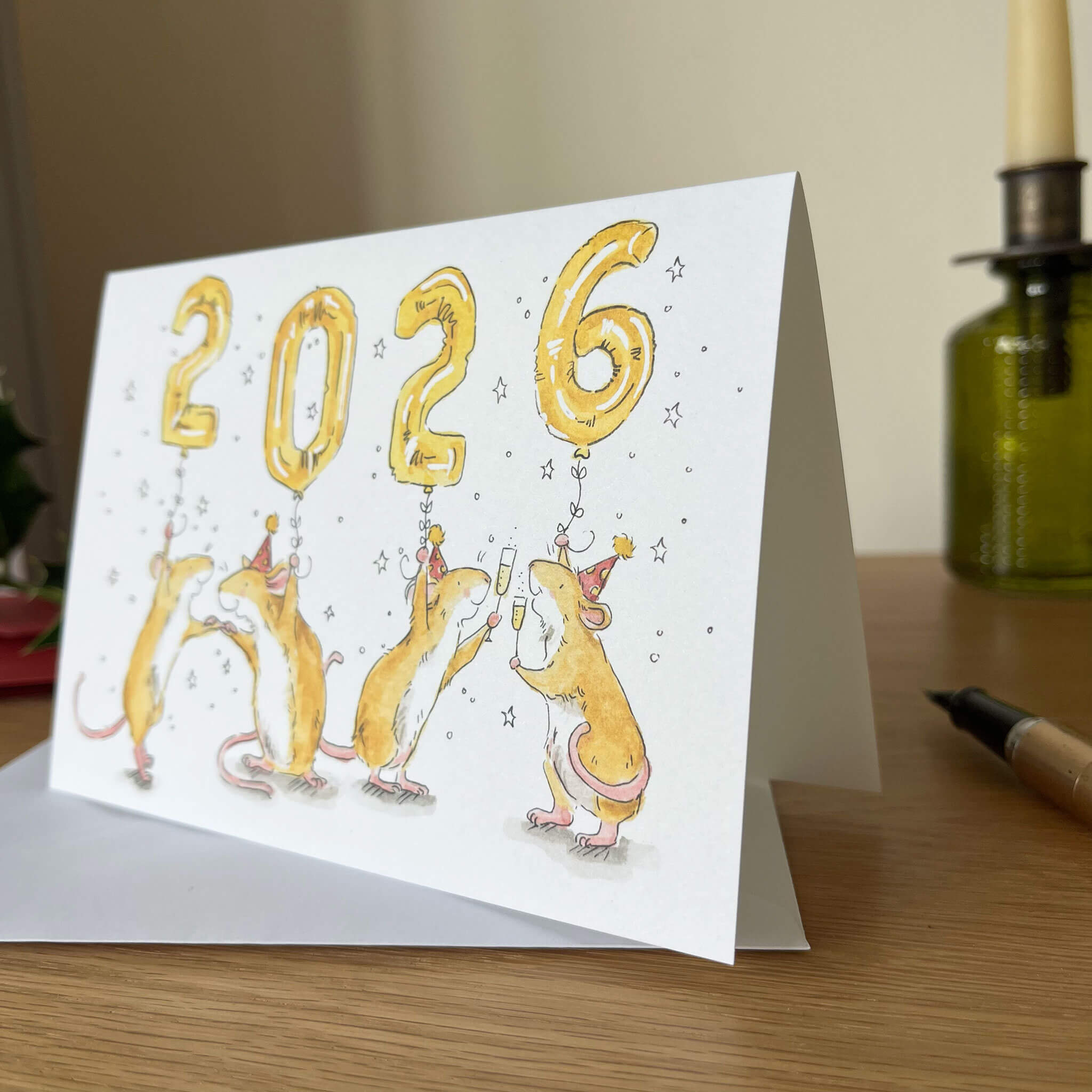 Wish someone a Happy New Year with this beautiful card of four mice celebrating the new year and all the exciting times ahead. The mice are holding number balloons to make '2026' and celebrating with prosecco and party hats. This card is also suitable for events upcoming in 2026 such as congratulations, weddings, holidays, exams etc