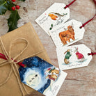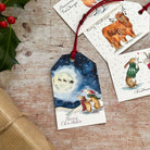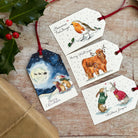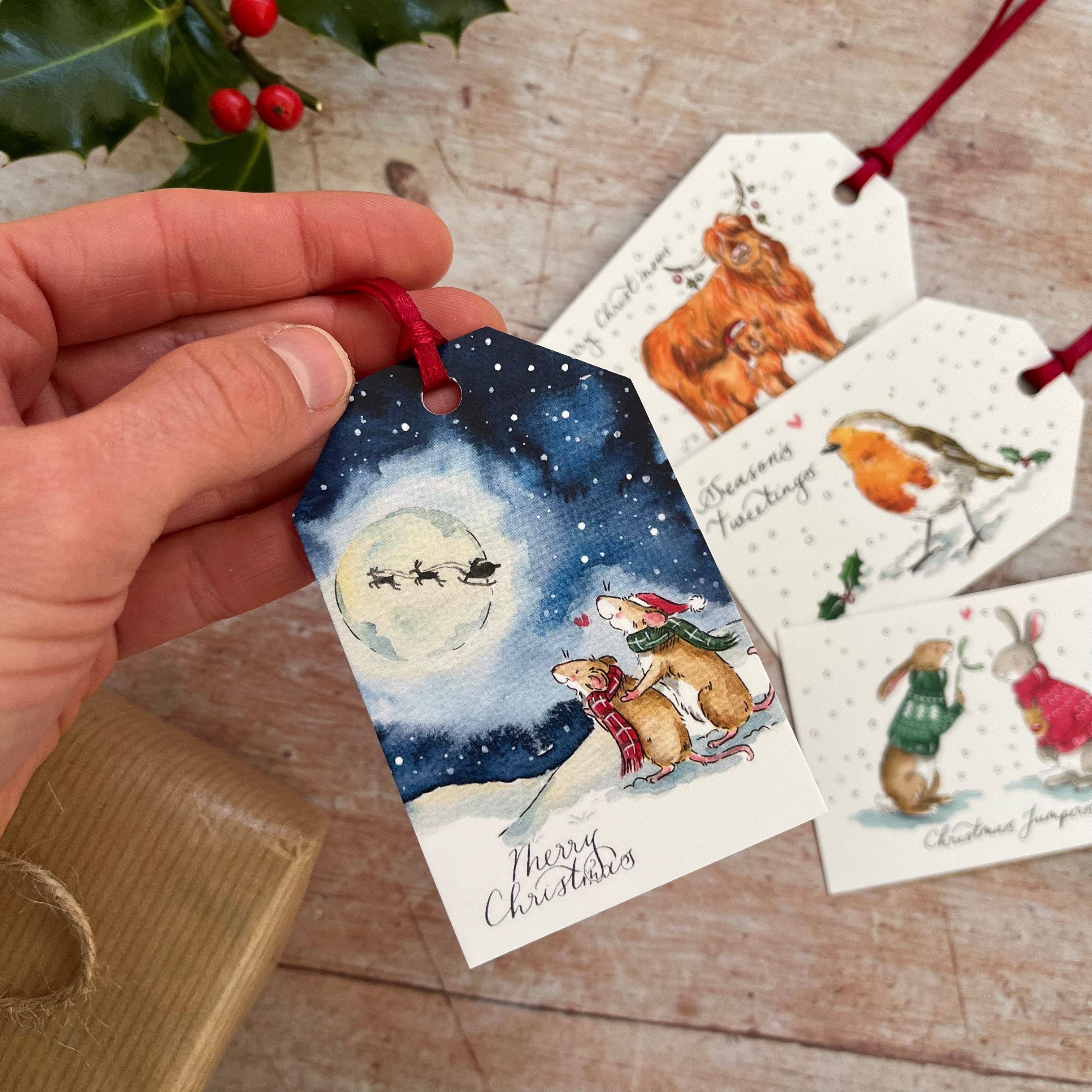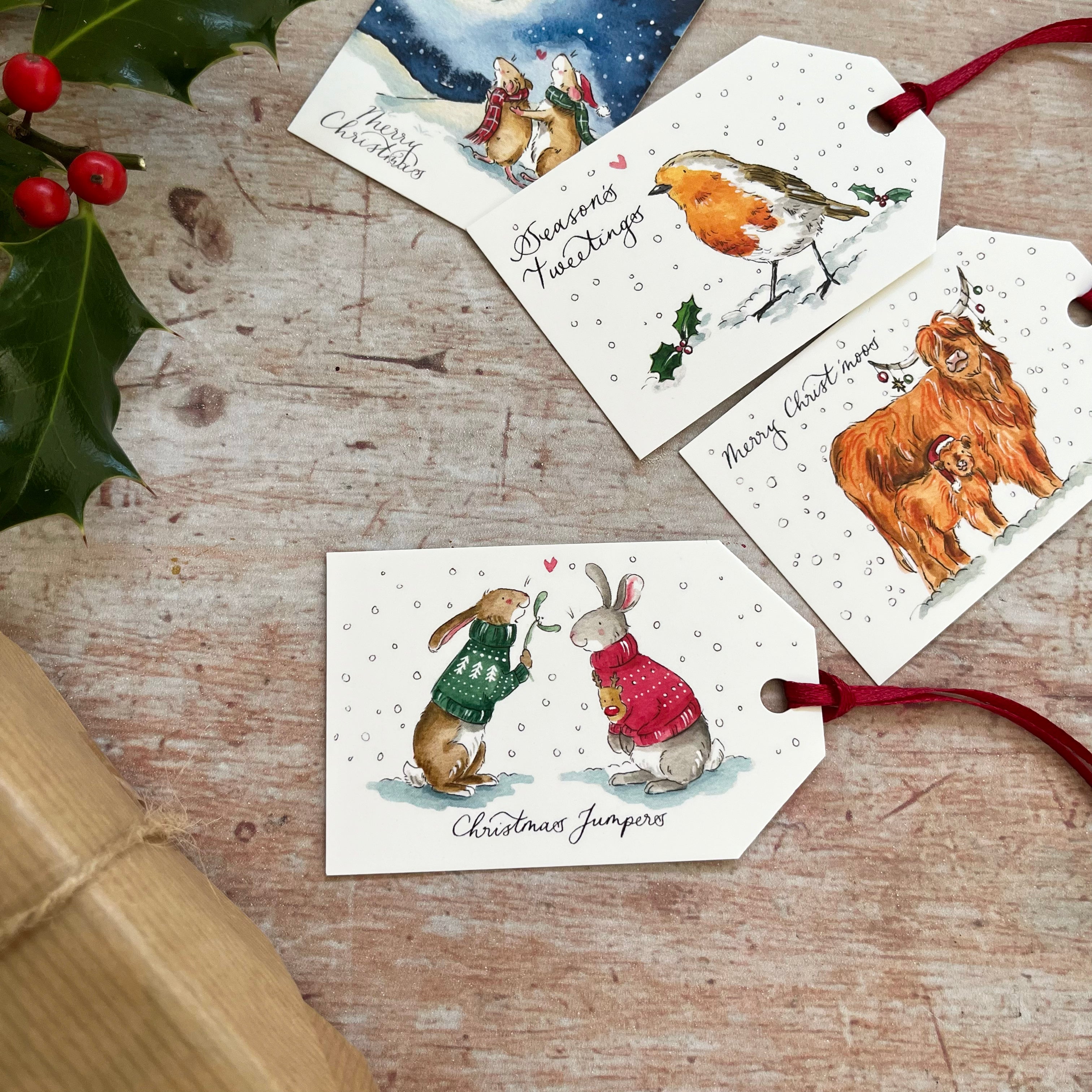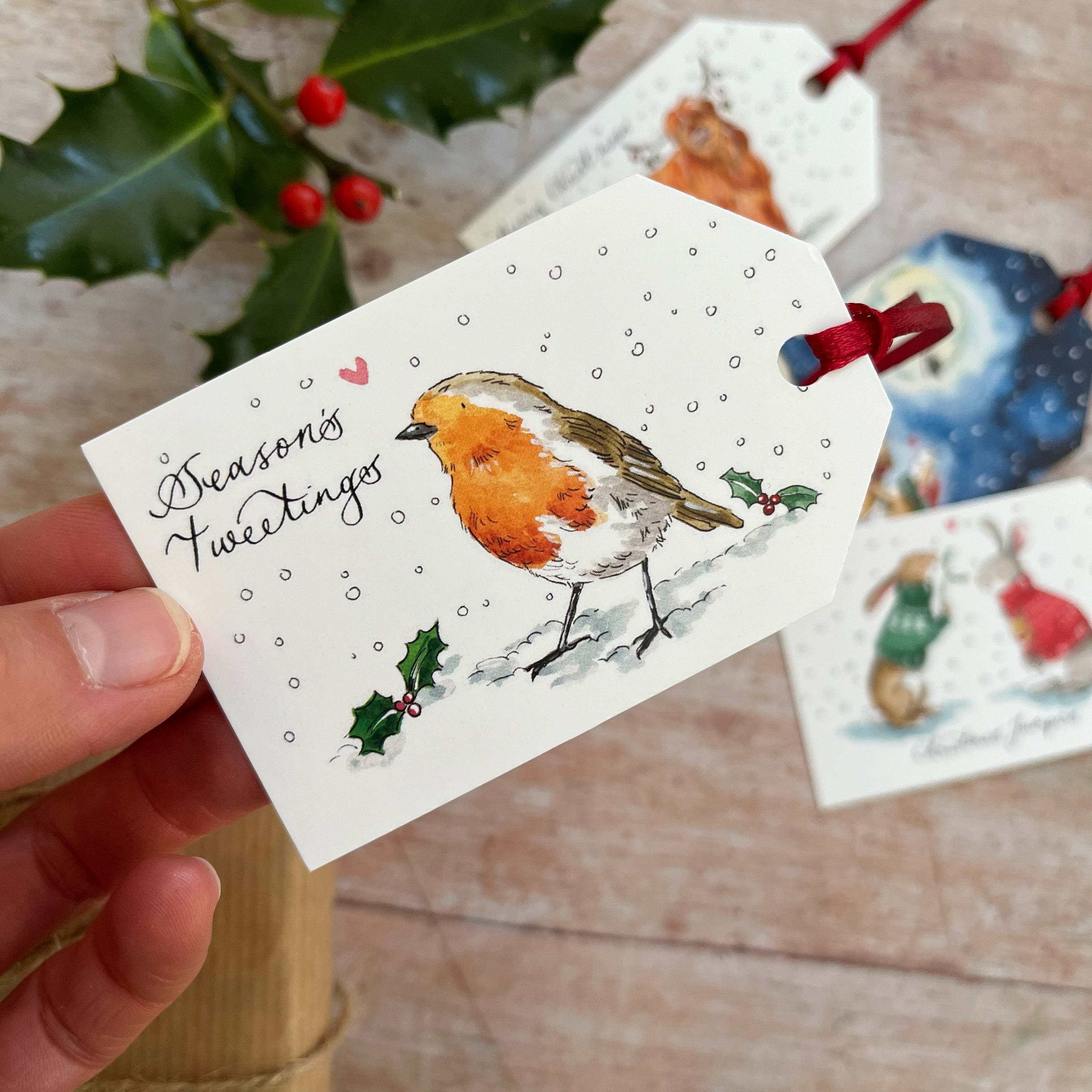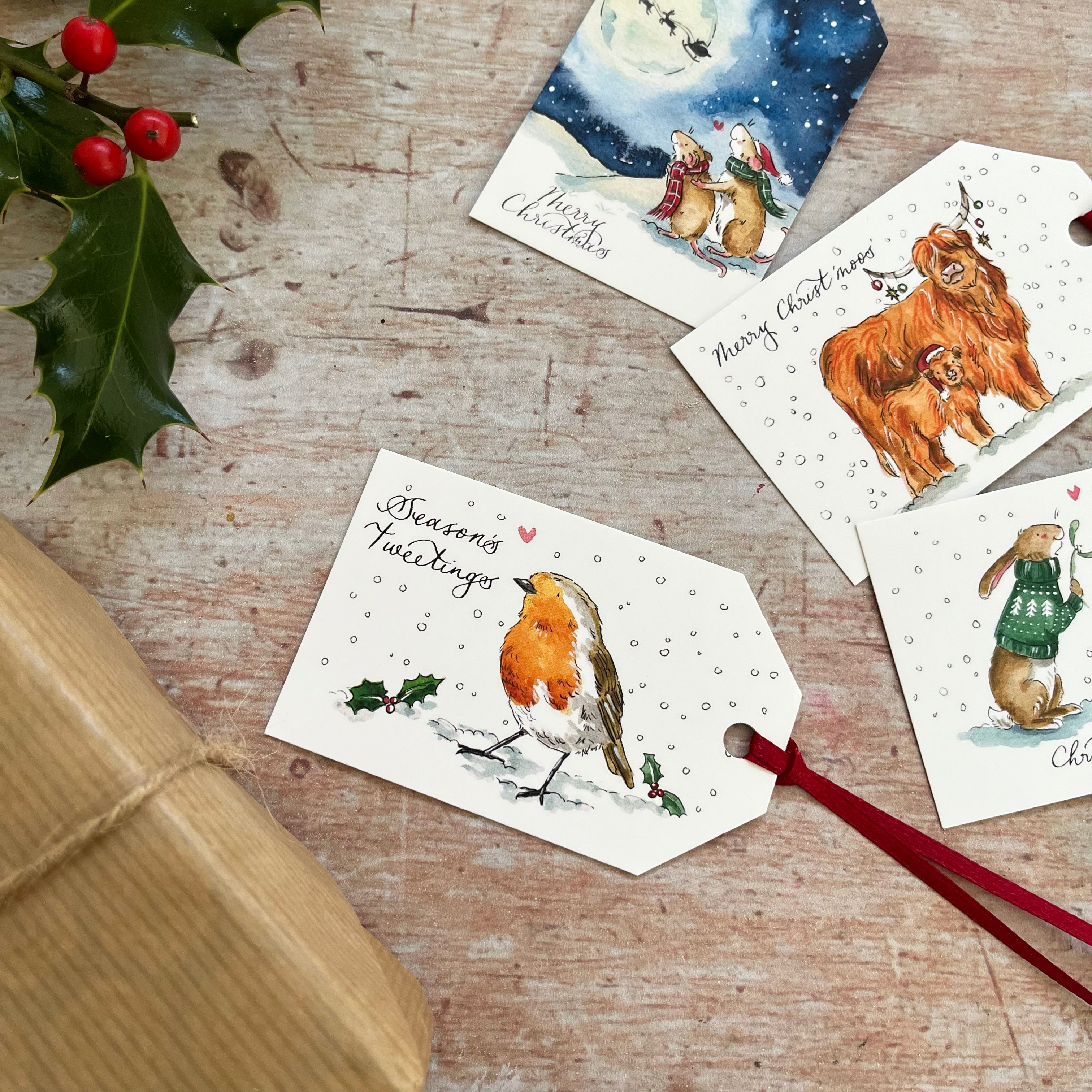 A beautiful set of 4 assorted Christmas tags, with hand tied scarlet red satin ribbon