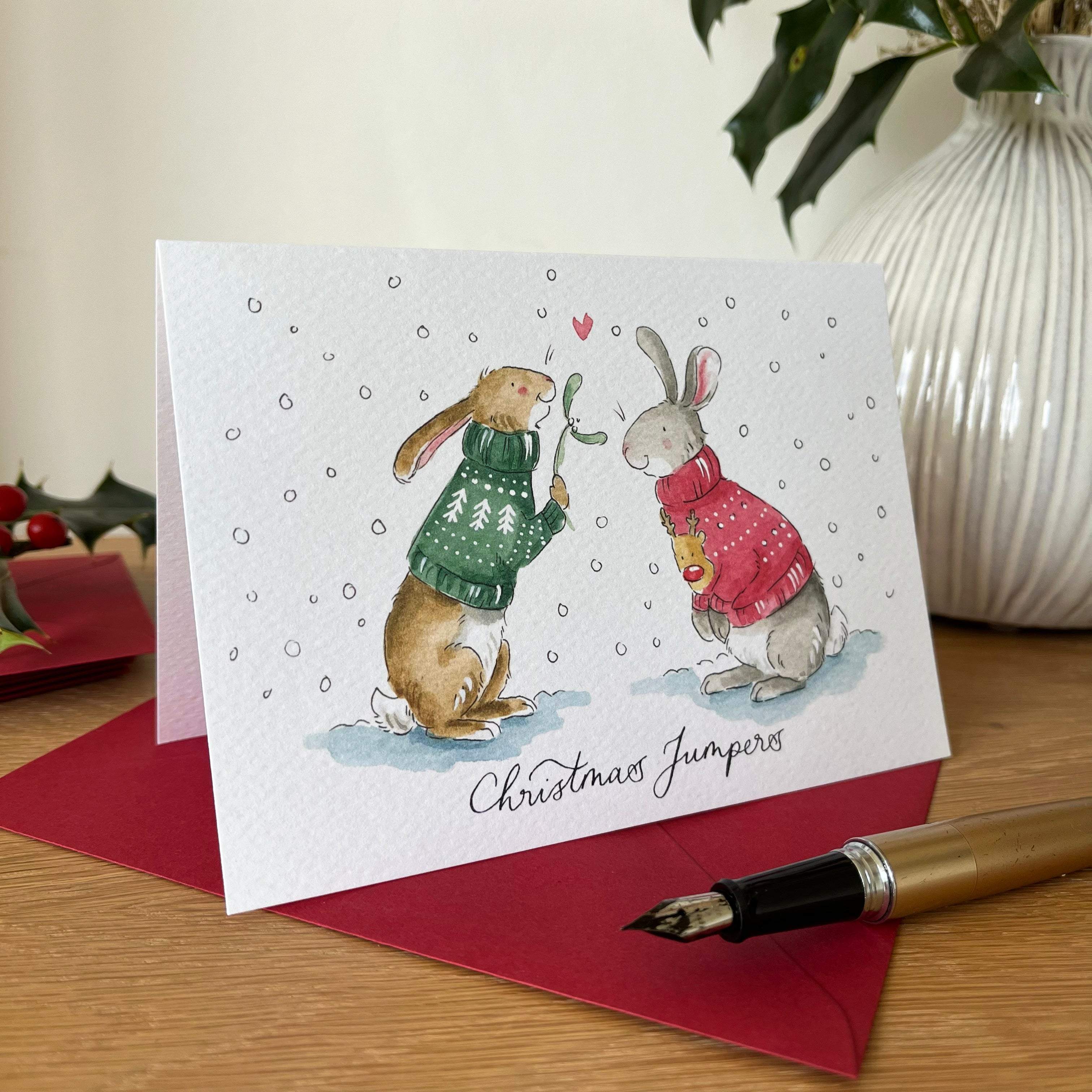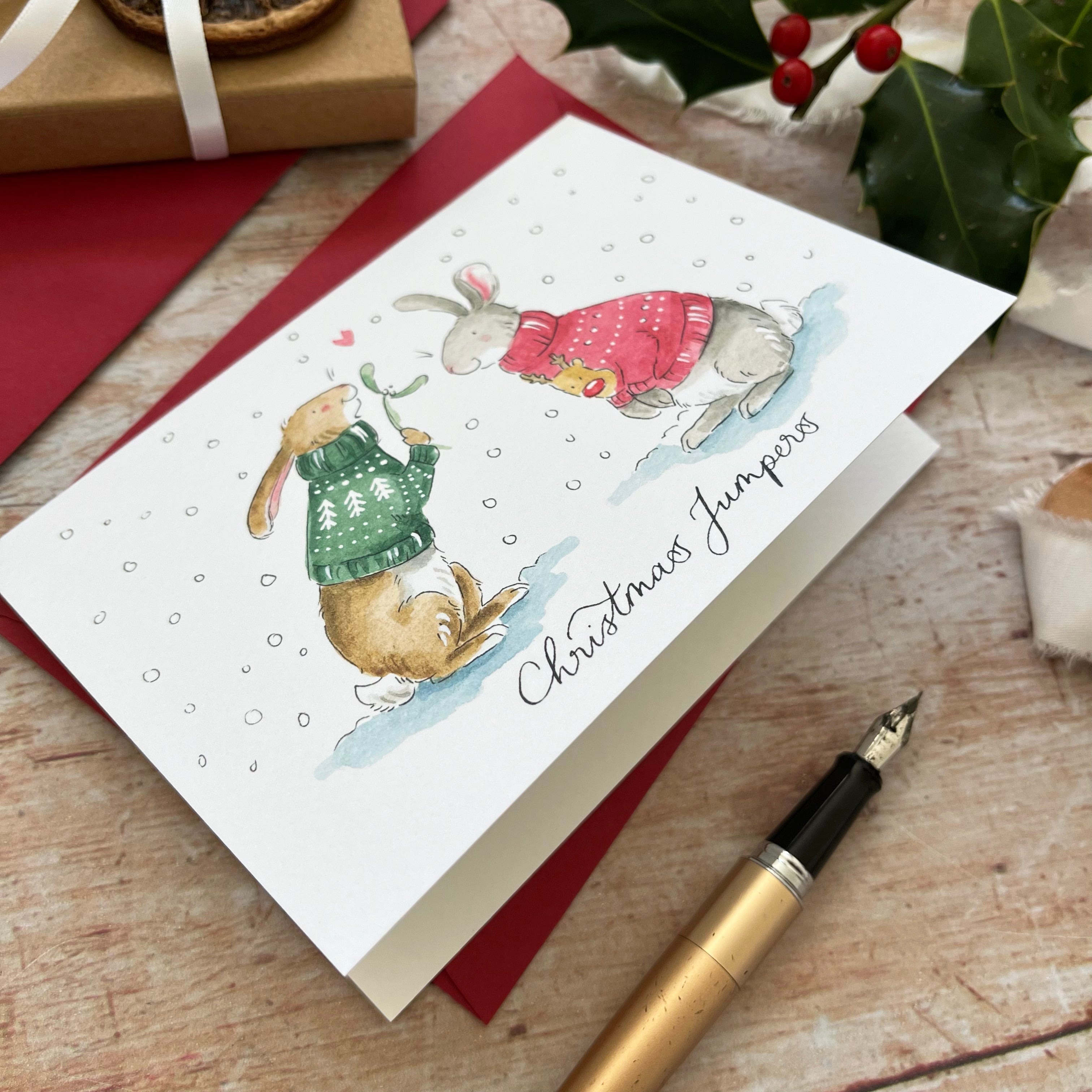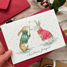 Send someone a festive greeting with this beautiful card of 'Christmas Jumpers' - 2 adorable rabbits in Christmas jumpers playing in the snow!