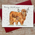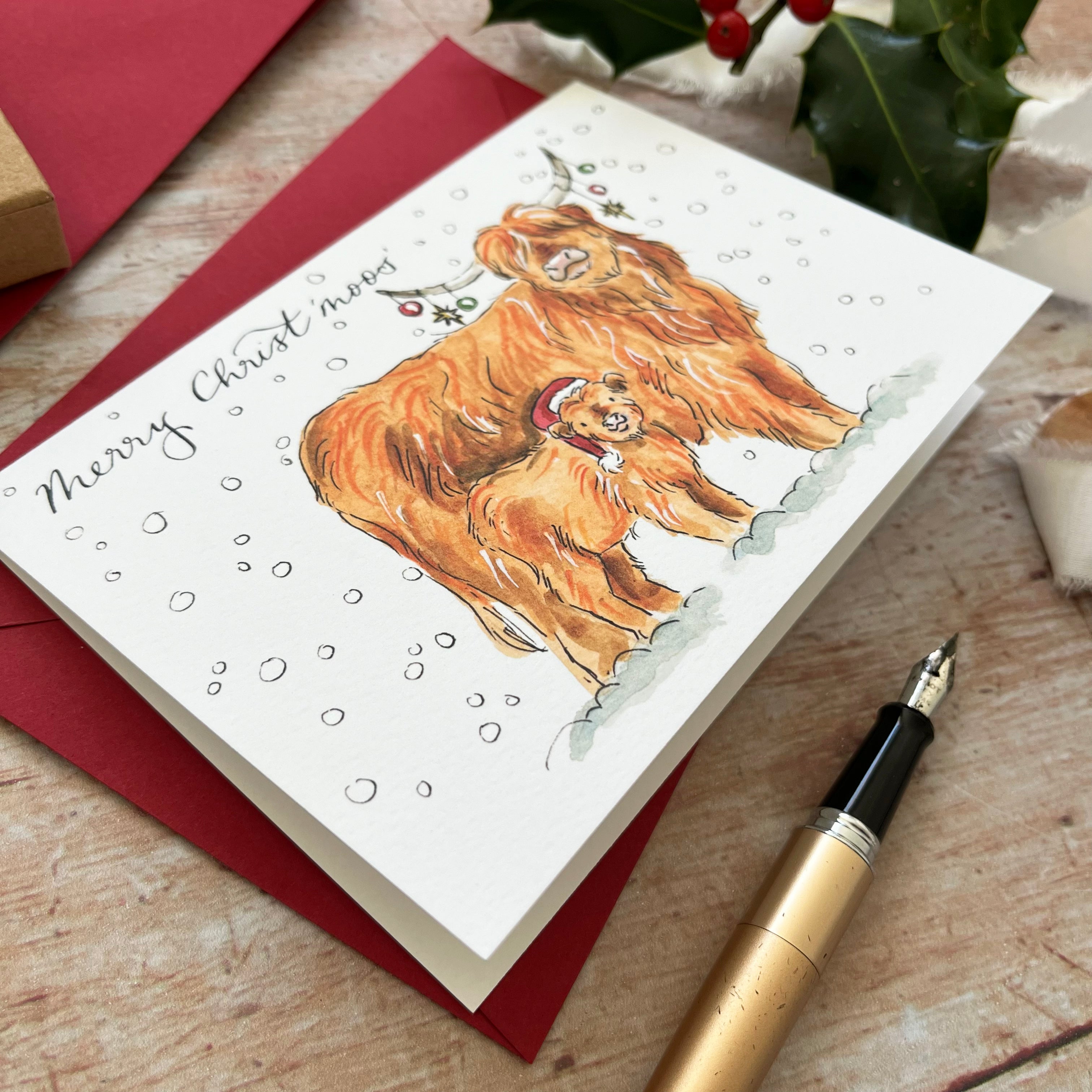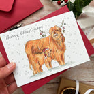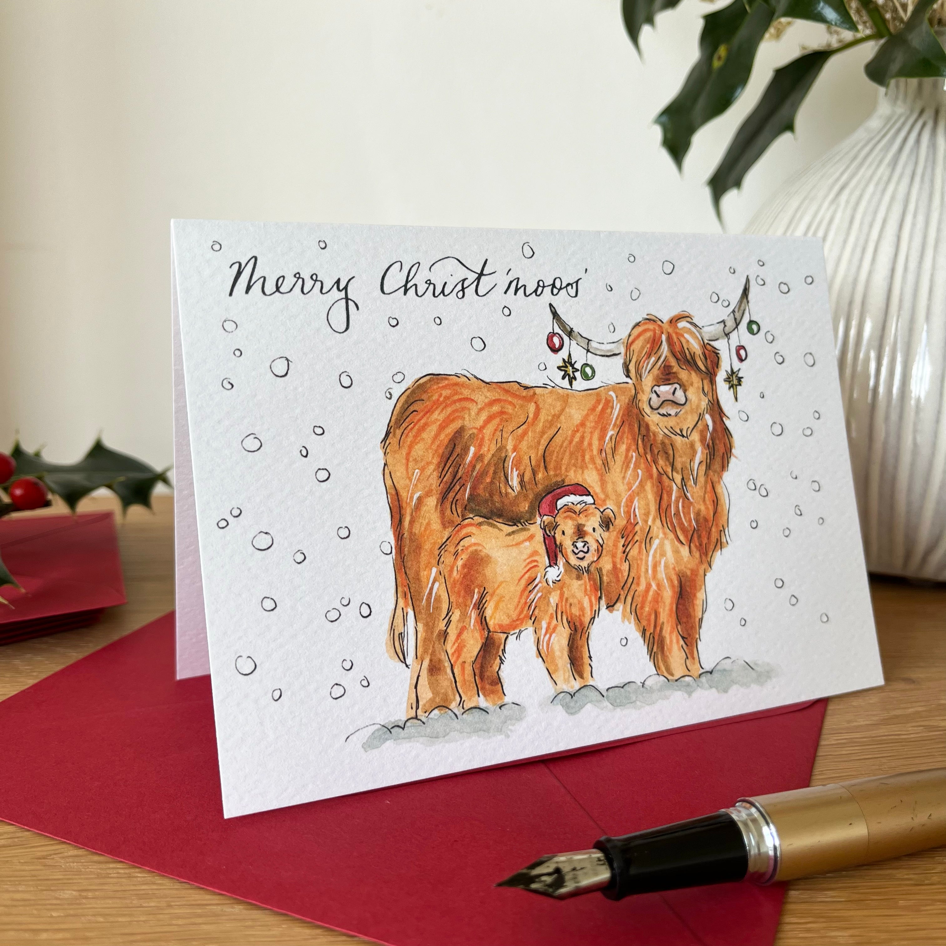 Wish someone a Merry Christ 'moos' with this beautiful card of a festive highland cow and calf.