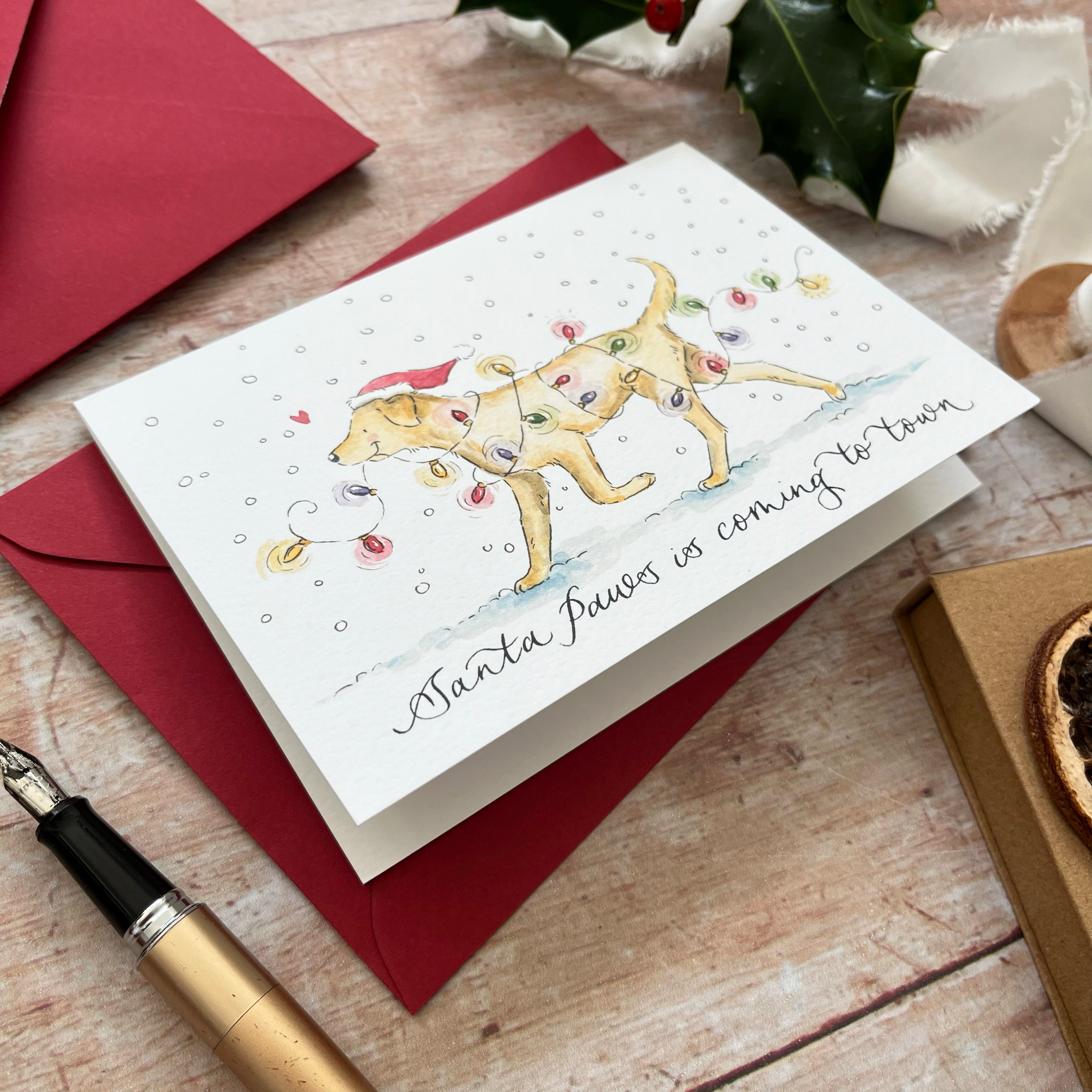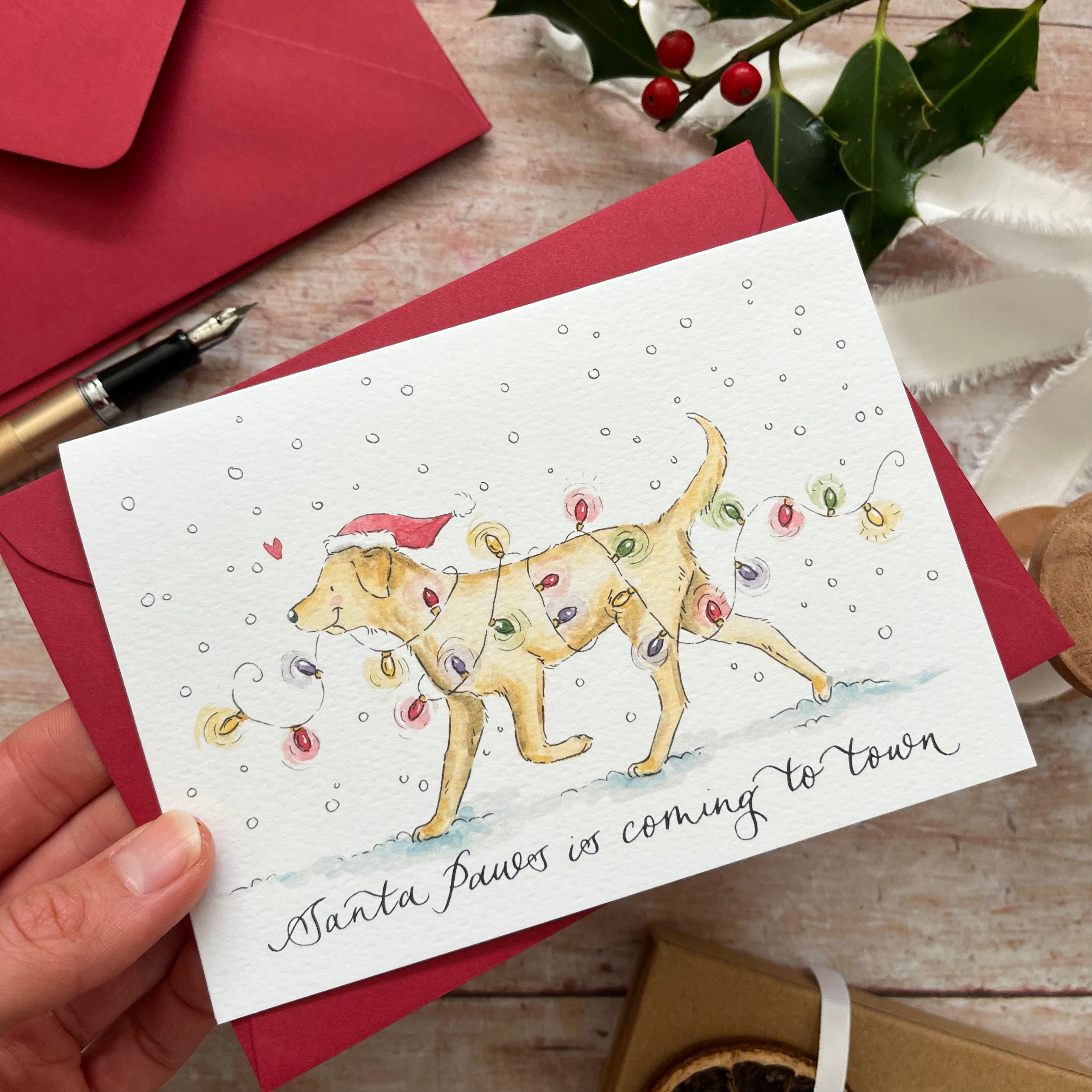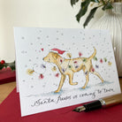 'Santa Paws is coming to town' - Send festive wishes with this beautiful card of a festive labrador dashing through the snow!