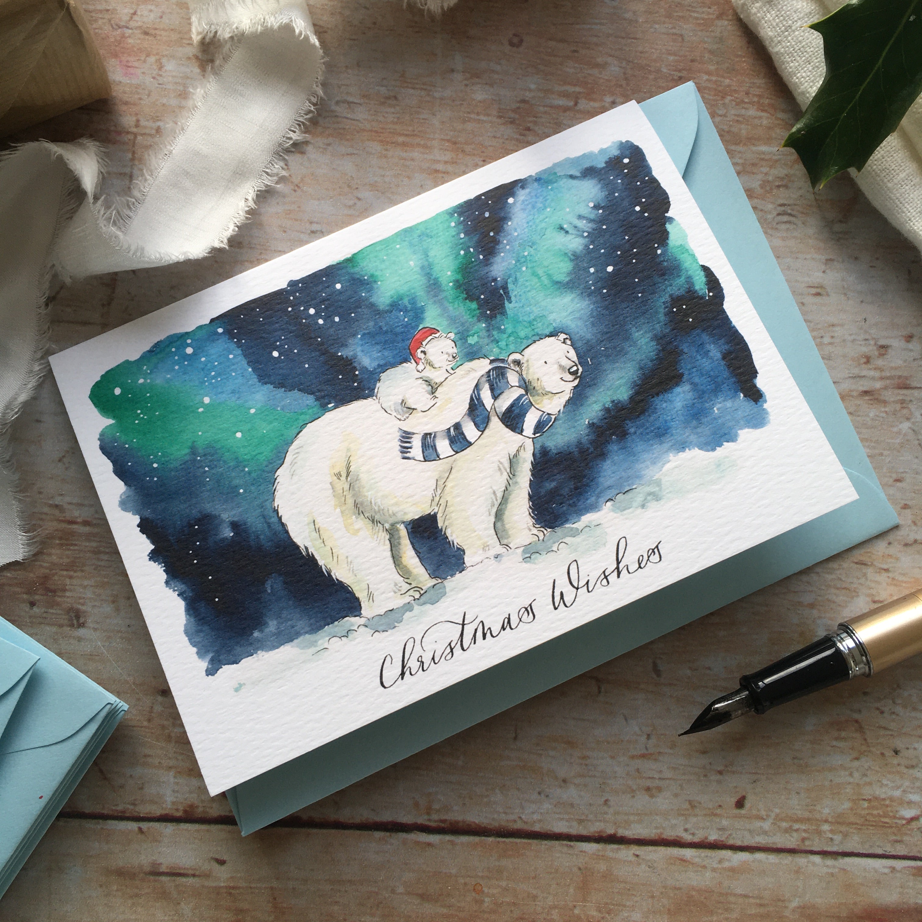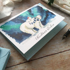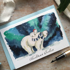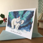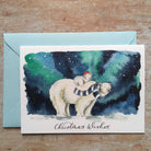 Send 'Christmas Wishes' with this beautiful card of a polar bear and cub against a starry, snowy night sky. The little cub is wearing a santa hat to get into the festive mood.