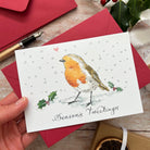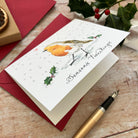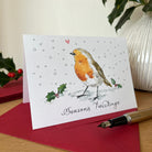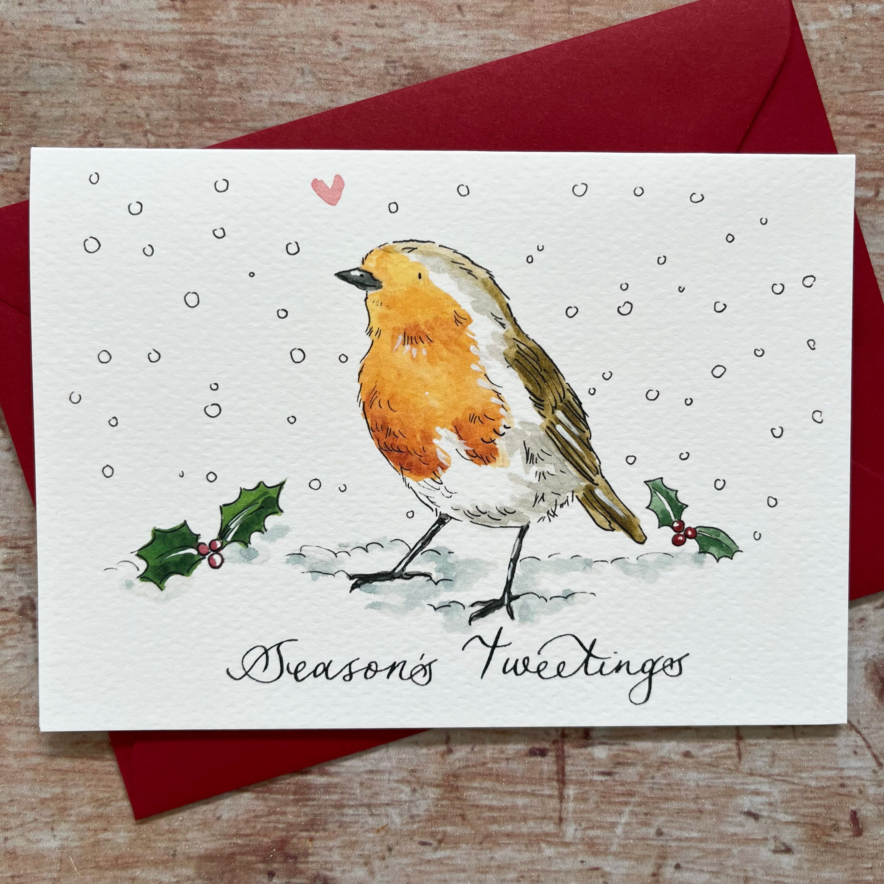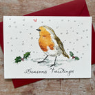 Send 'Season's Tweetings' with this beautiful card of a robin in the snow with holly.
