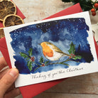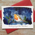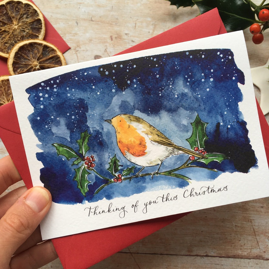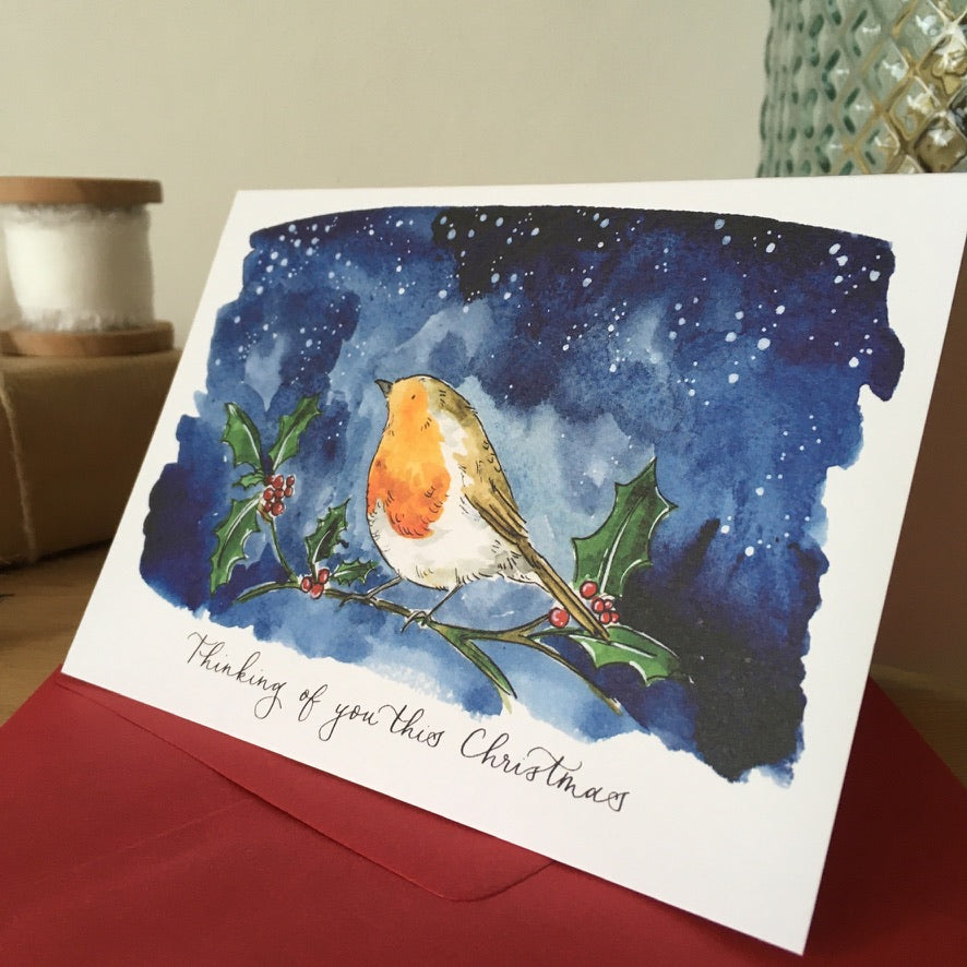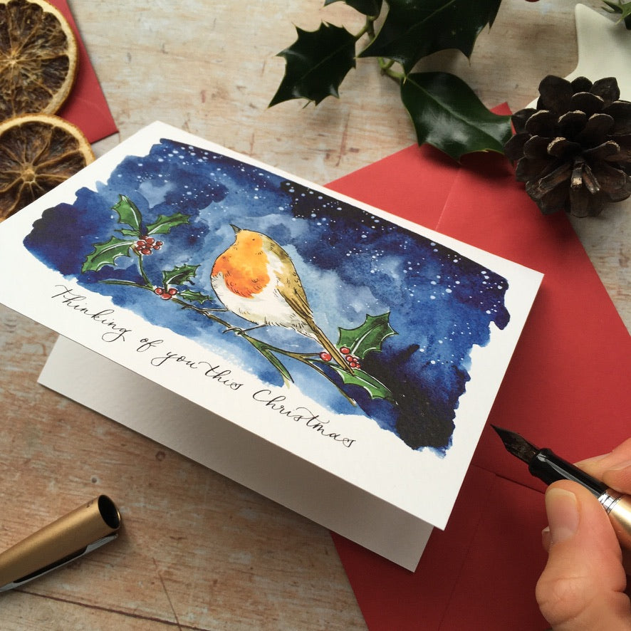 Let someone know you are thinking of them this Christmas with this beautiful robin card. The card is looking towards a snowy, starry sky whilst perched on a branch of holly. The calligraphy states ' Thinking of you this Christmas'