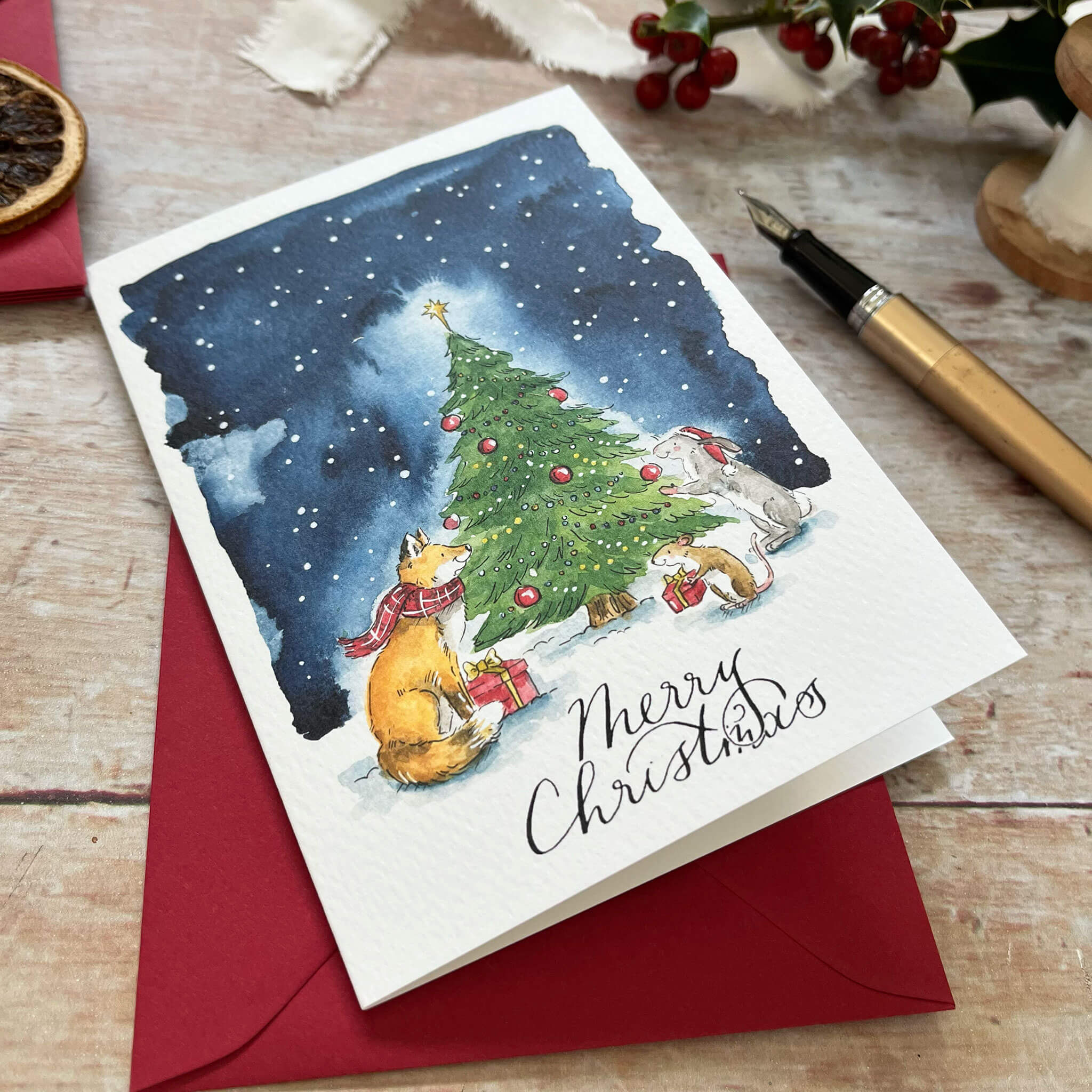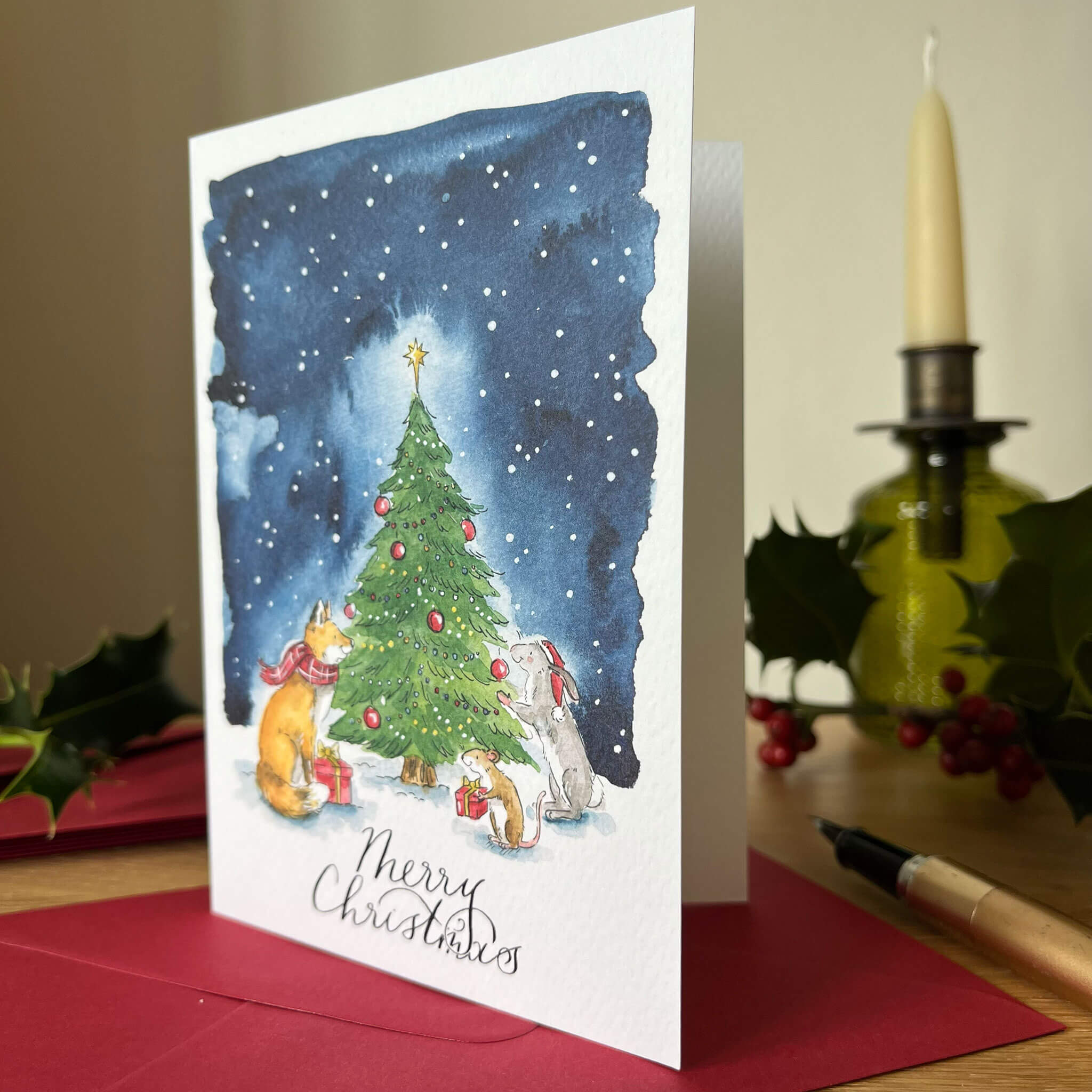 Bring the magic of togetherness to the holidays with this enchanting card design. A Christmas tree sparkles in the snow as a fox, mouse, and rabbit gather around - decorating, sharing presents, and celebrating in the warmth of friendship. Finished with a graceful “Merry Christmas” in calligraphy, this whimsical illustration is perfect for sending heartfelt festive wishes to friends and family.