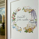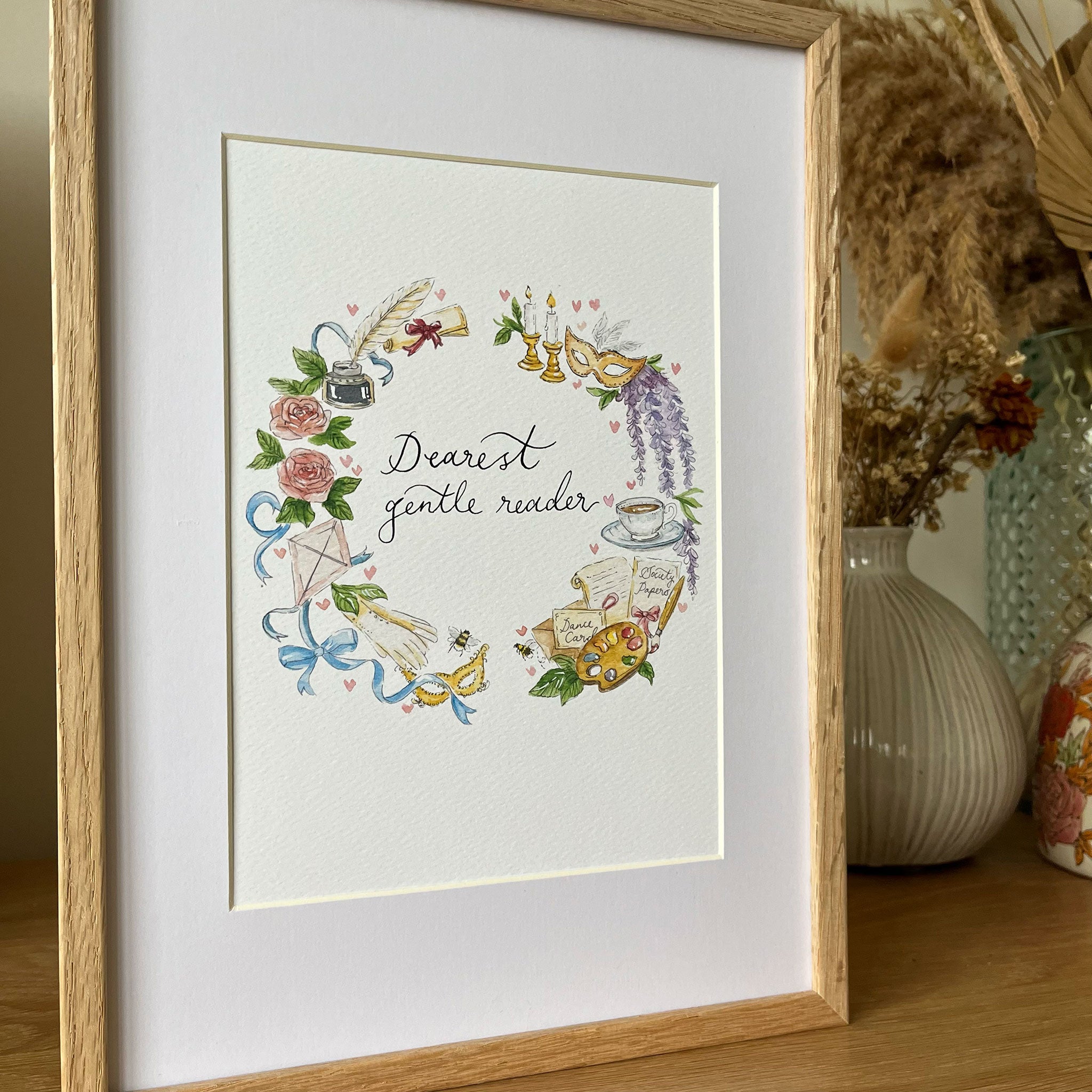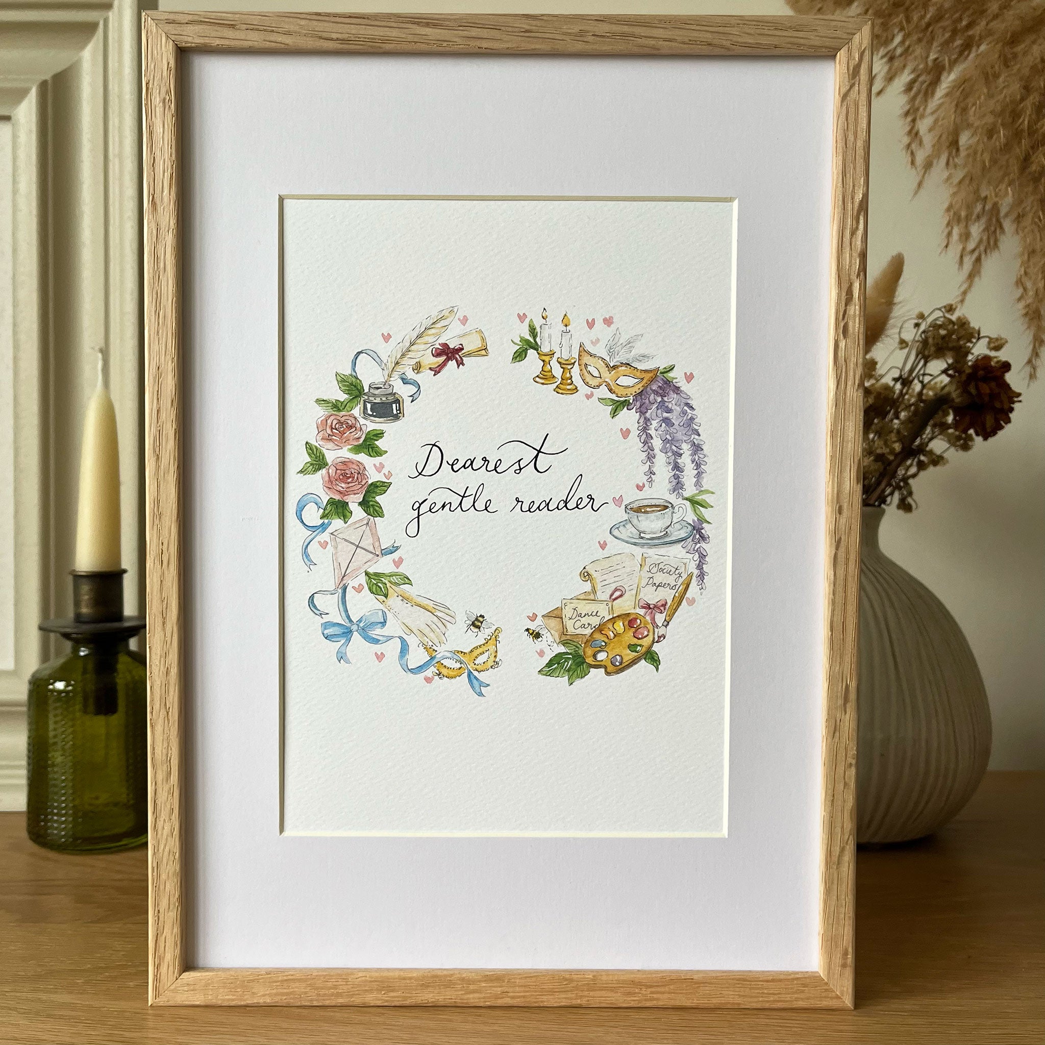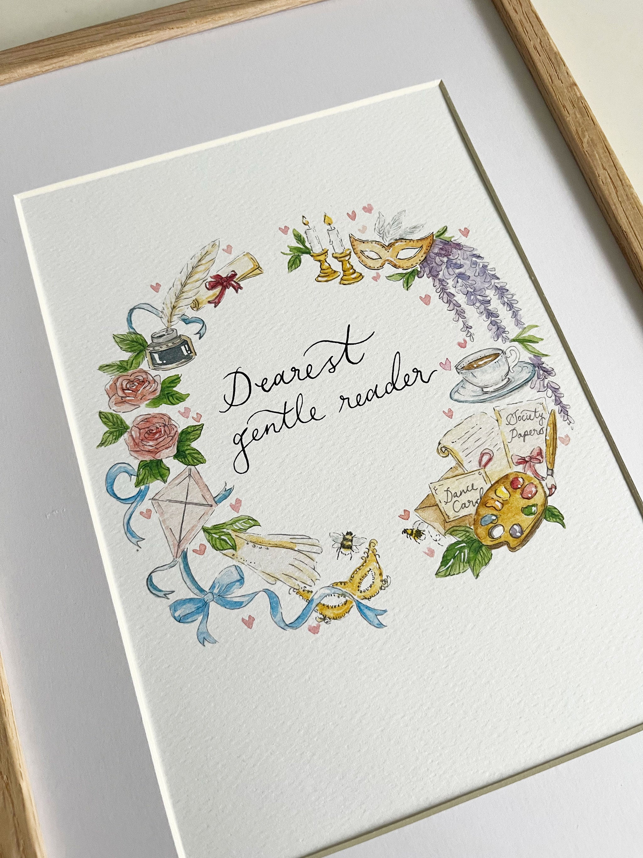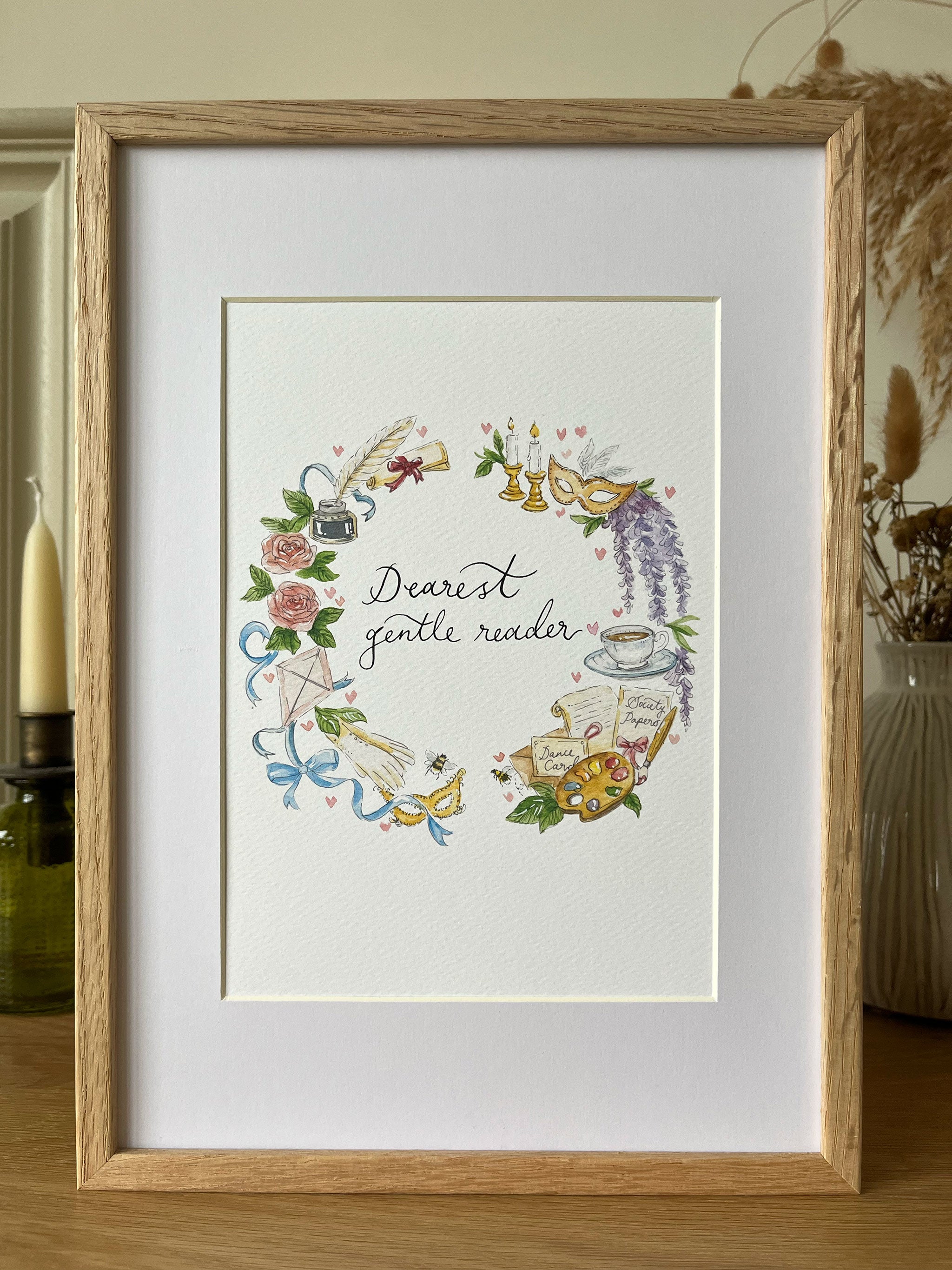 An elegant A5 size (14.8cm x 21cm) art print inspired by the romantic world of Bridgerton, featuring an illustrated wreath made up of Regency-inspired elements. Delicate details such as florals and period motifs encircle the calligraphy words “Dearest Gentle Reader” at the centre, creating a piece that feels both nostalgic and refined.