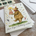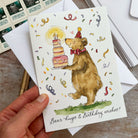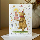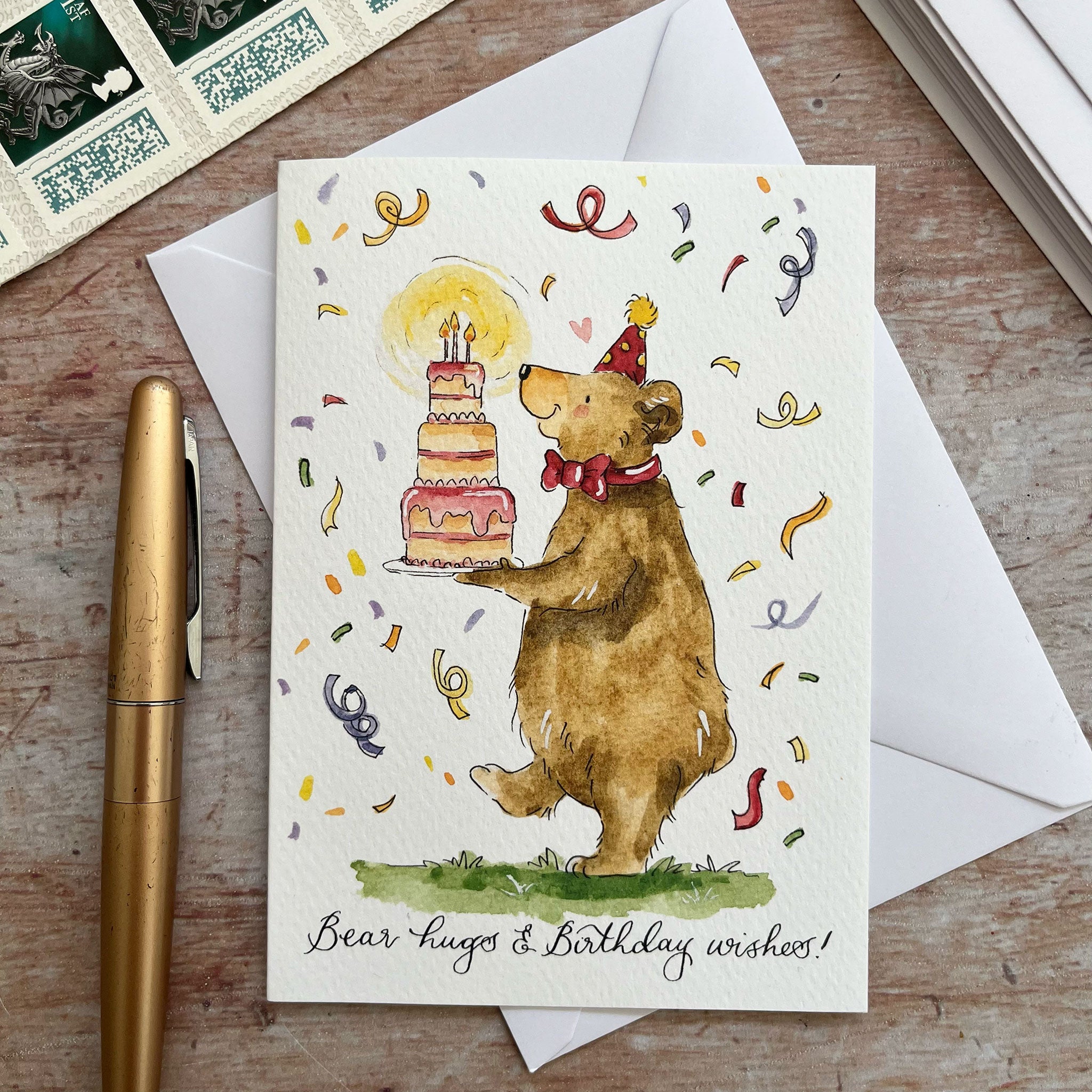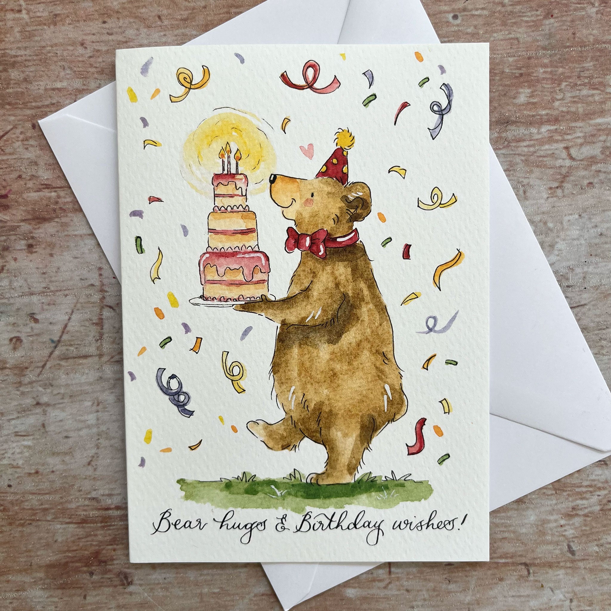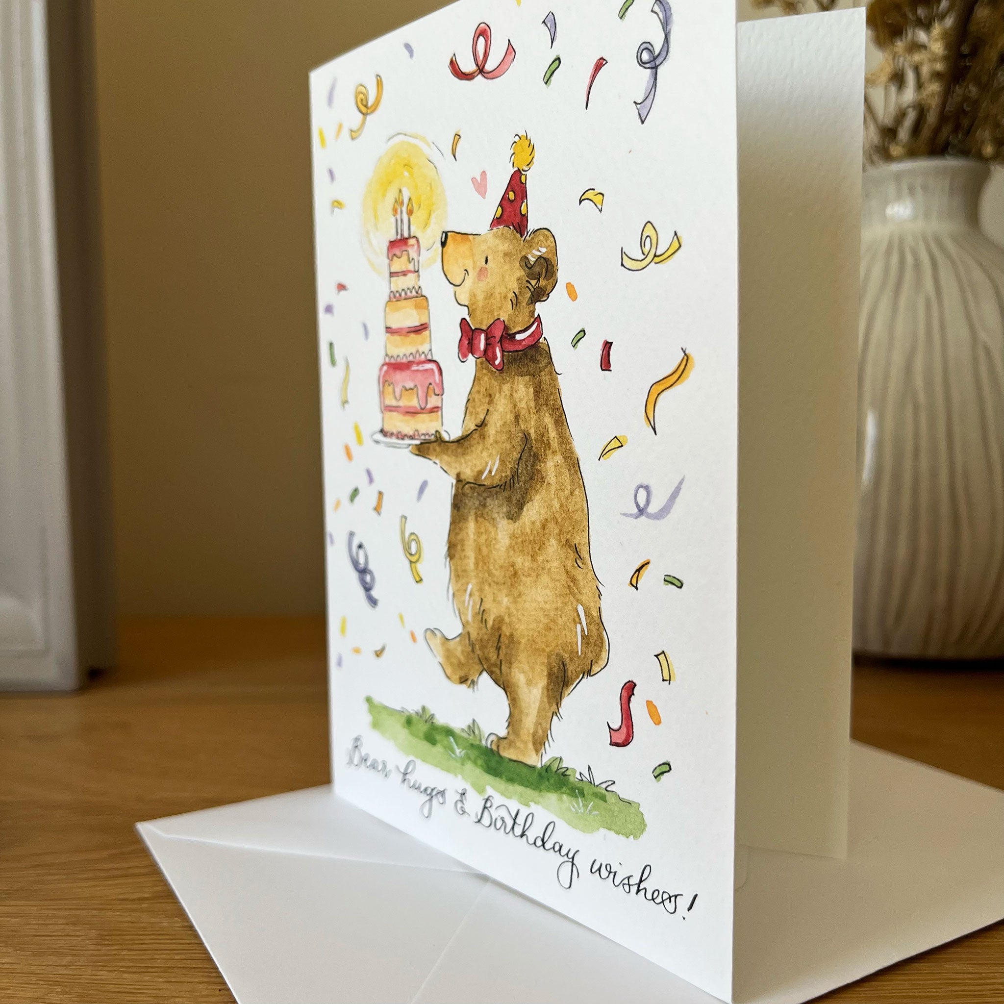 ‘Bear hugs and Birthday wishes!’ - this beautiful bear is ready for the party, with cake and confetti