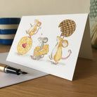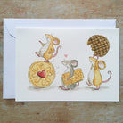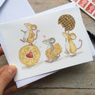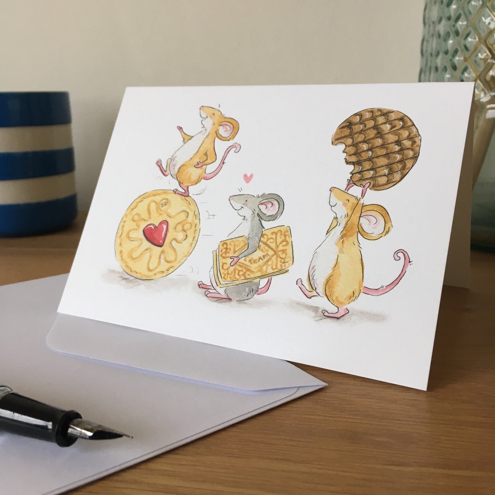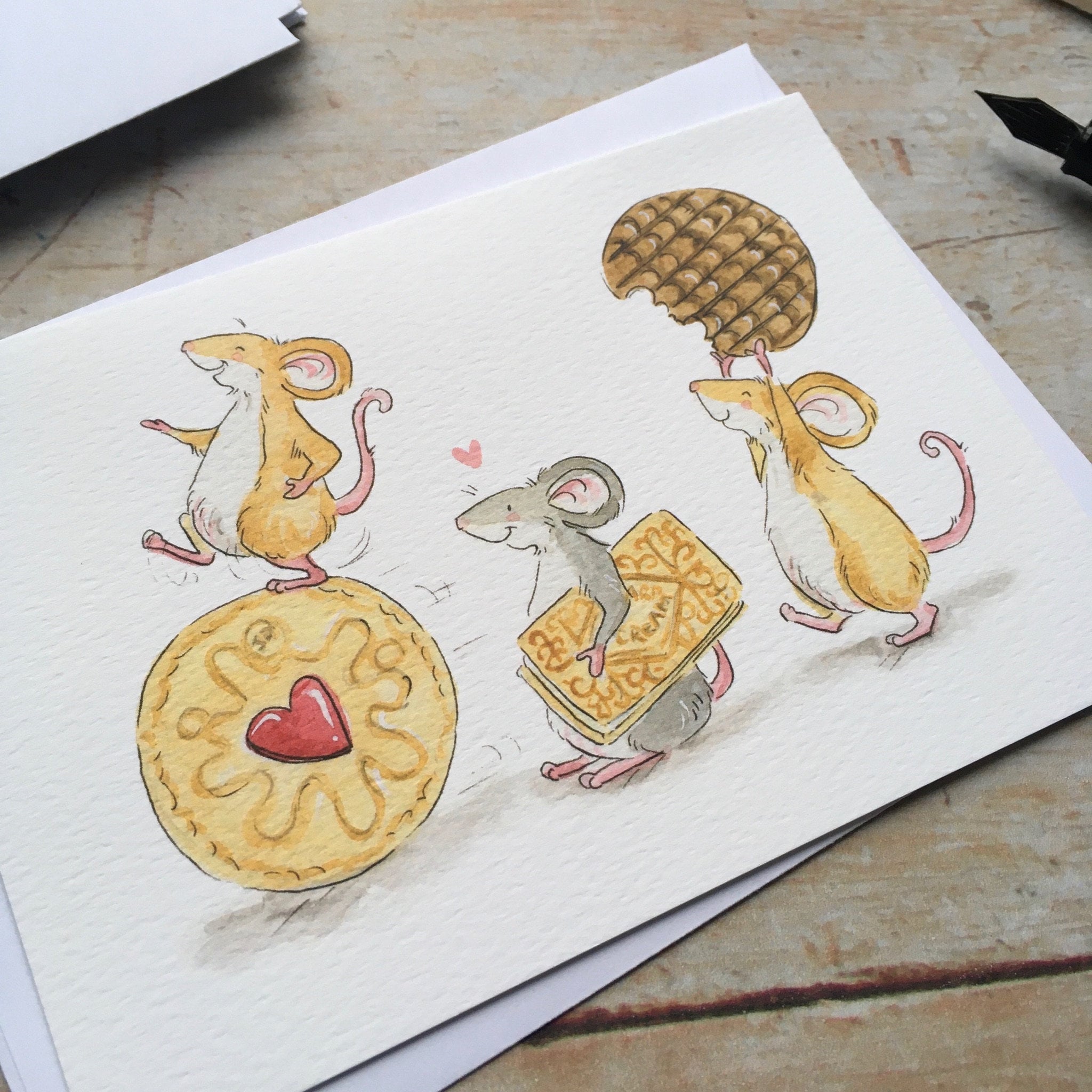 This beautiful card is perfect for that someone who loves biscuits! These three mice are enjoying different types of biscuits. One mouse is running atop of a Jammy Biscuit, the second mouse is holding a custard biscuit and then third mouse is holding a chocolate coated biscuit. Inspired by the Great British Bake off ‘biscuit week’.