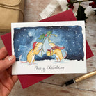 Celebrate the season with a touch of whimsy! This charming Christmas card features two delightful mice - one carrying a cheese shaped present and the other holding a sprig of mistletoe and holly. Perfect for spreading festive cheer, this illustrated card blends playful details with warm holiday spirit. Ideal for sending to friends, family, or anyone who appreciates a cozy, lighthearted design to wish 'Merry Christmas'