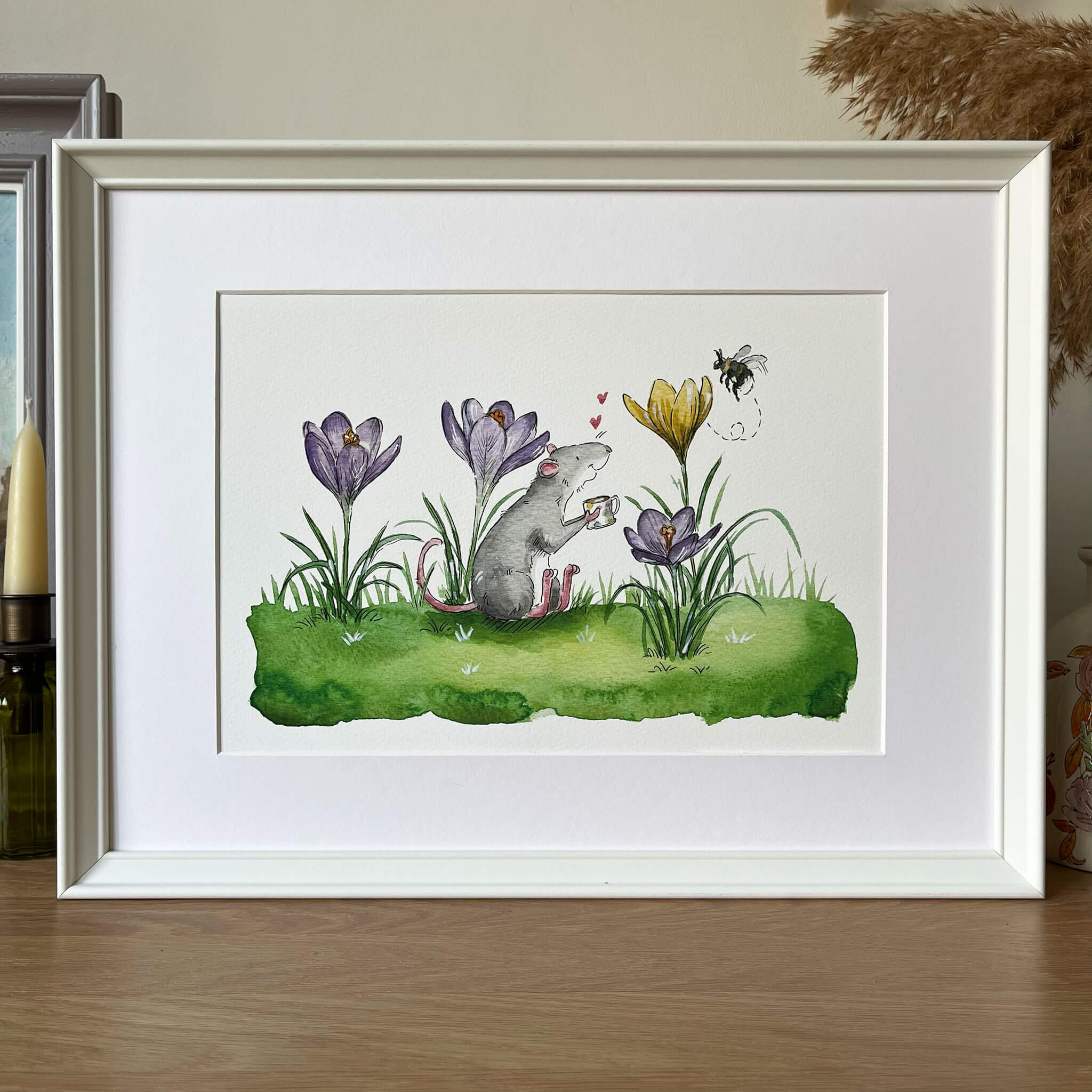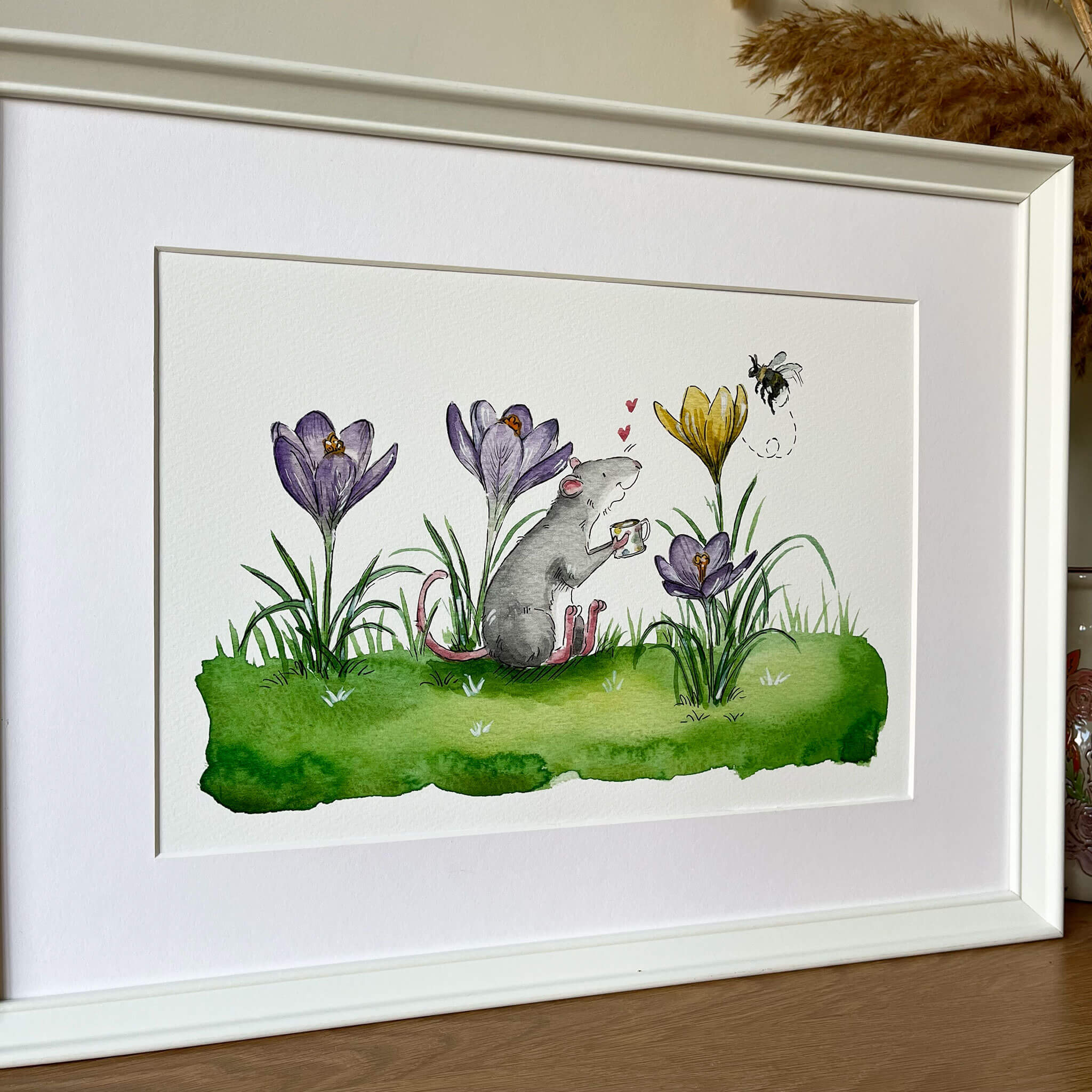 A beautiful high quality art print from the original watercolour illustration of an adorable mouse enjoying a cuppa whilst enjoying Spring crocus flowers.