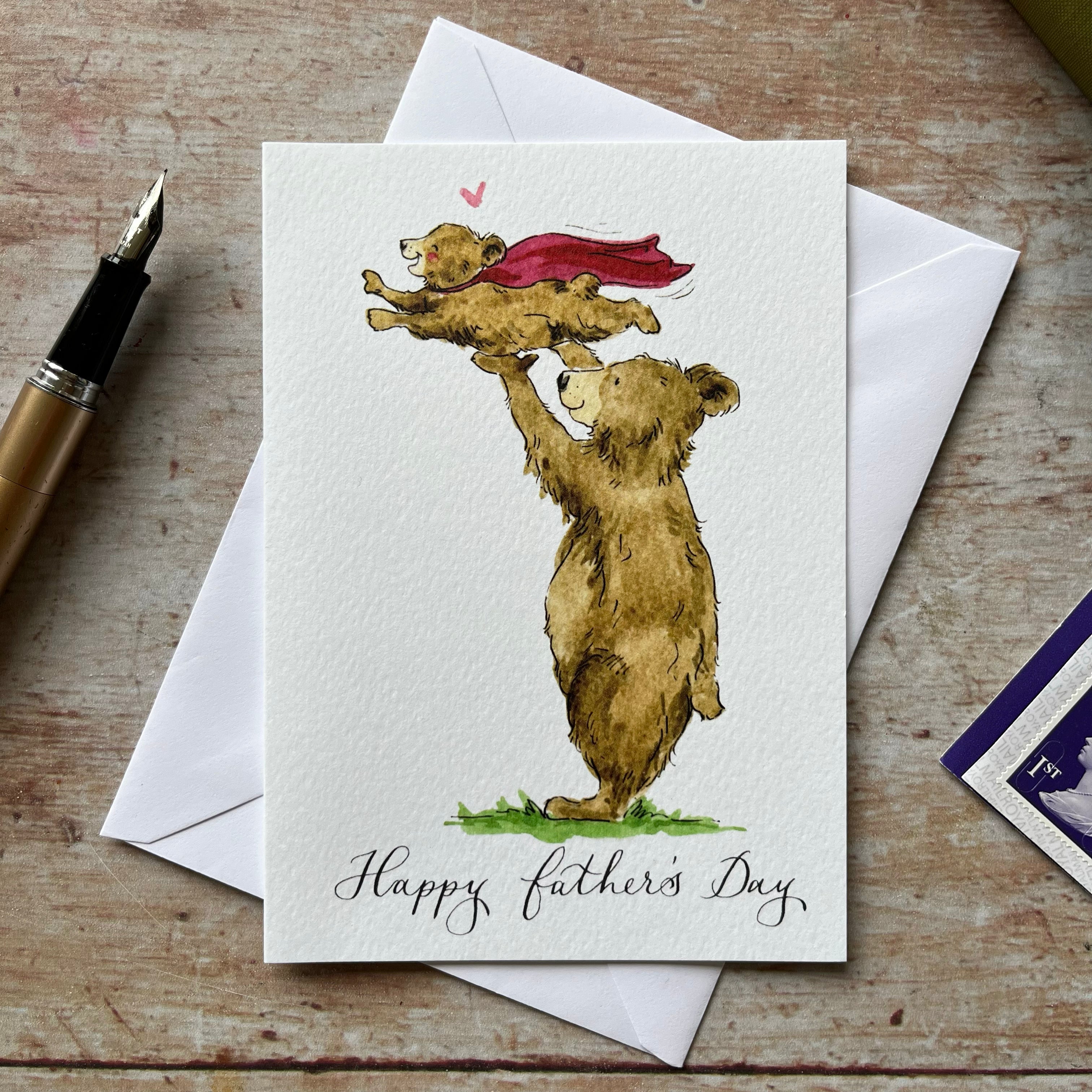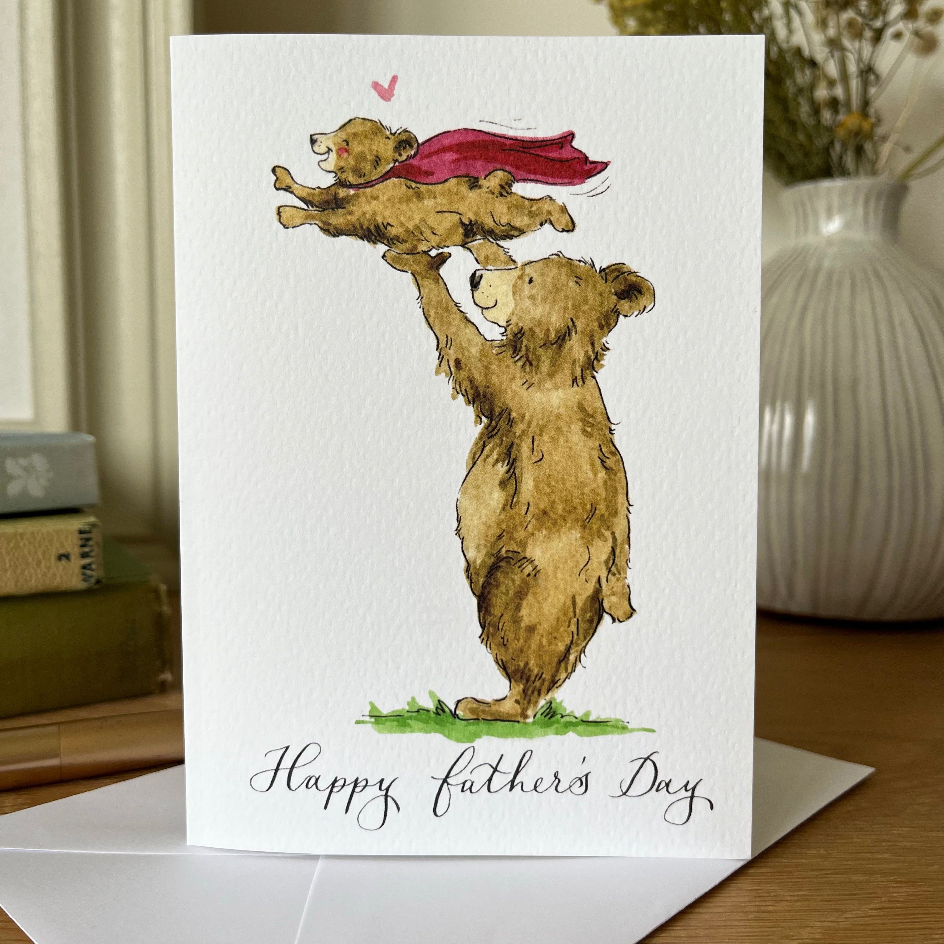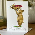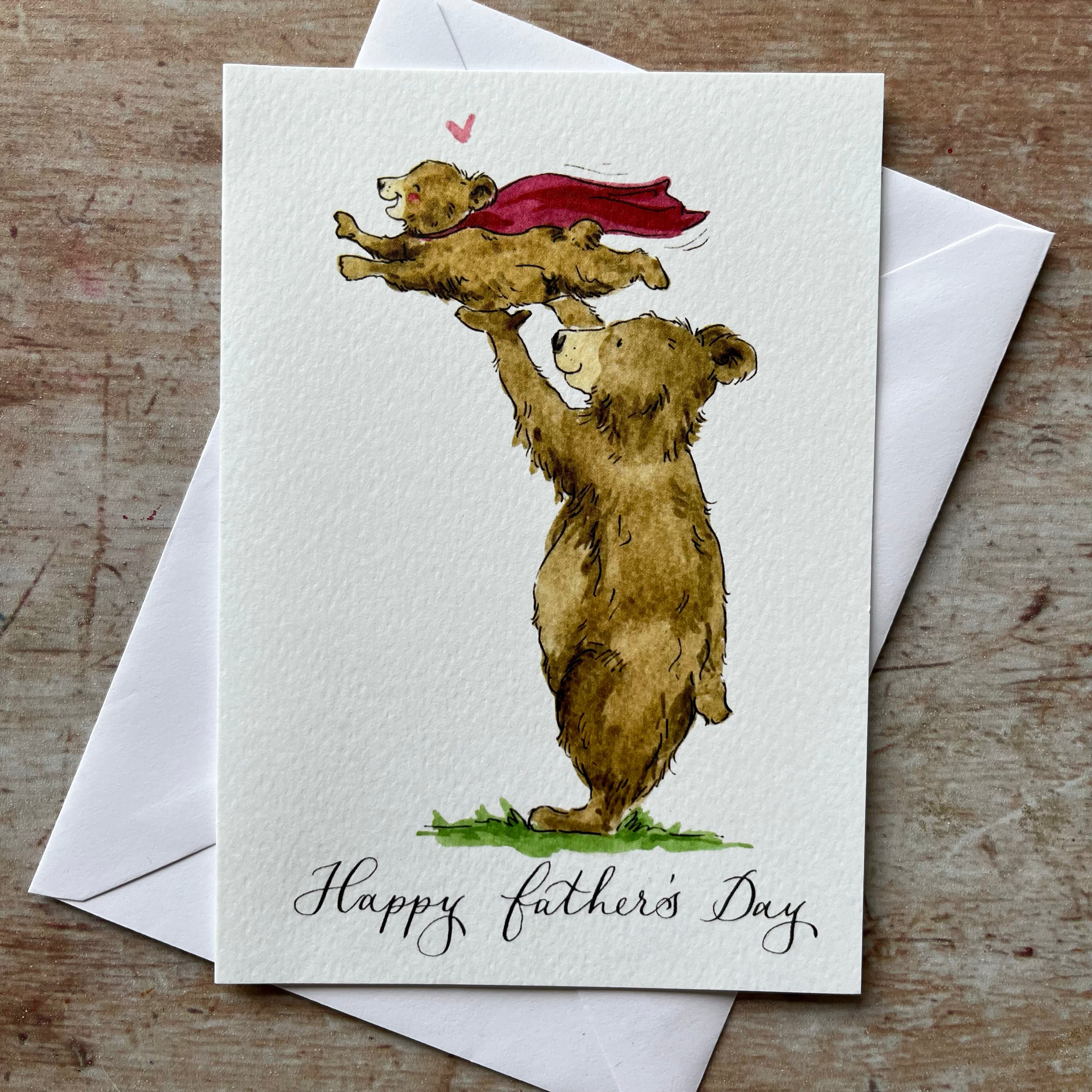 Wish that amazing dad a 'Happy Father's Day'. To the Fathers that lift their children up, this card shows a daddy bear helping his little bear cub to fly with an iconic cape.