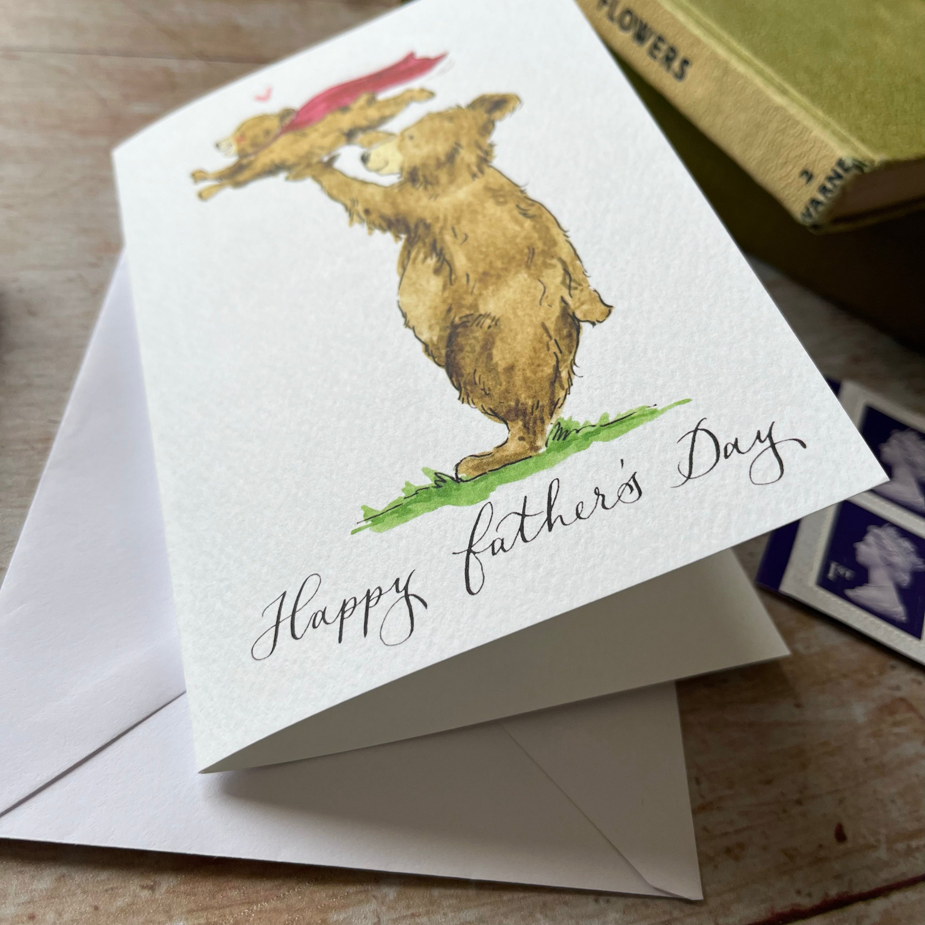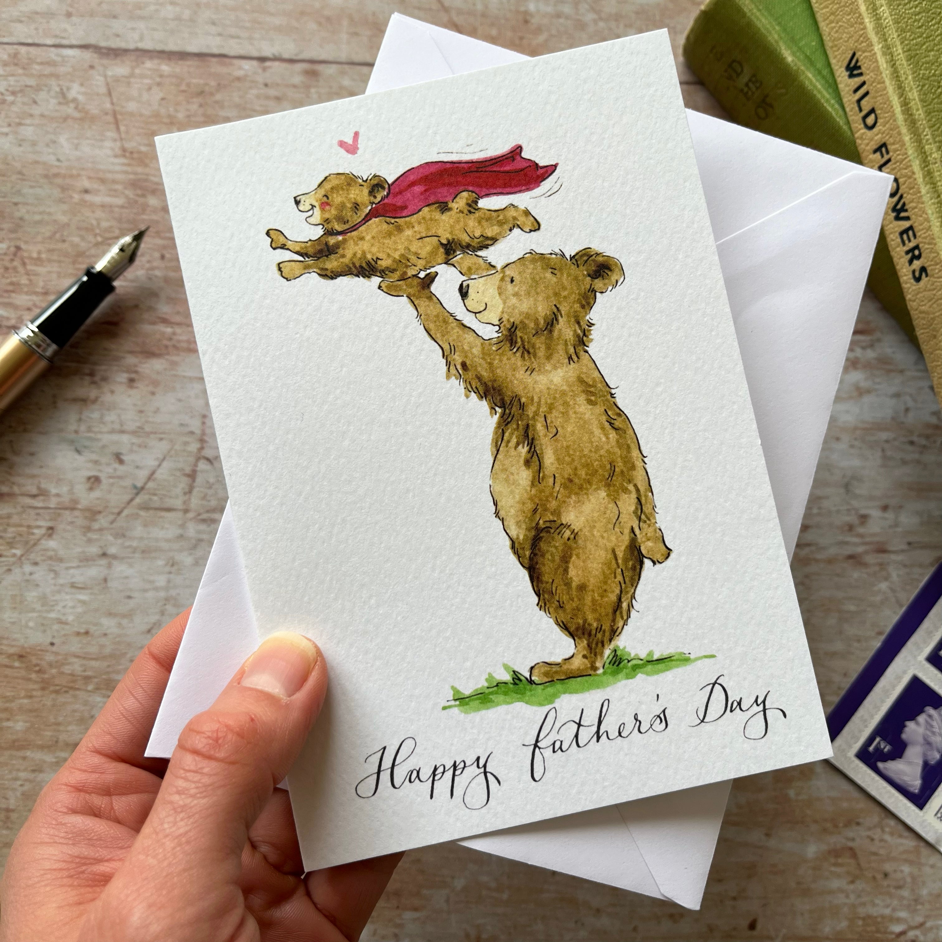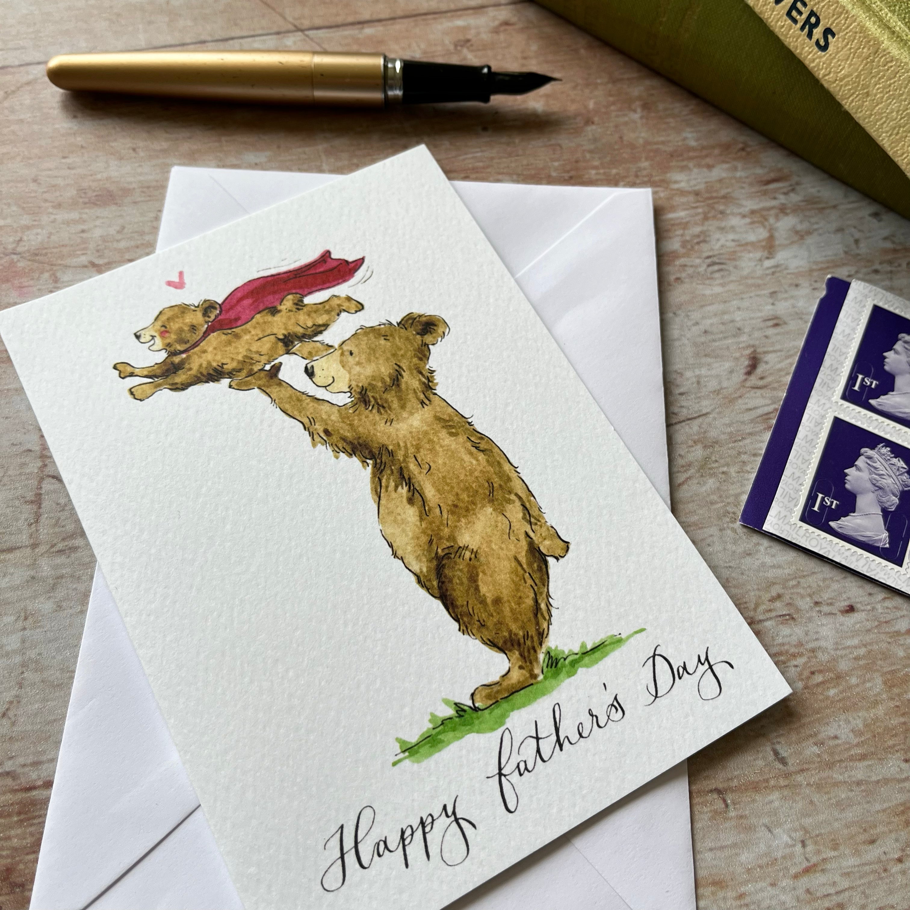 Wish that amazing dad a 'Happy Father's Day'. To the Fathers that lift their children up, this card shows a daddy bear helping his little bear cub to fly with an iconic cape.