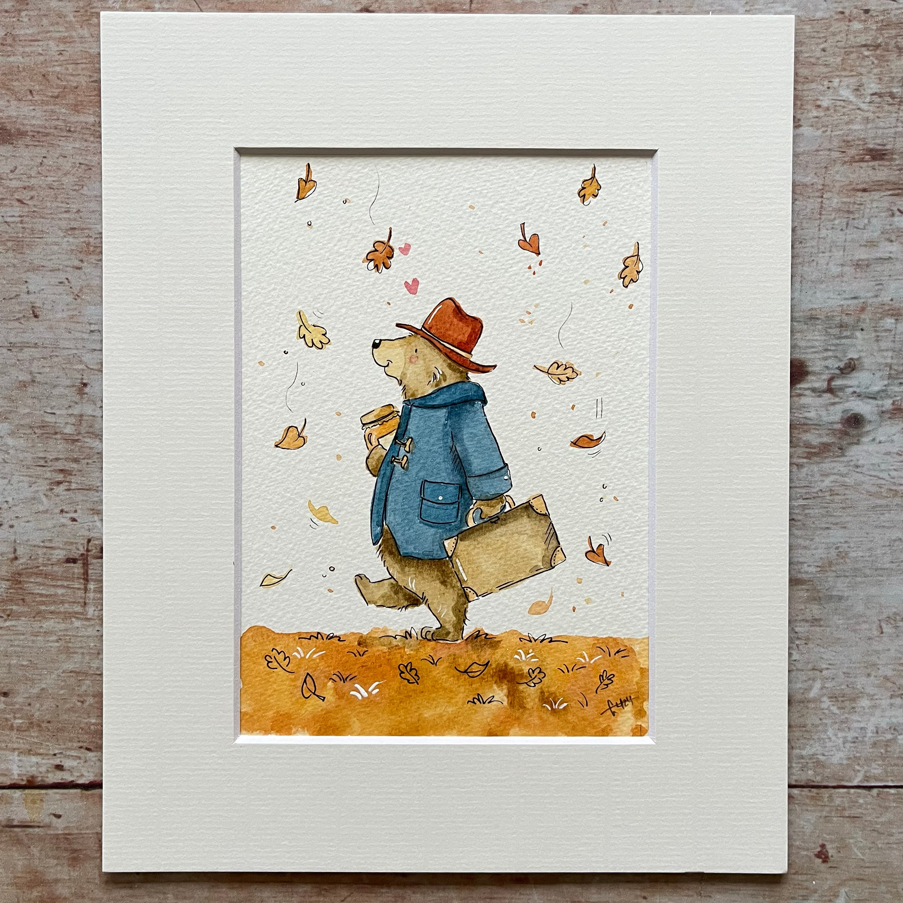 An original watercolour illustration of the nation's favourite bear! This watercolour illustration is one of a kind and shows our favourite marmalade loving bear on an Autumnal walk. One of a kind as the original artwork.
