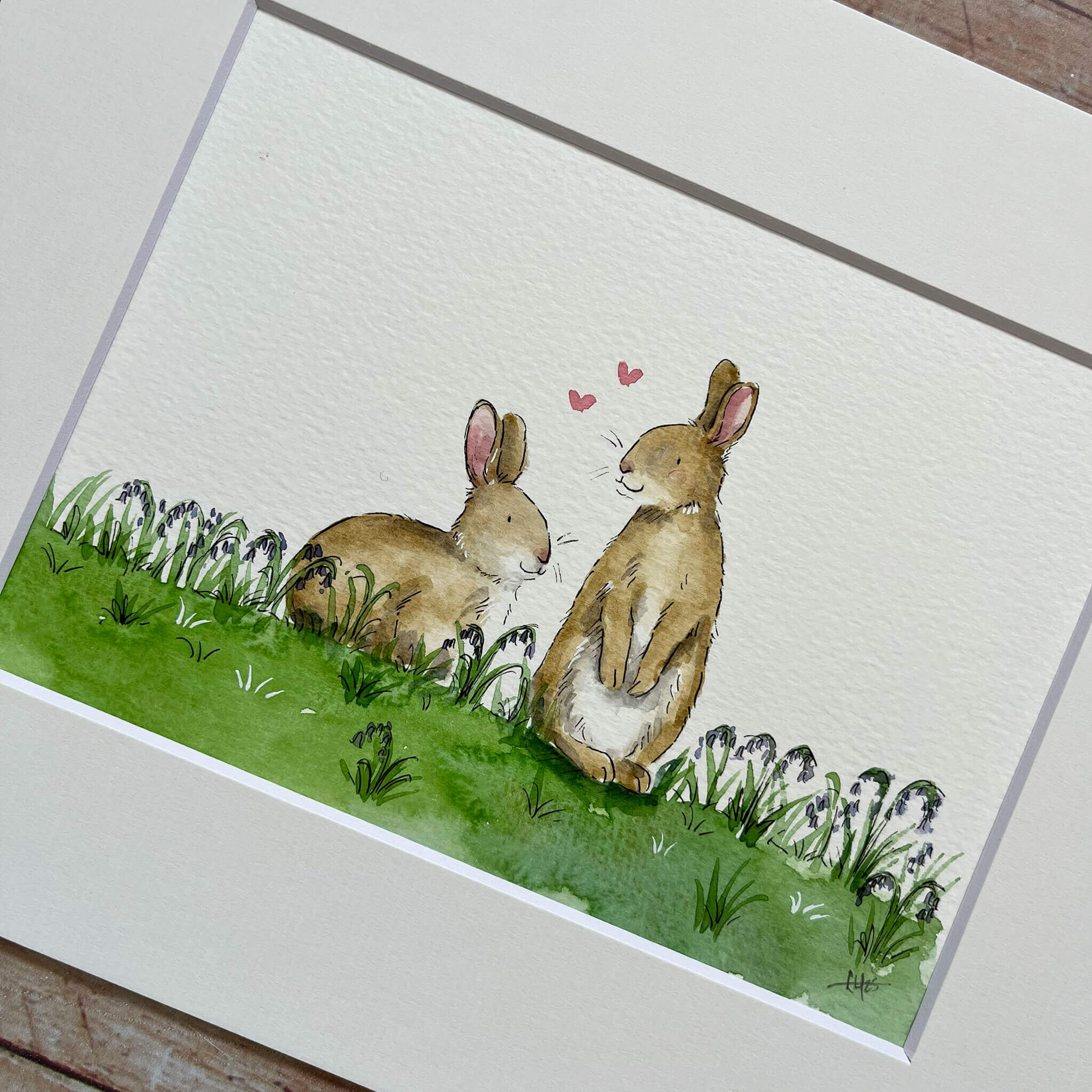 An original watercolour illustration of 'Belle and Bennett' the bunnies. These two adorable bunnies are enjoying the Spring weather amongst a field of bluebells. This watercolour illustration is one of a kind as the original.