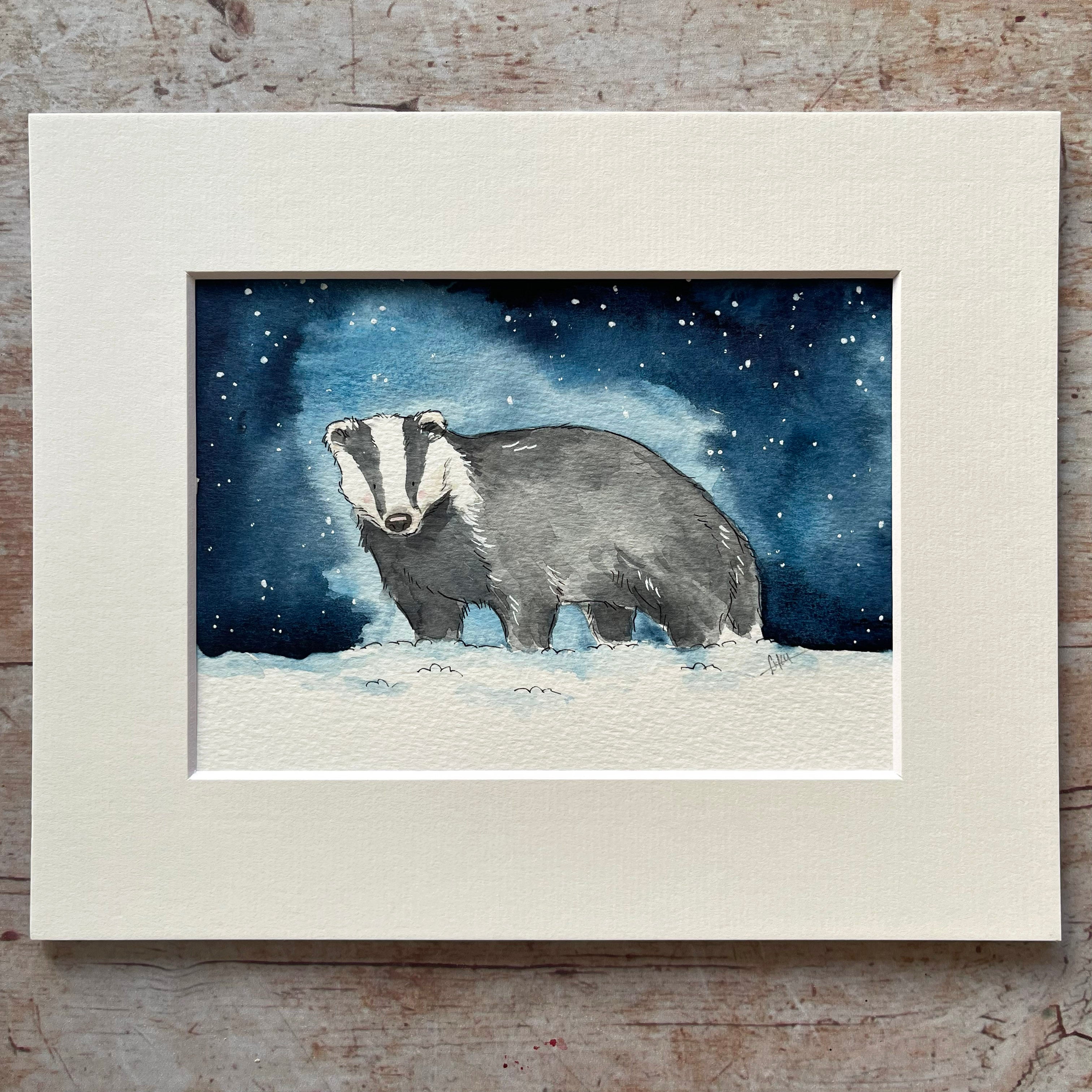 An original watercolour illustration of 'Bernie' the badger. This watercolour illustration is one of a kind and shows a handsome badger enjoying the snow.