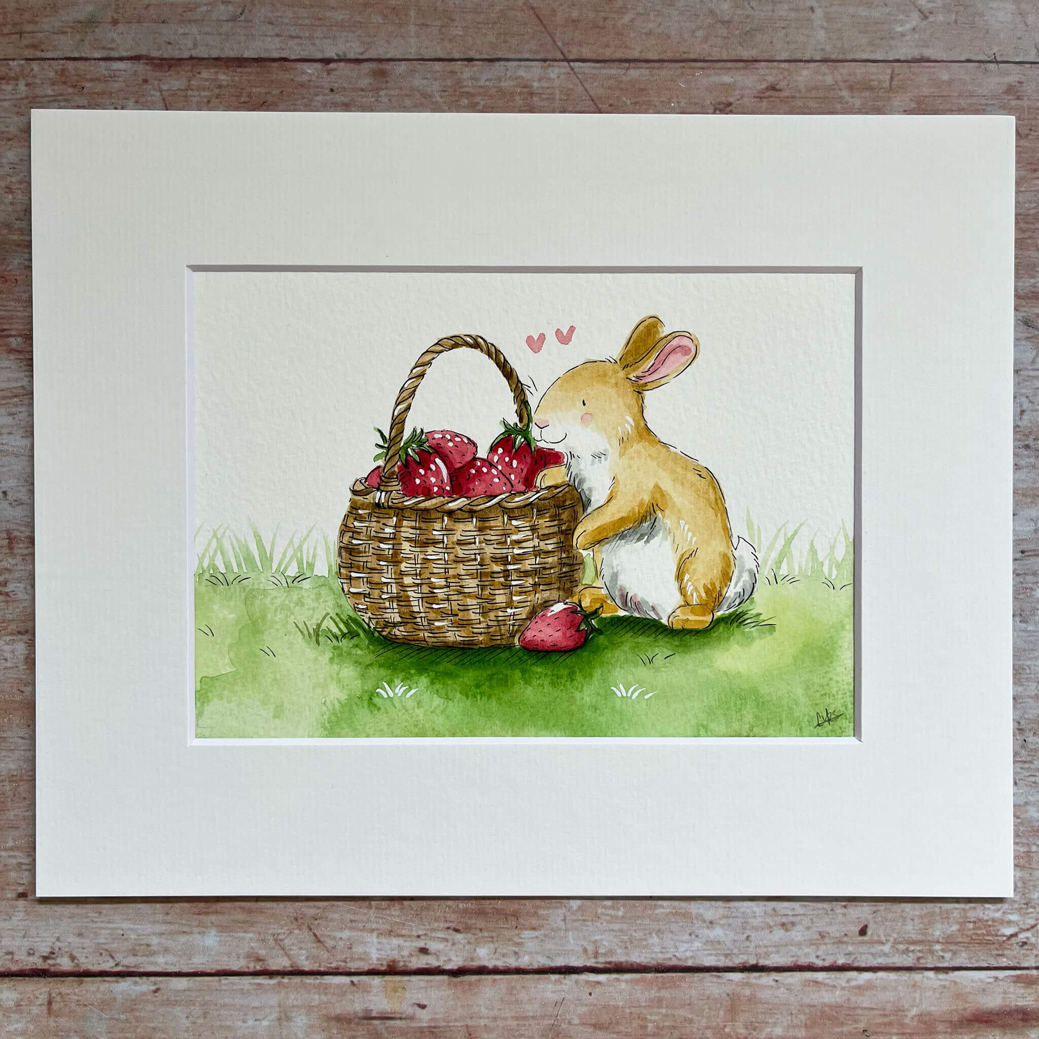 An original watercolour illustration of 'Blossom' the bunny. This watercolour illustration is one of a kind and shows a beautiful golden bunny enjoying the seasons harvest of strawberries.