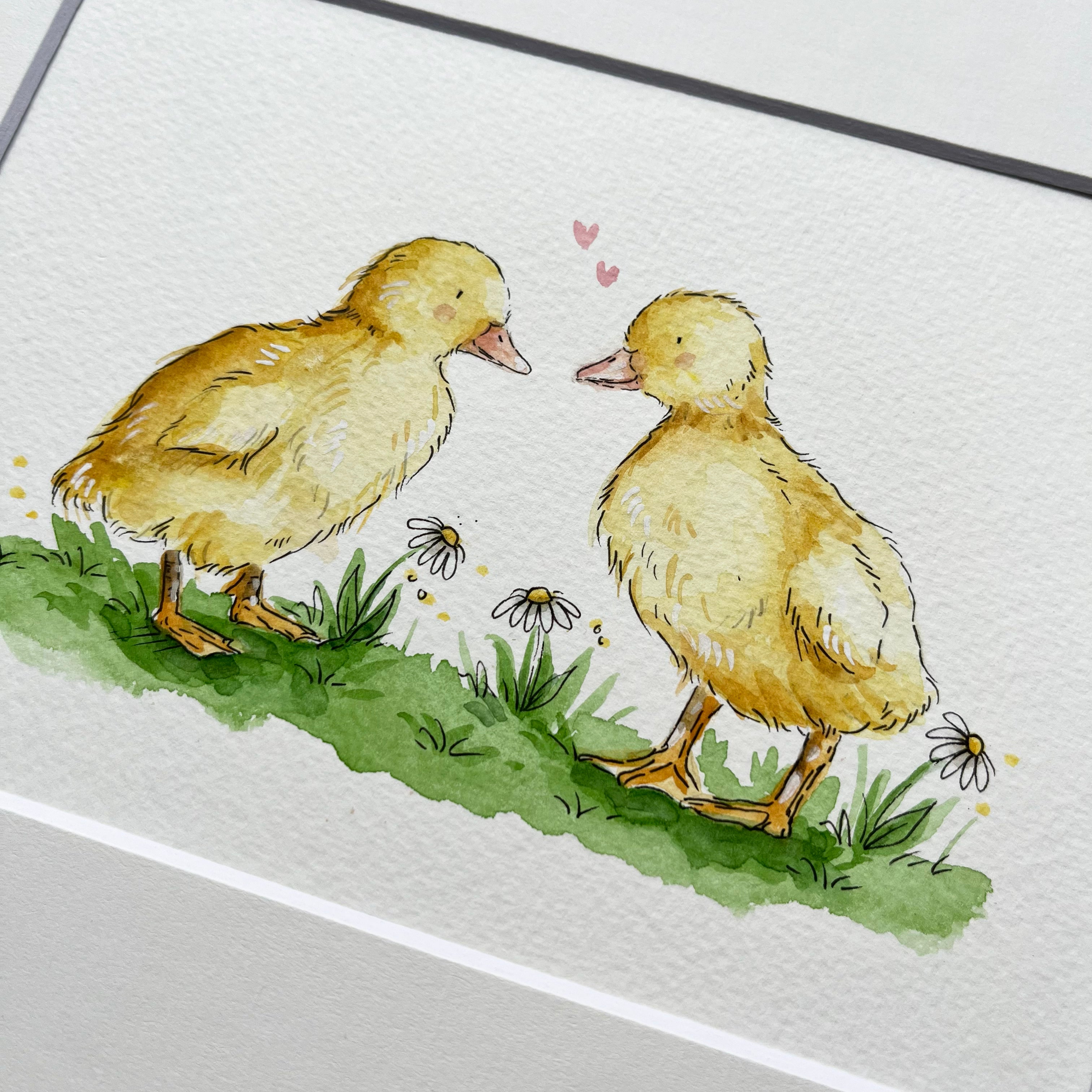 An original watercolour illustration of 'Daphne and Donnie' the ducklings. This watercolour illustration is one of a kind and shows 2 lovely ducklings ready for Spring. One of a kind as the original artwork.