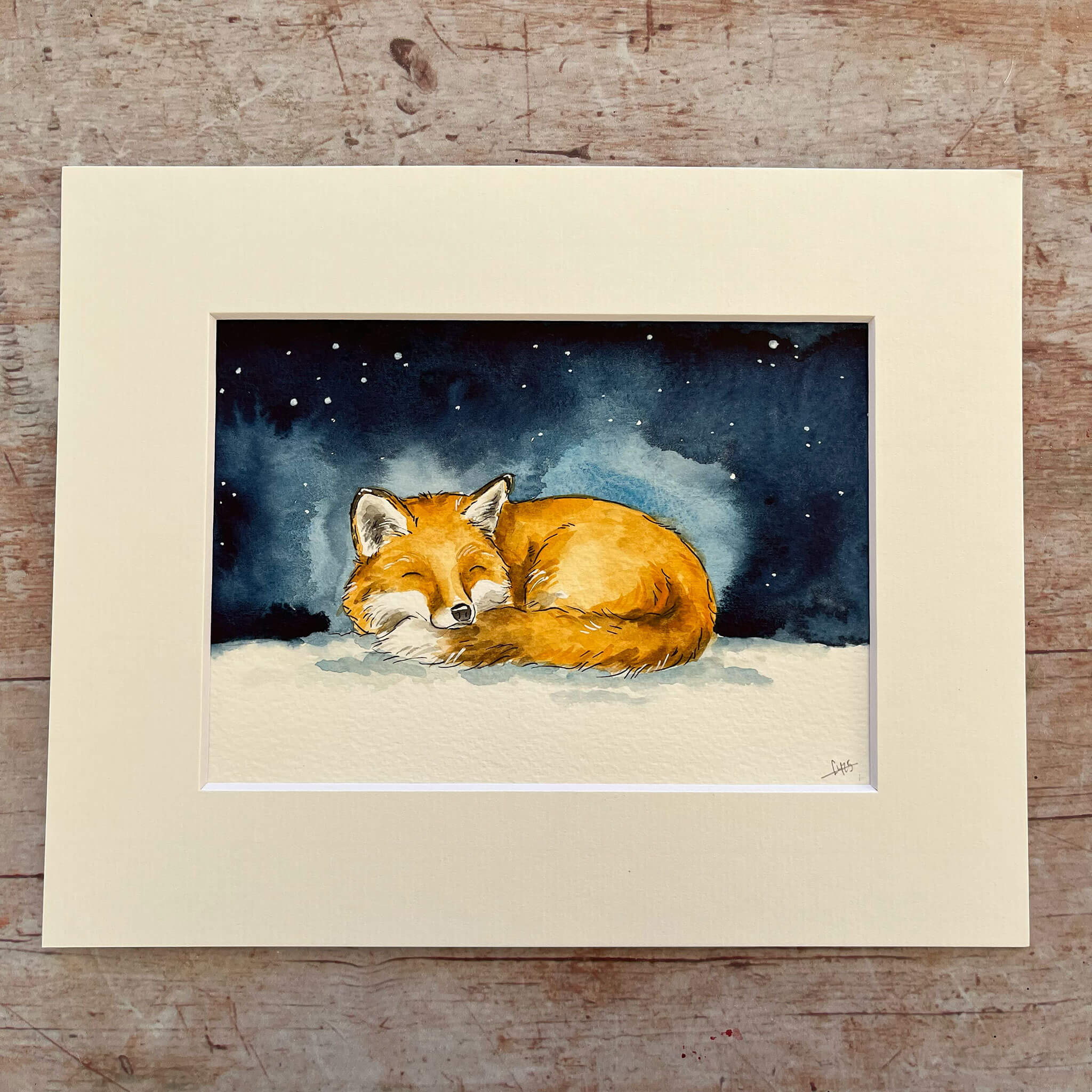 An original watercolour illustration of 'Forrest the winter fox. This watercolour illustration is one of a kind and shows a beautiful fox sleeping in the snow.