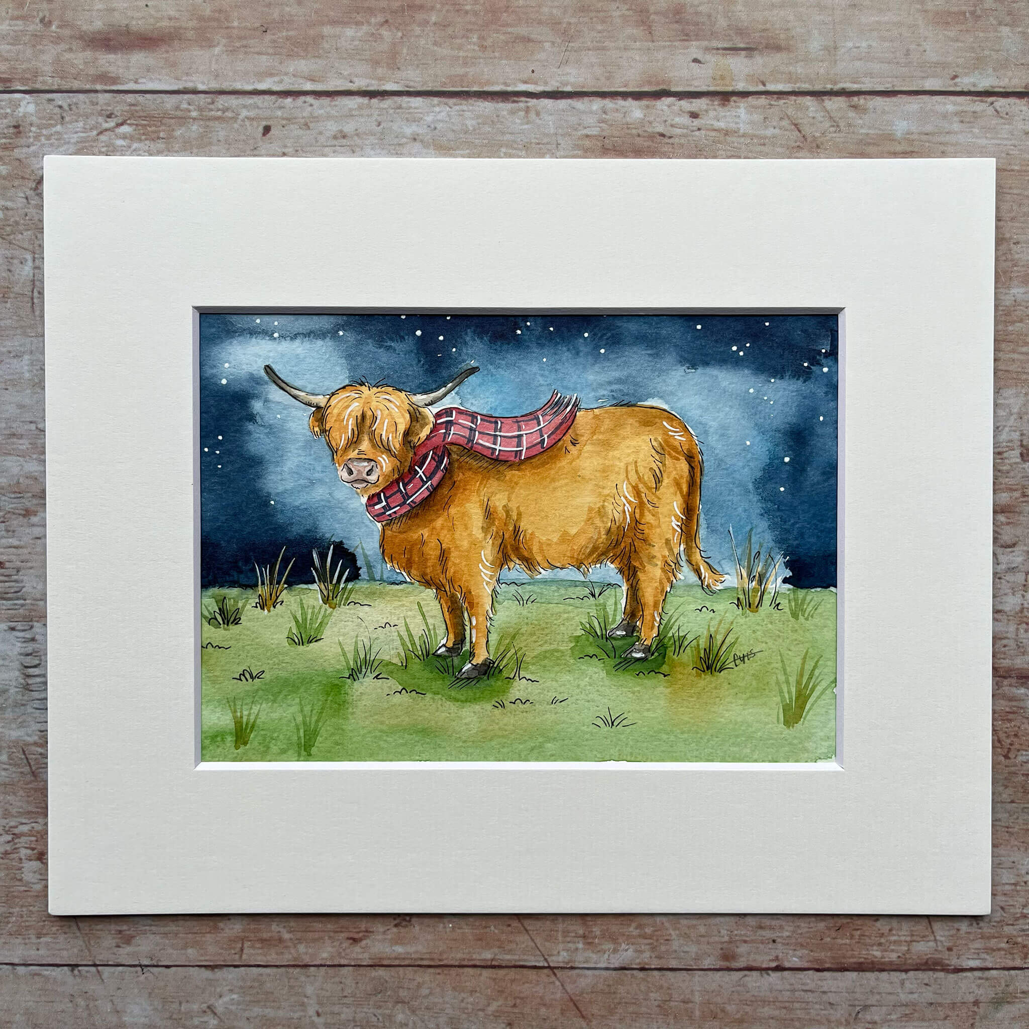 An original watercolour illustration of 'Hamish' the Highland Cow. This artwork was inspired by the beauty in winter and shows a handsome highland cow wrapped up in a scarf against the Scottish winter. This watercolour illustration is one of a kind.