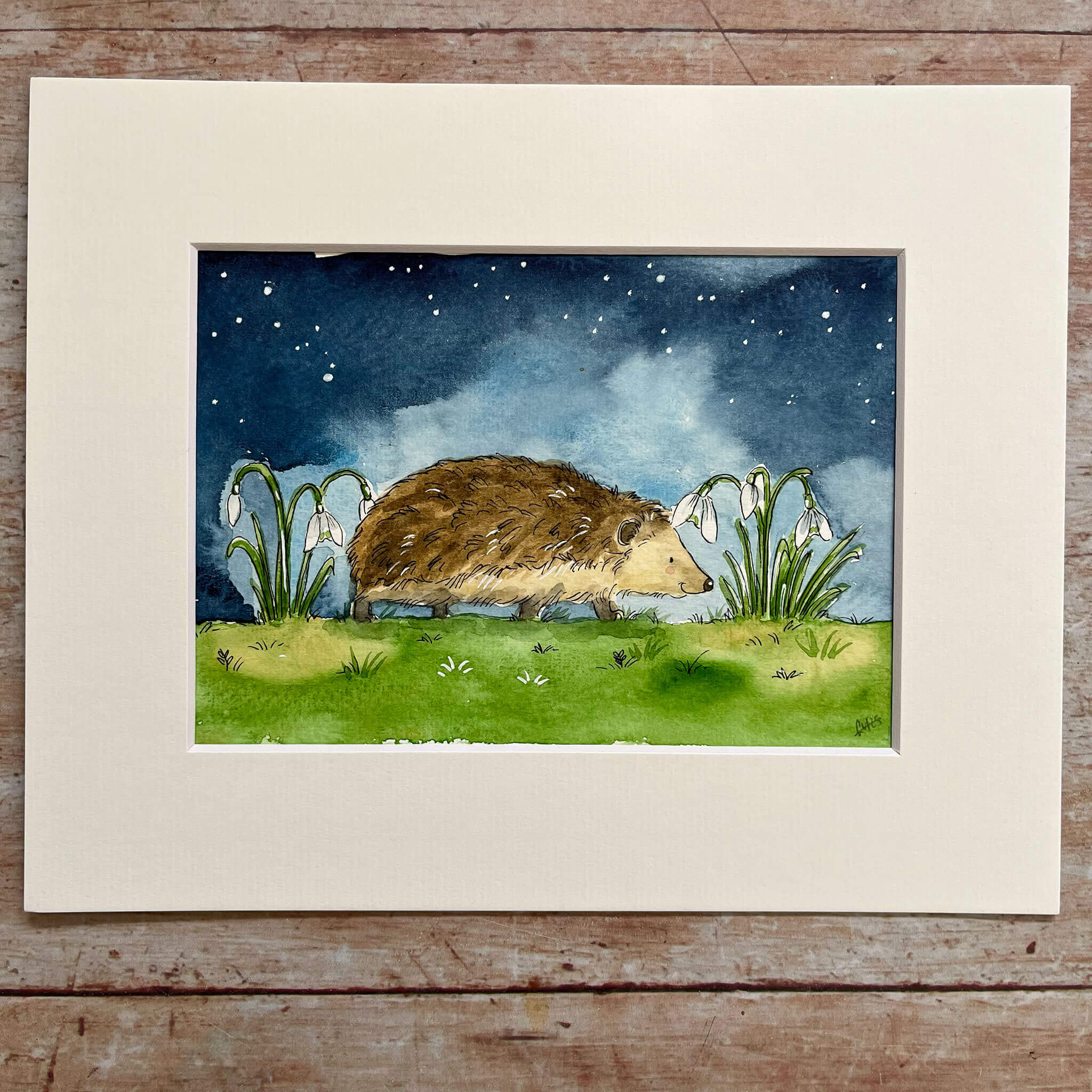An original watercolour illustration of 'Harmony' the hedgehog. This artwork was inspired by the beauty in winter and shows a beautiful hedgehog exploring between snowdrops under a starry night sky. This watercolour illustration is one of a kind.
