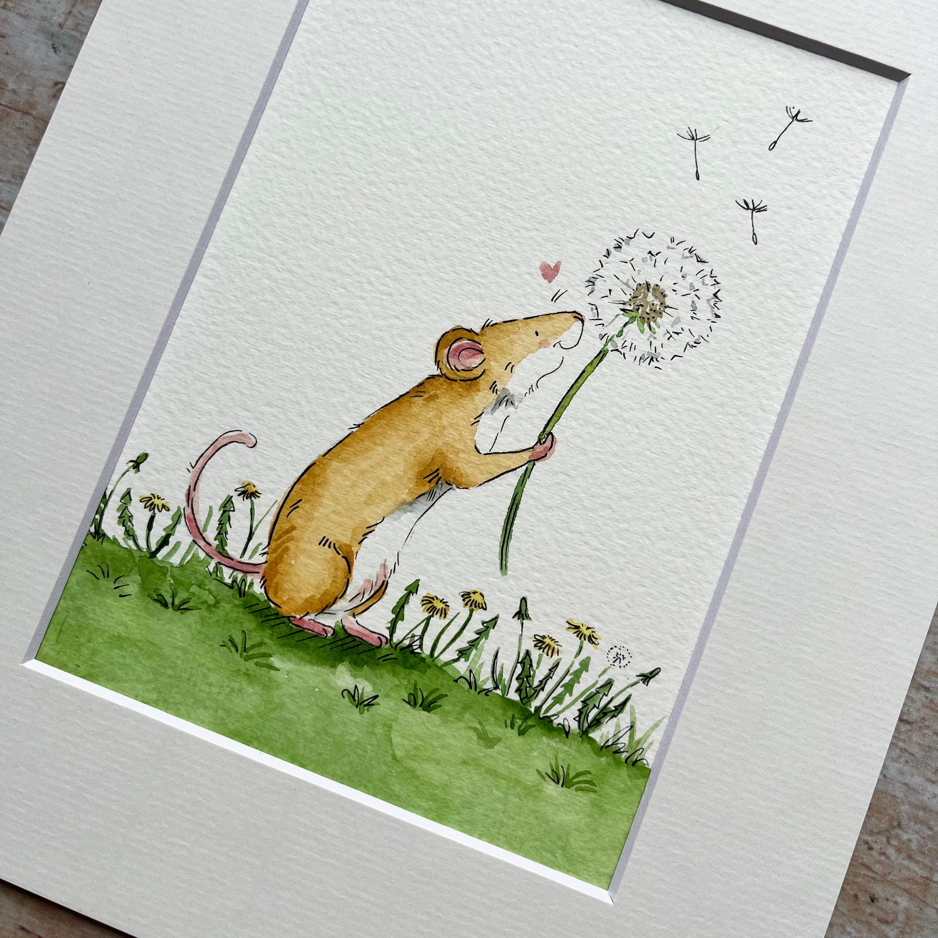 An original watercolour illustration of 'Molly' the mouse. This watercolour illustration is one of a kind and shows a beautiful mouse bird making a wish with a dandelion clock. One of a kind as the original artwork.
