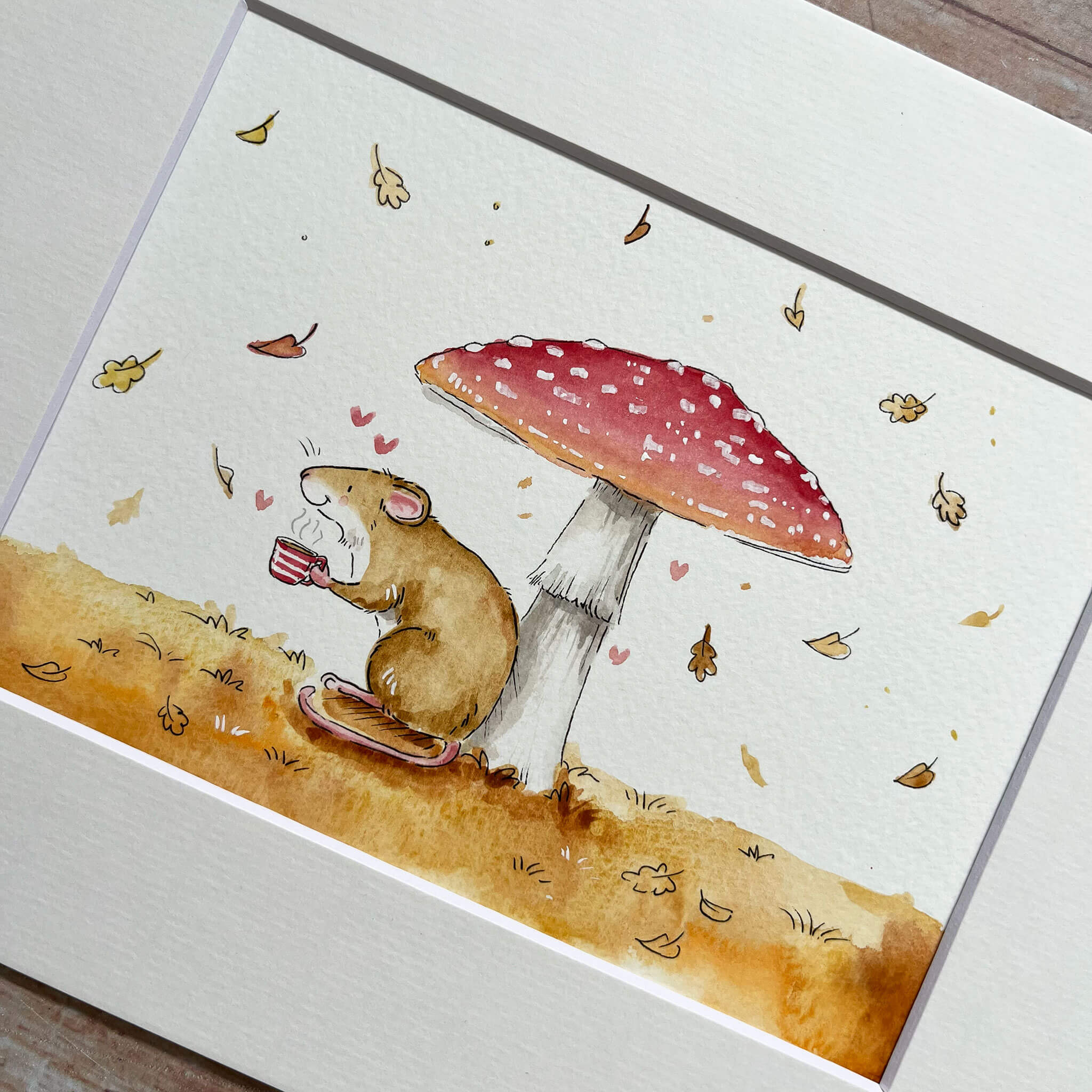 An original watercolour illustration of 'Marigold' the mouse. This watercolour illustration is one of a kind and shows a lovely little mouse enjoying a warming hot drink under a toadstool. Inspired by Autumn and the transition into cosy season.