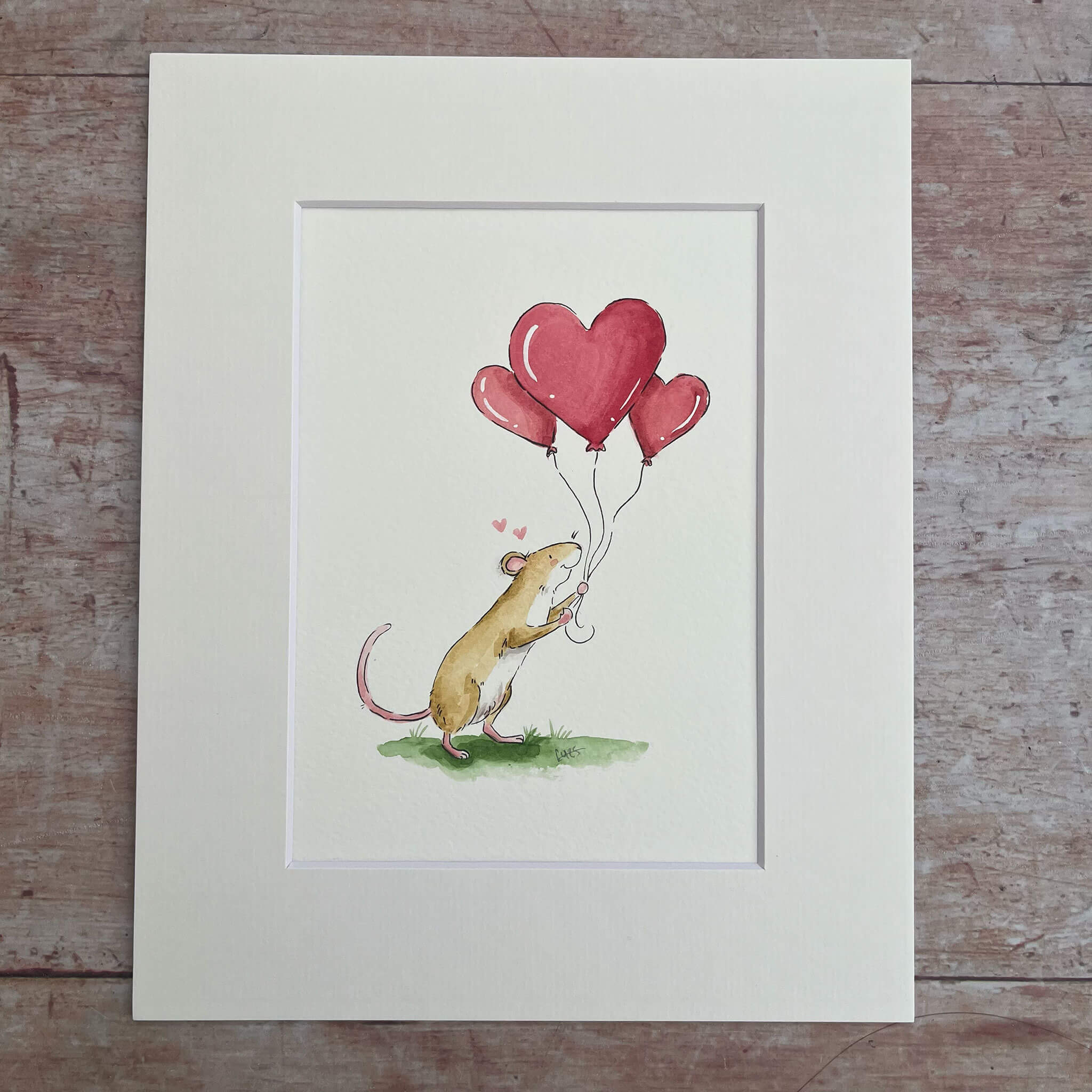 An original watercolour illustration of 'Mira' the Mouse. Named 'Mira' meaning admirable and peace. This watercolour illustration is one of a kind and features a sweet little mouse holding heart balloons, a gentle reminder to celebrate love and kindness. Perfect for bringing warmth to your home or as a thoughtful gift, this piece is painted with delicate detail and filled with character. A unique artwork to treasure, celebrating self-love, encouragement, and the simple joys of life. One of a kind as the original artwork.