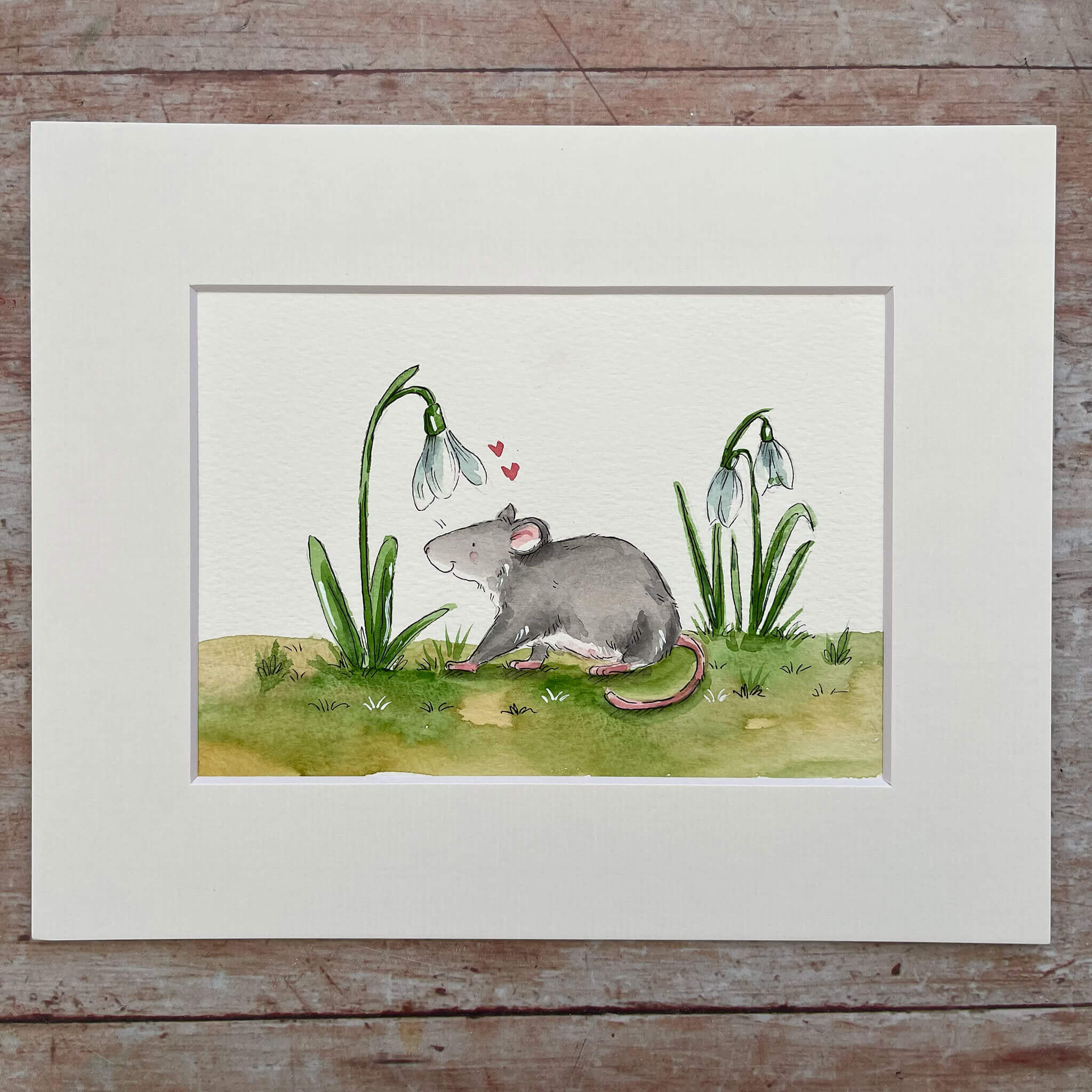 An original watercolour illustration of 'Morris' the Mouse. This artwork was inspired by the beautiful snowdrops that are in season. Named after William Morris who loved capturing snowdrops in prints. This watercolour illustration is one of a kind.