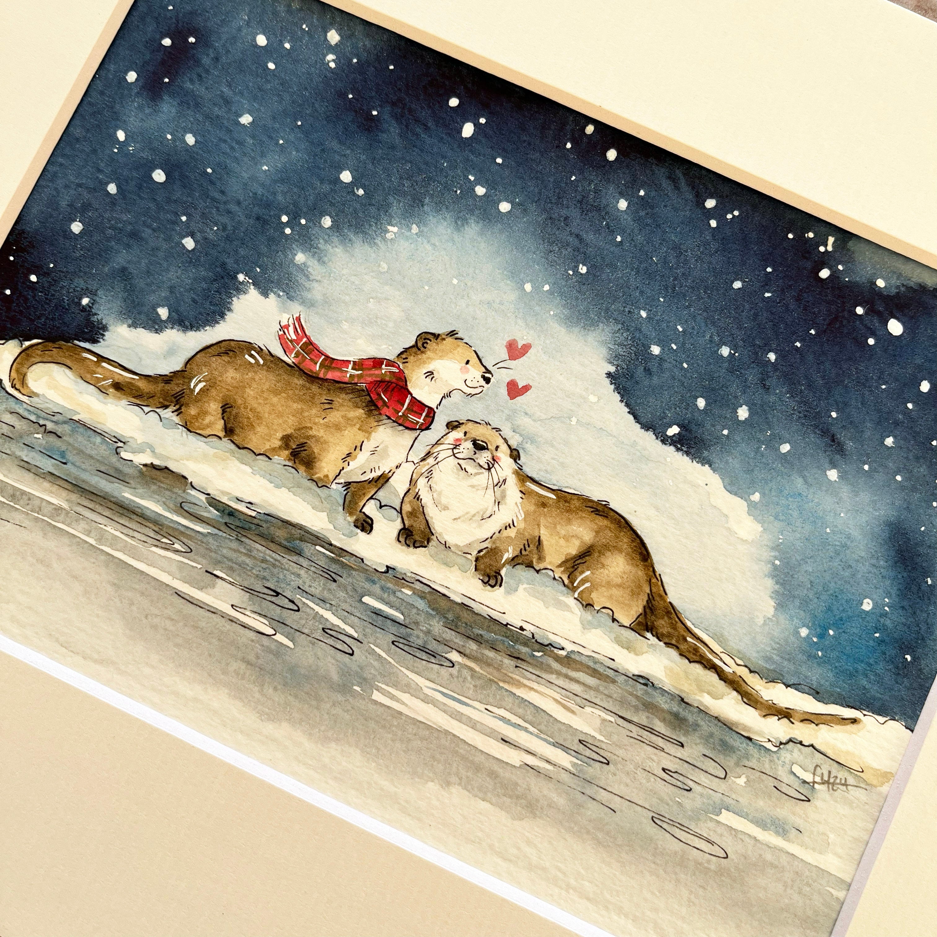An original watercolour illustration of 'Orion and Octavia' the winter otters. This watercolour illustration is one of a kind and shows a beautiful pair of otters playing in the snow.