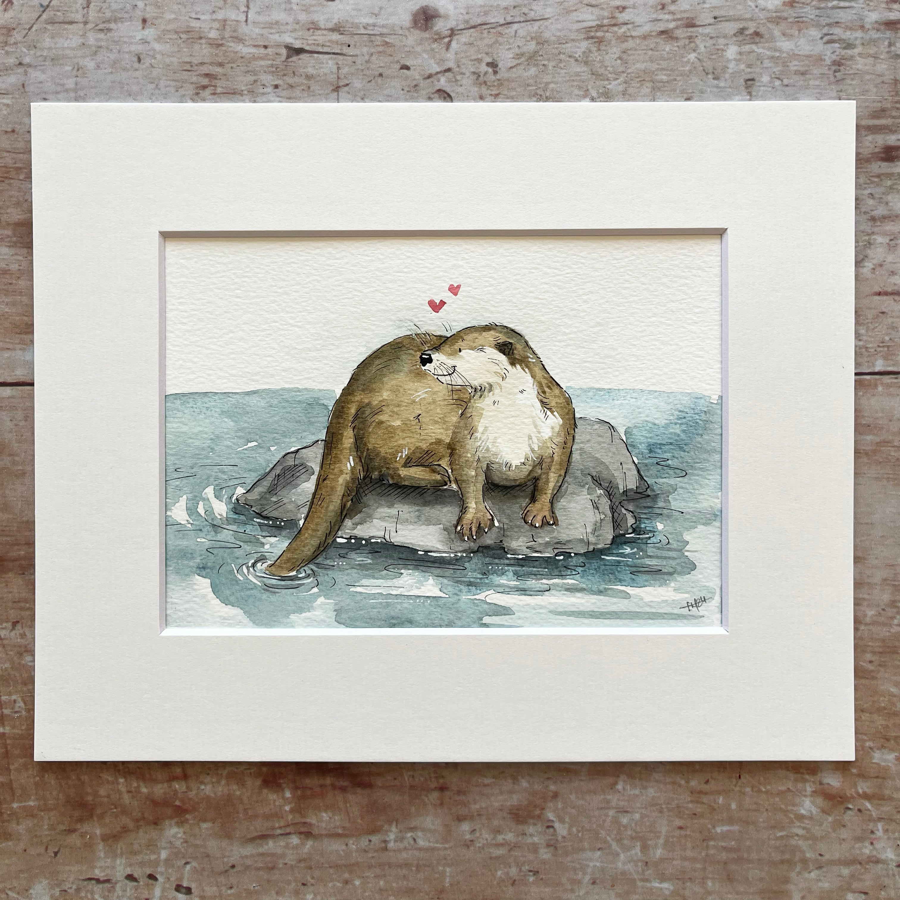 An original watercolour illustration of 'Otto' the otter. This watercolour illustration is one of a kind and shows a gorgeous otter on a rock whilst taking a break from swimming and fishing. One of a kind as the original artwork.