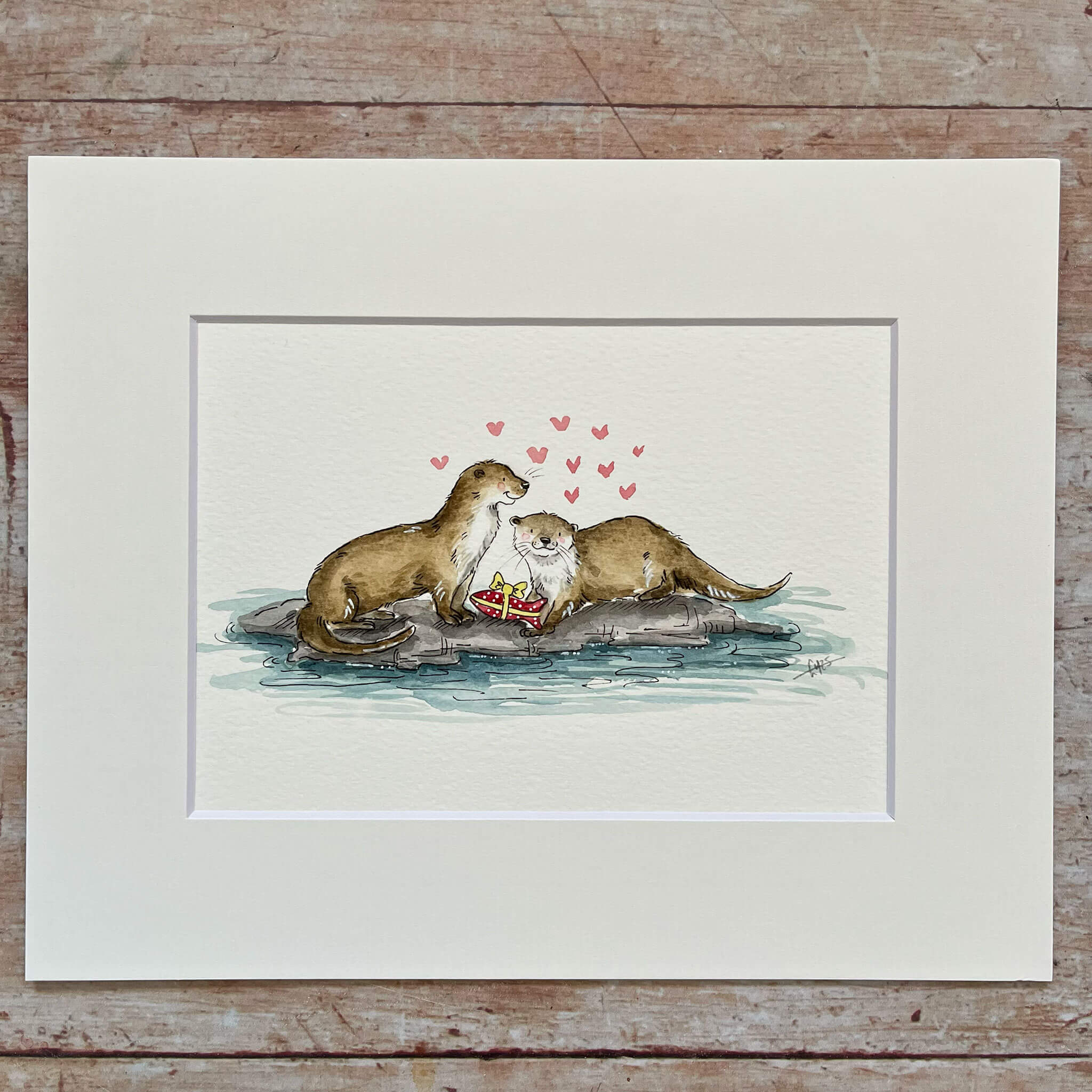 An original watercolour illustration of 'Owen and Orla' the otters. This watercolour illustration is one of a kind and shows 2 gorgeous otters on a rock. There is a present between them (lets guess its a fish wrapped up!). One of a kind as the original artwork. Please be aware that this artwork has been printed into a card and A4 print. This is the original artwork.