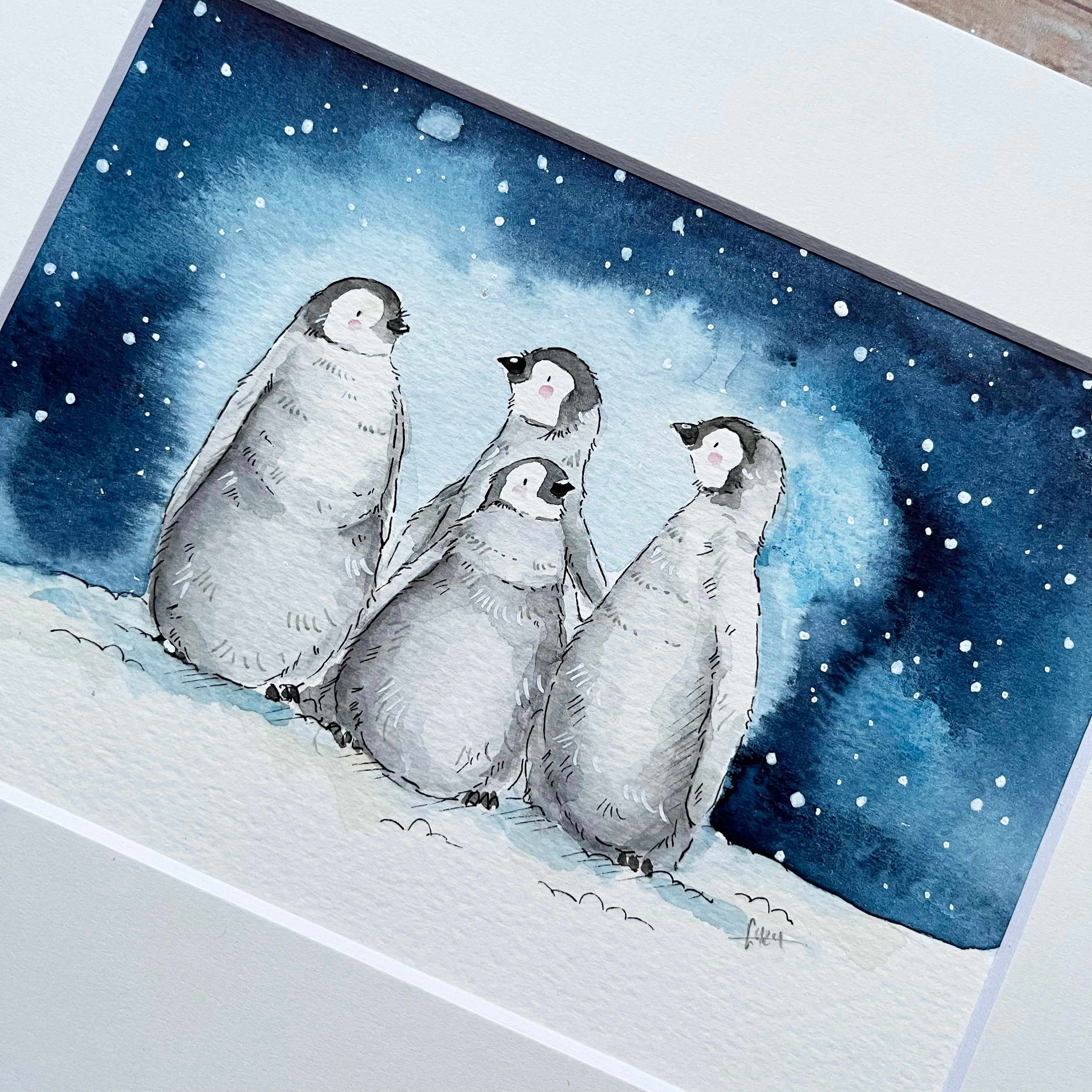 An original watercolour illustration of 'Penny, Peter, Paul and Paisley' the penguin chicks. This watercolour illustration is one of a kind and shows four fluffy penguin chicks huddled together enjoying the snow. One of a kind as the original artwork.