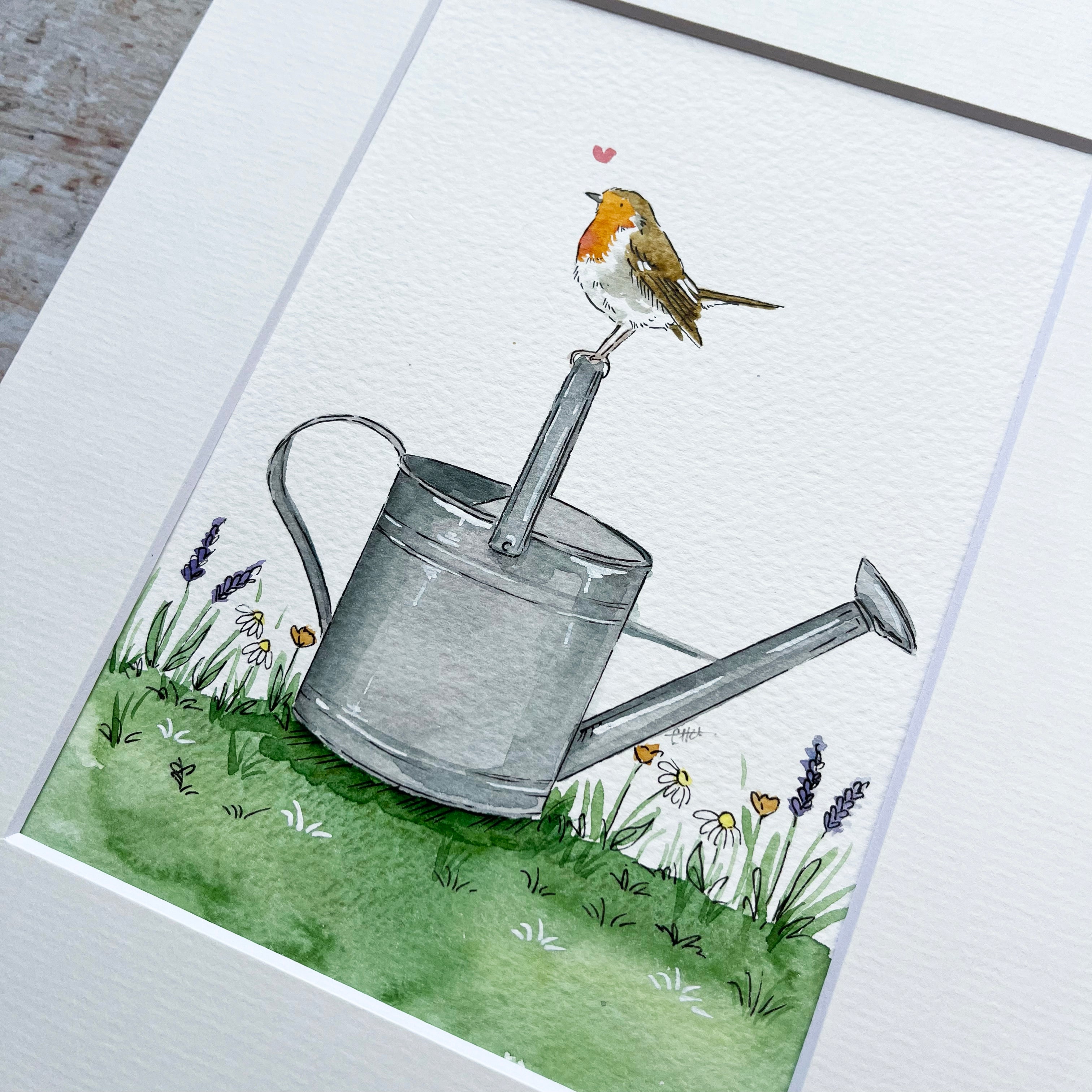 An original watercolour illustration of 'Ronnie' the robin. This watercolour illustration is one of a kind and shows a beautiful robin bird resting on a watering can. One of a kind as the original artwork.