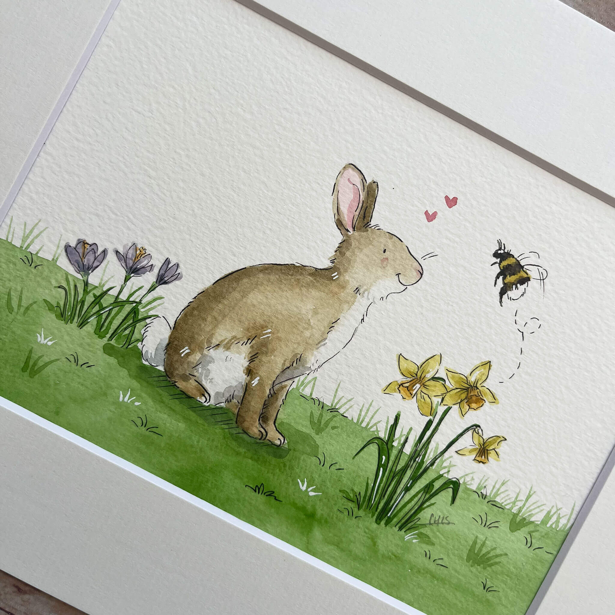 An original watercolour illustration of 'Rosa' the rabbit. 'Rosa' is enjoying the beginning of Spring amongst crocus, daffodils and a friendly bumblebee. This watercolour illustration is one of a kind as the original.