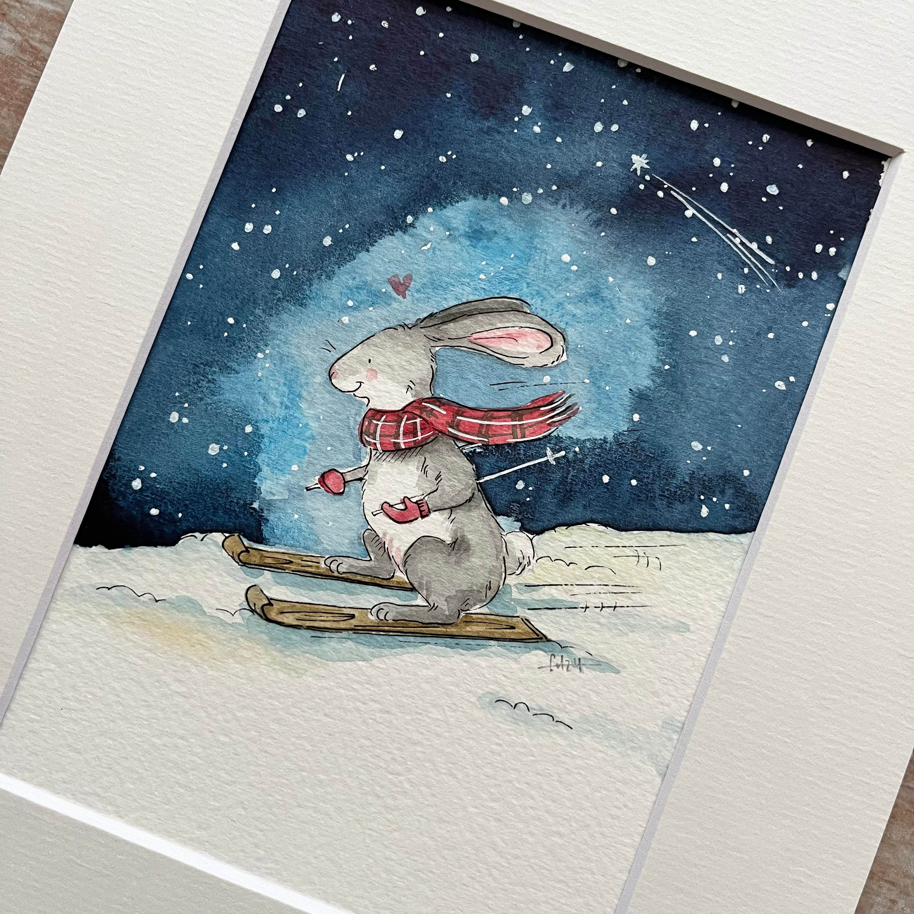 An original watercolour illustration of 'Rowan' the rabbit. This watercolour illustration is one of a kind and showing a handsome rabbit skiing down a snowy slope with a shooting star in the background. One of a kind as the original artwork.