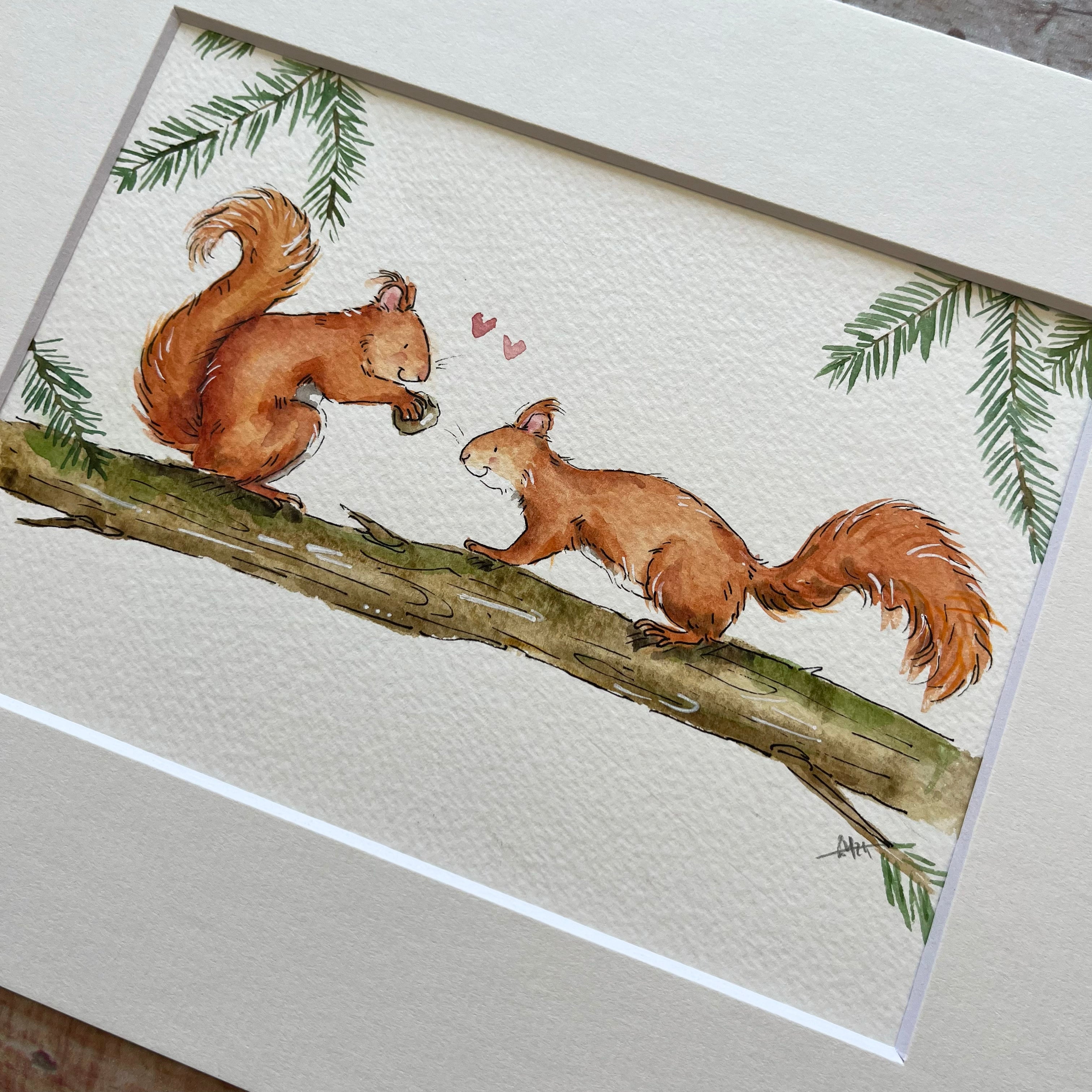 An original watercolour illustration of 'Seb and Sadie' the red squirrels. This watercolour illustration is one of a kind and shows 2 lovely red squirrels on a branch. One of the squirrels is holding a hazelnut. One of a kind as the original artwork.