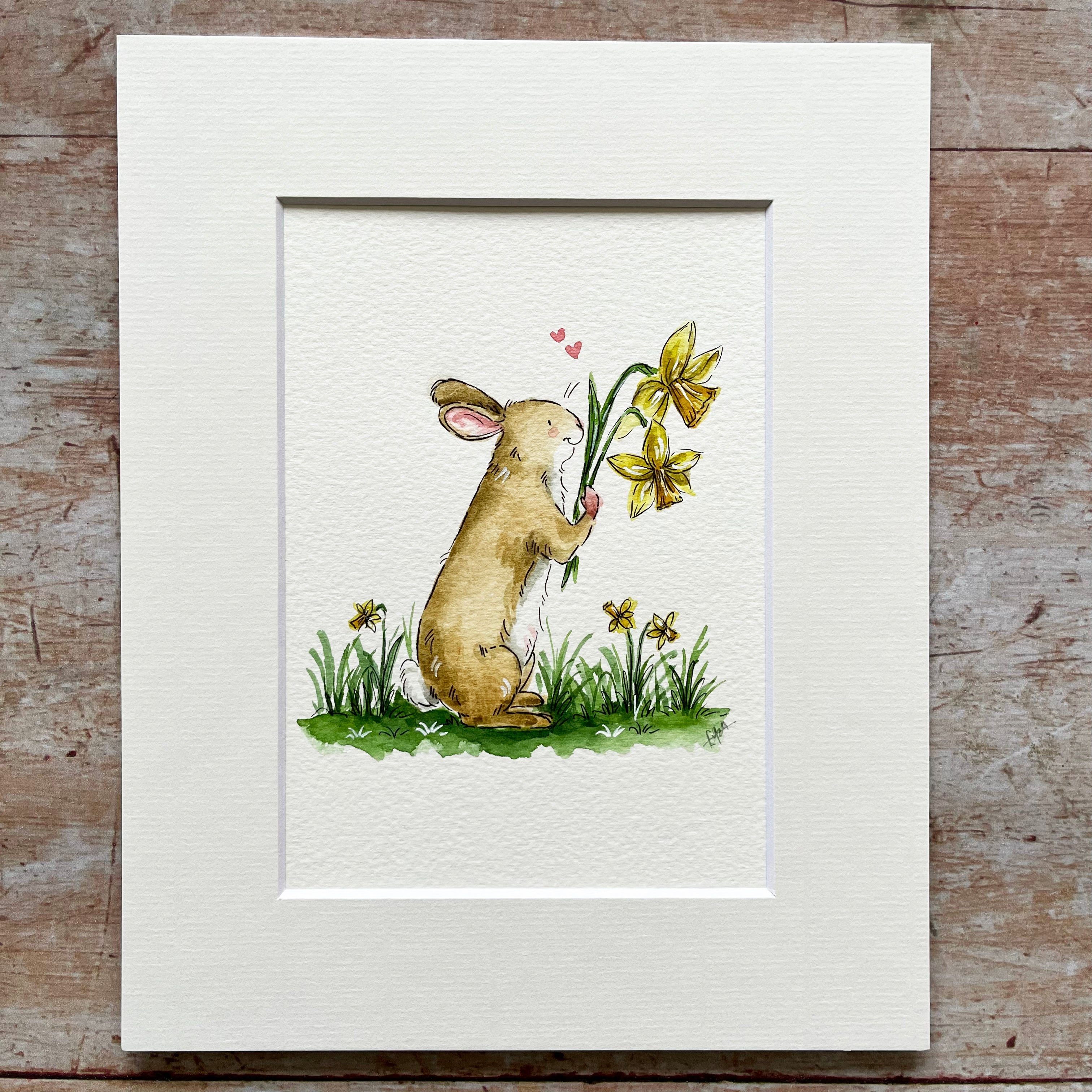 An original watercolour illustration of 'Rose' the Rabbit. This watercolour illustration is one of a kind and shows a lovely bunny holding daffodils. One of a kind as the original artwork.
