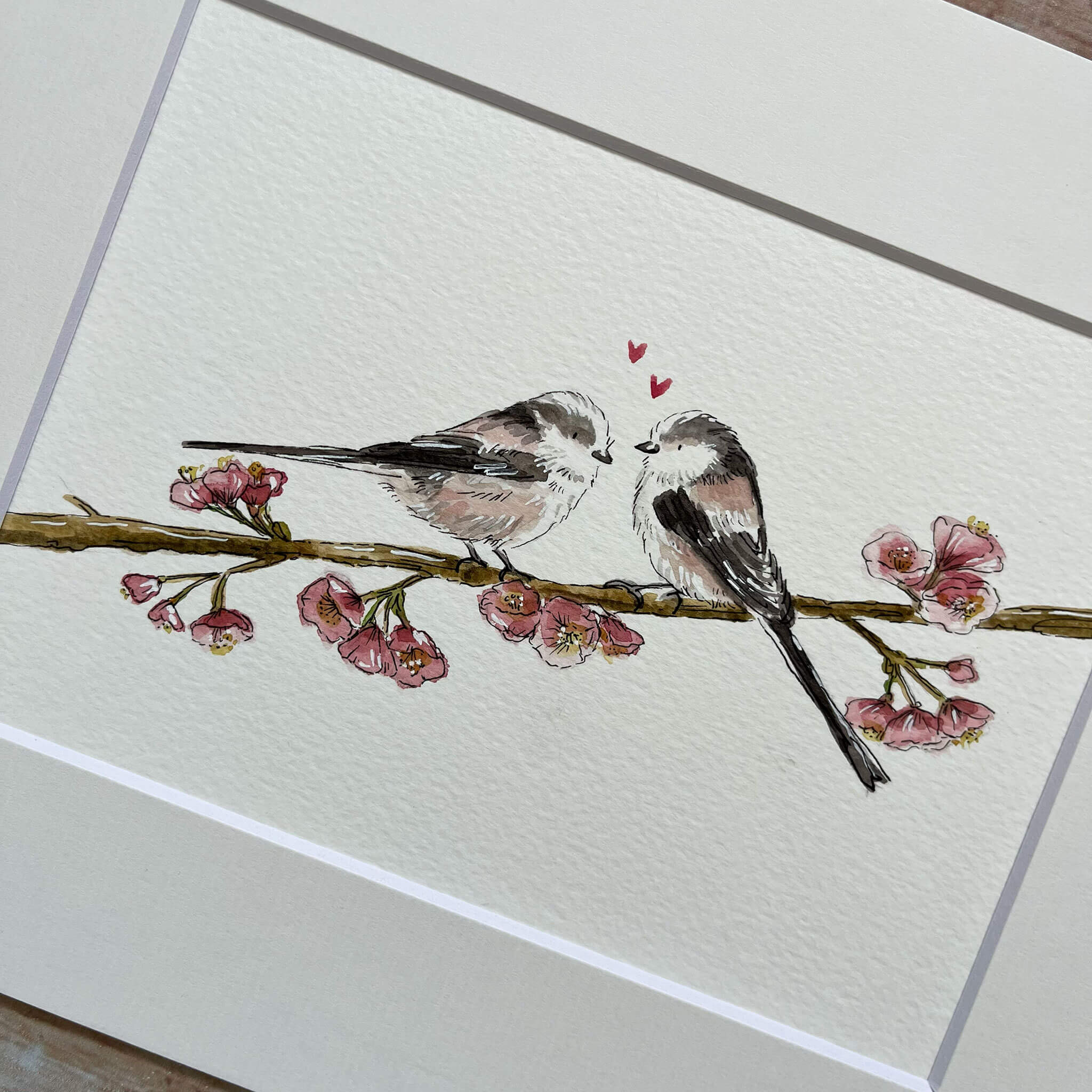 An original watercolour illustration of 'Theodore and Tabitha' the Long Tailed tits. This artwork was inspired by Spring and the long tailed tits currently enjoying the blossom in the garden. This watercolour illustration is one of a kind.