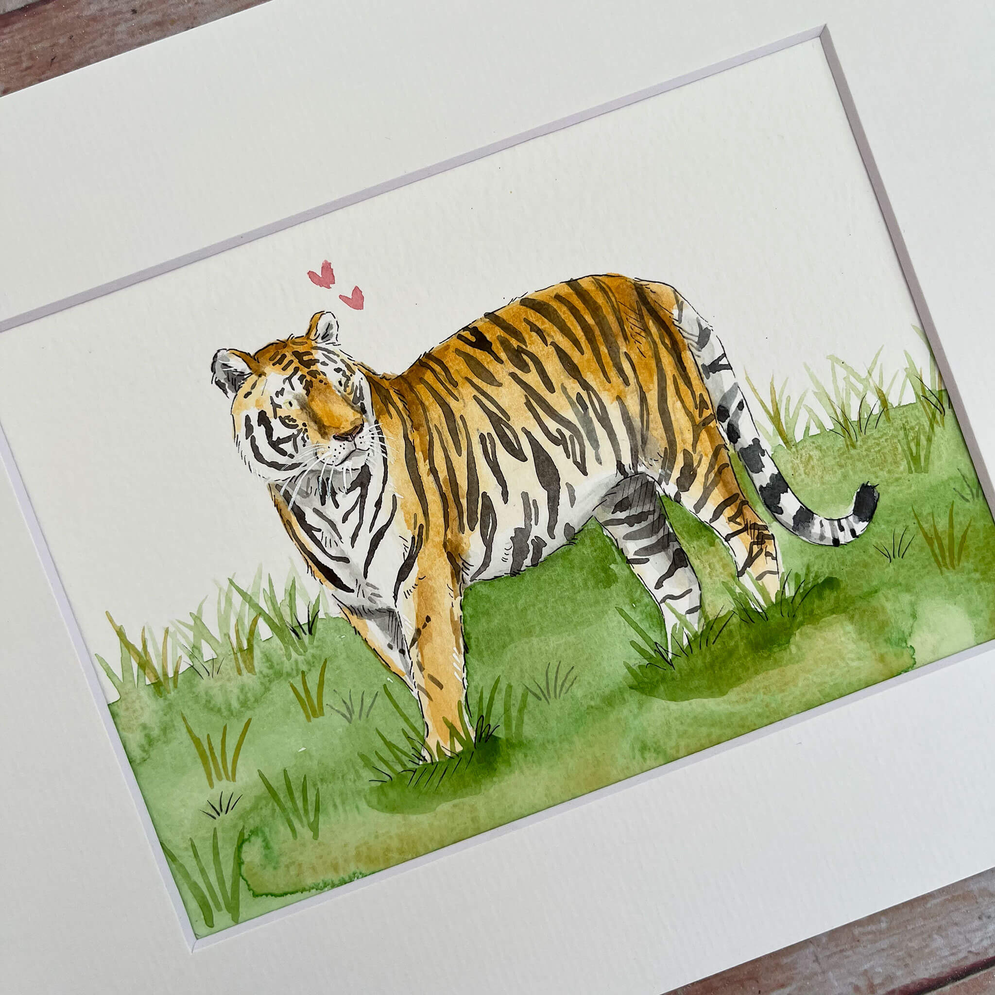 An original watercolour illustration of 'Tilly' the Tiger. This watercolour illustration is one of a kind and shows a beautiful Bengal Tiger amongst long grass. Inspired by Global Tiger Day.