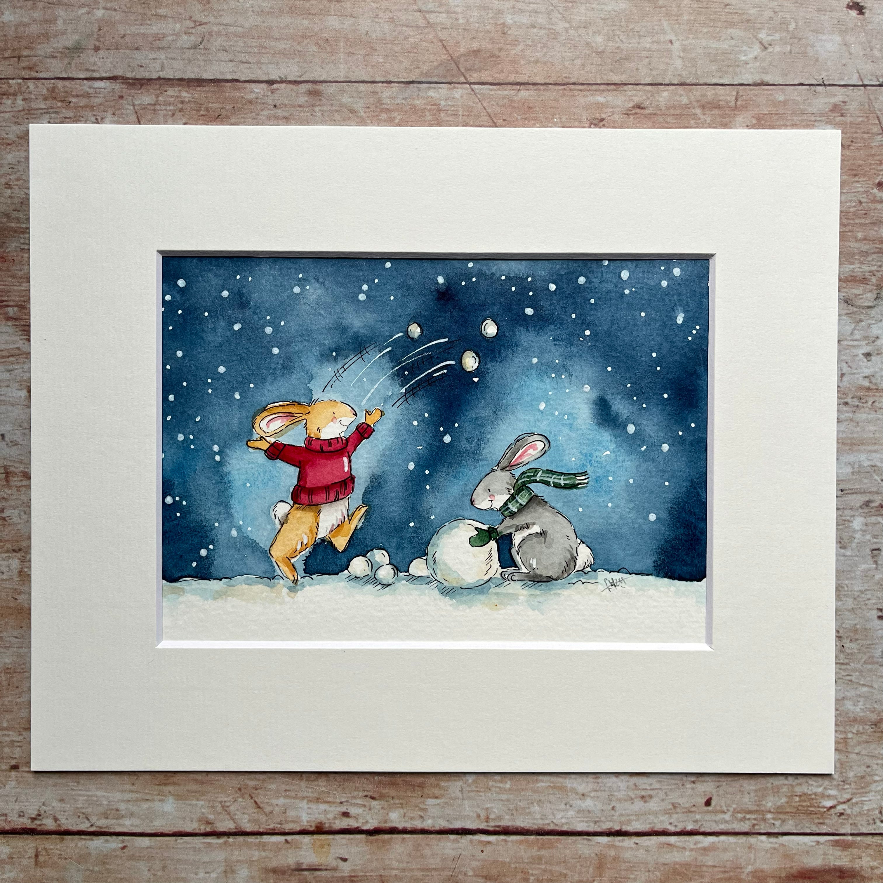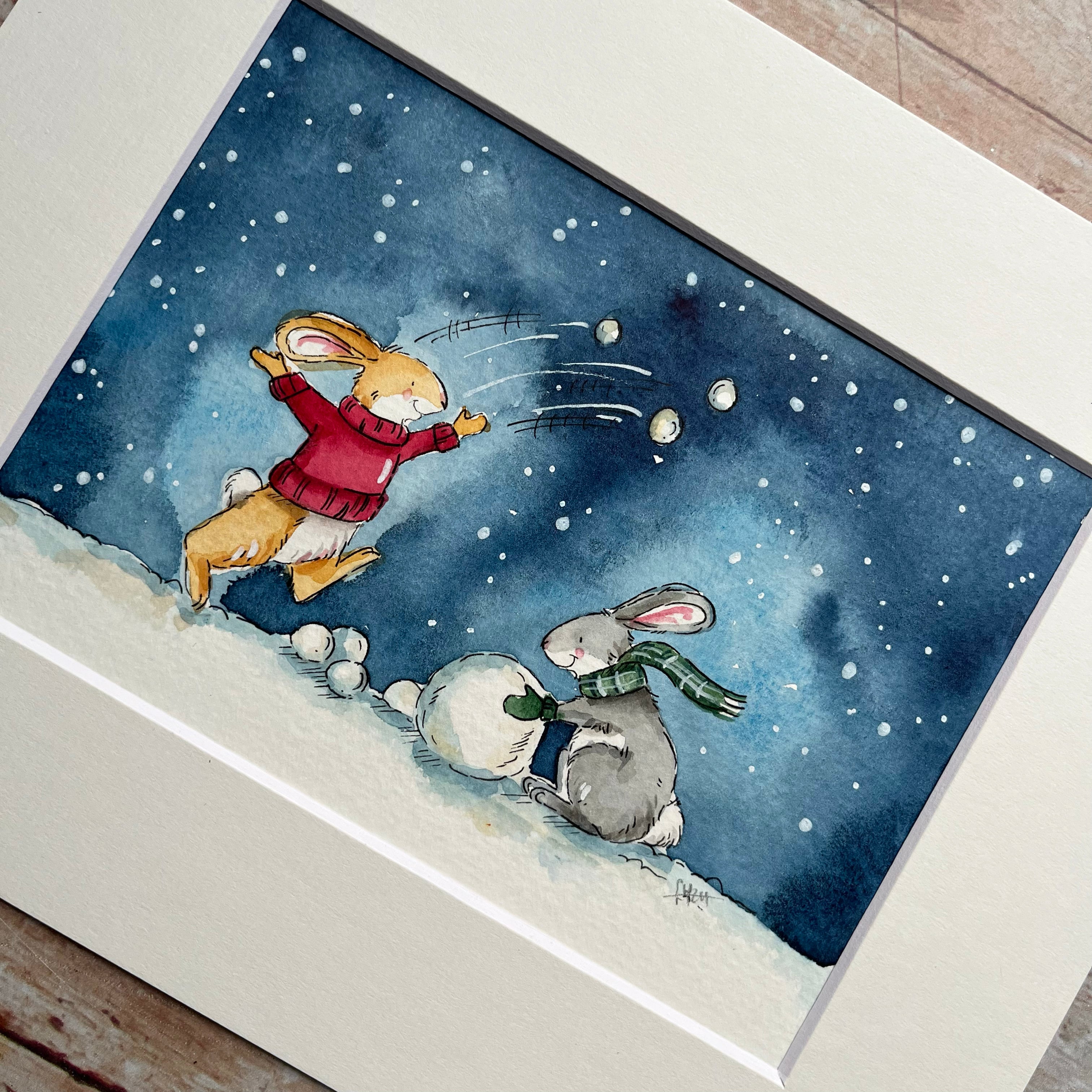 An original watercolour illustration of 'Bryn and Bethan' the winter bunnies. This watercolour illustration is one of a kind and shows two lovely bunnies playing in the snow.
