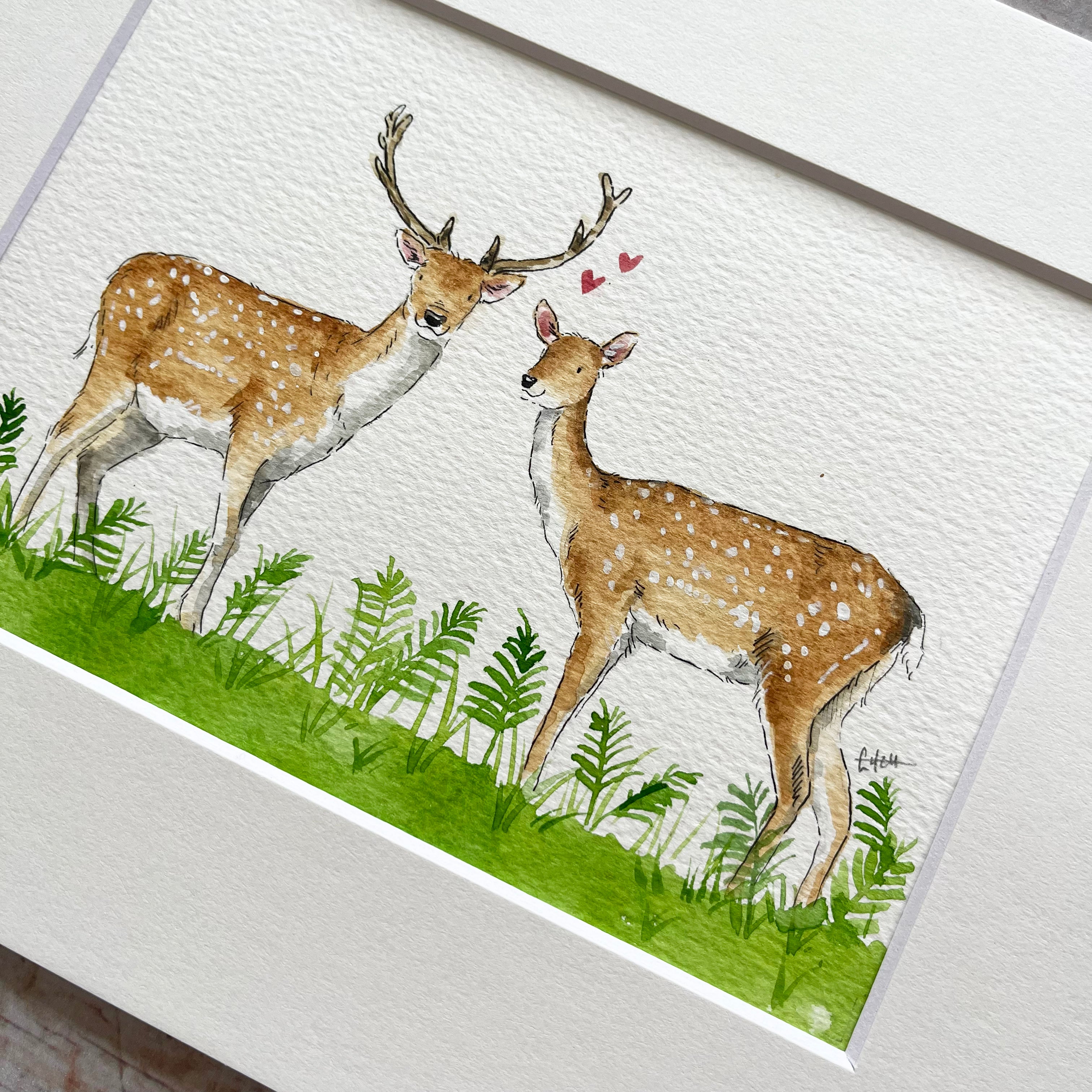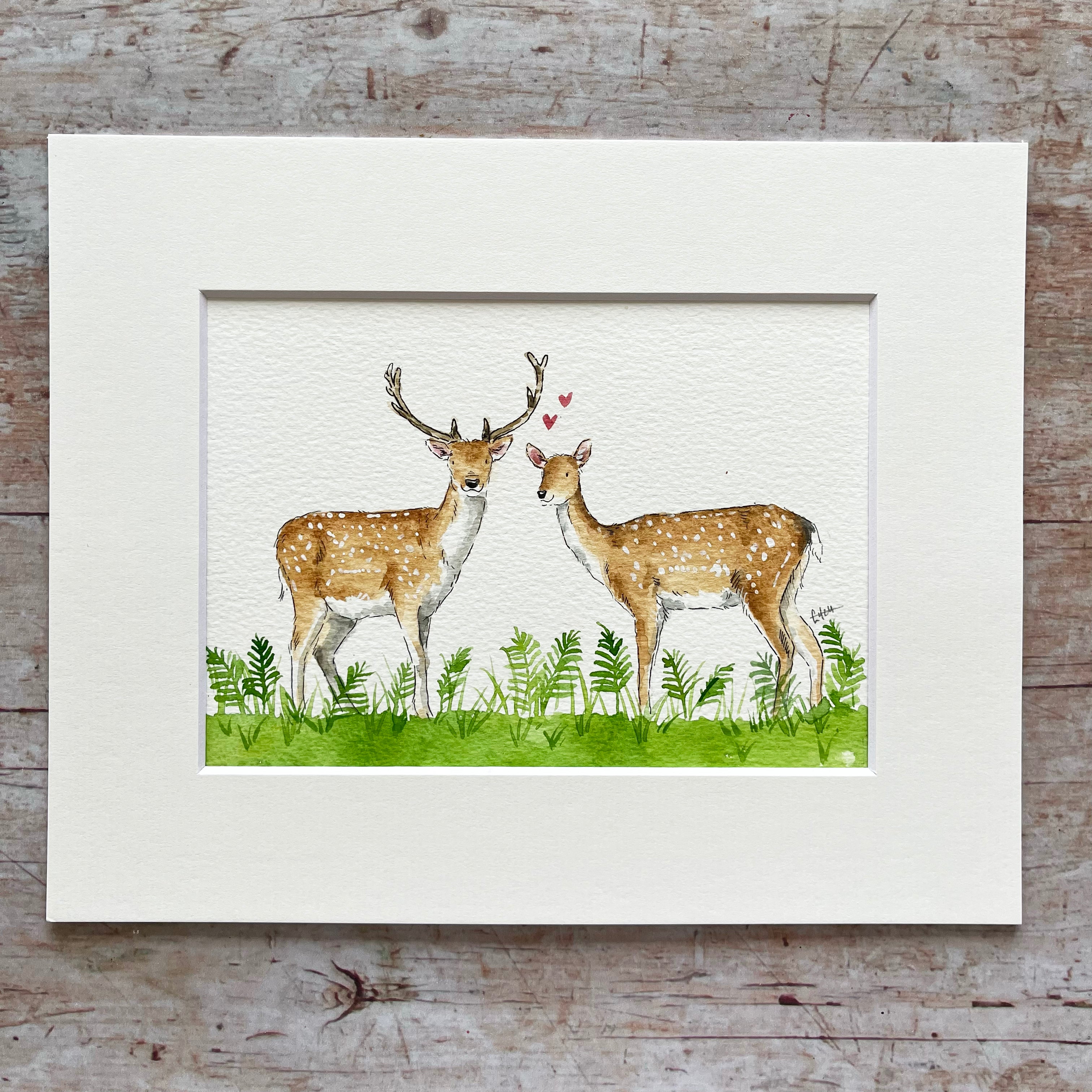 An original watercolour illustration of 'Dominic and Delilah' the beautiful fallow deer. This watercolour illustration is one of a kind and shows a handsome buck and beautiful doe standing amongst bracken. One of a kind as the original artwork.