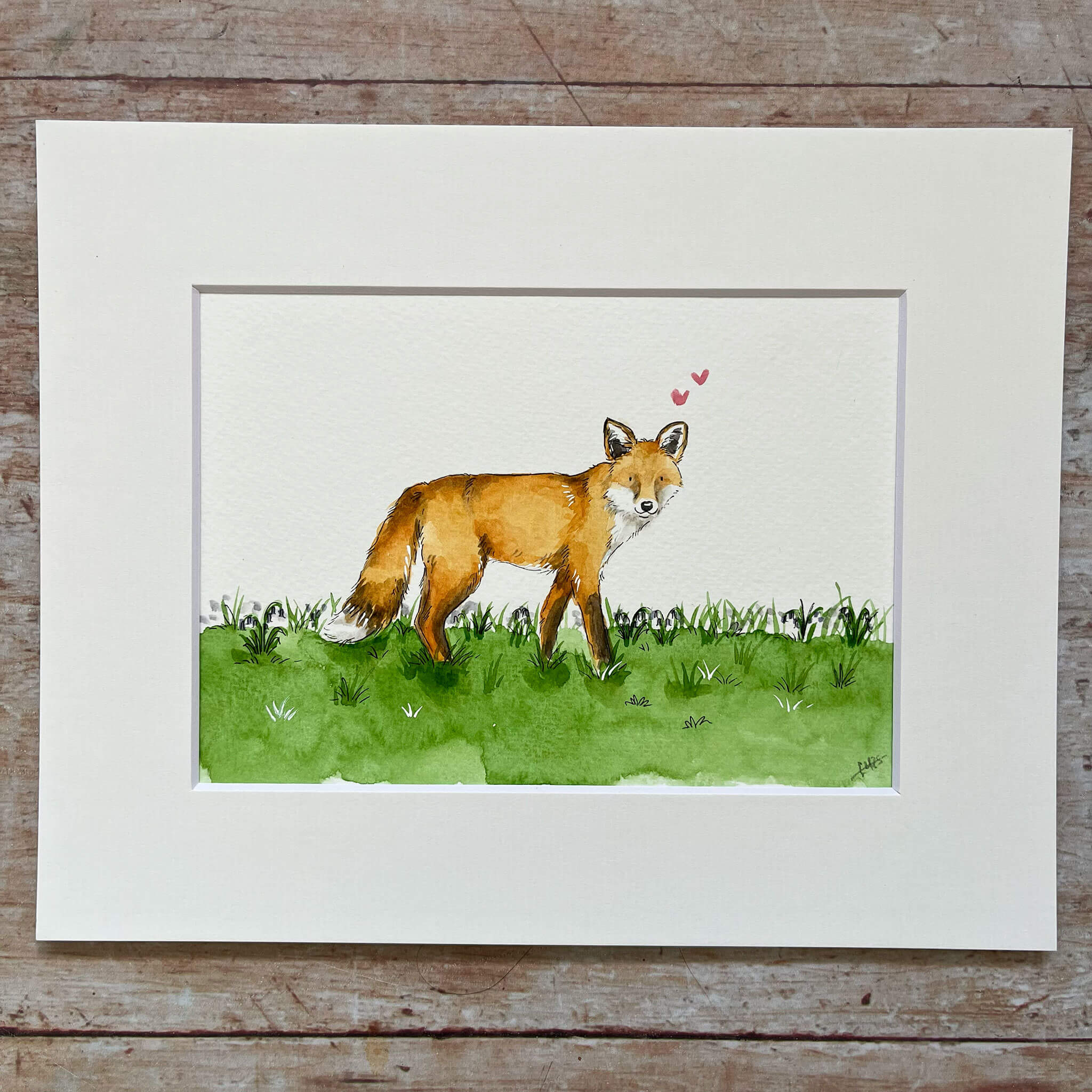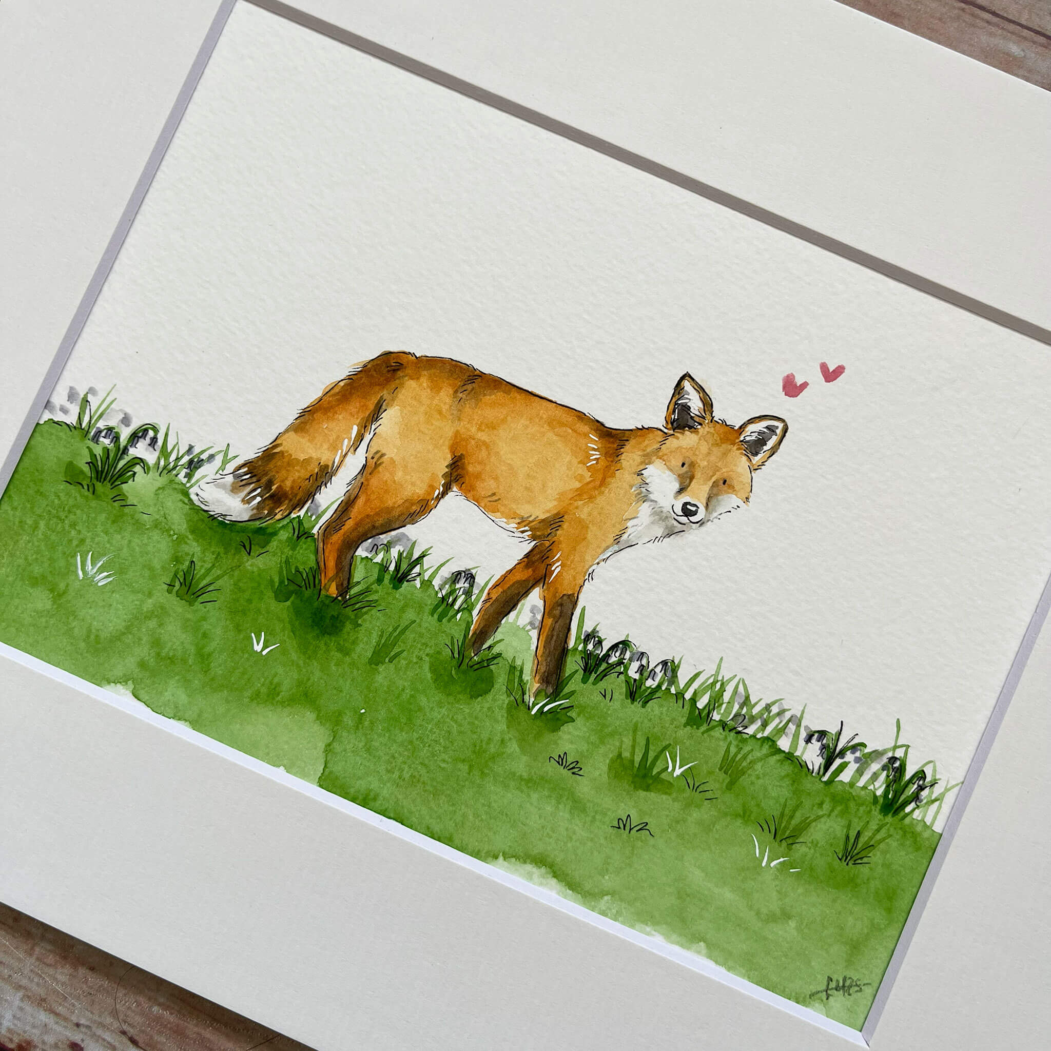 An original watercolour illustration of 'Fflur' the fox. Fflur was inspired after seeing foxes in a nearby field enjoying the bluebells and I have named her after traditional Welsh name that means 'flower'. This watercolour illustration is one of a kind.