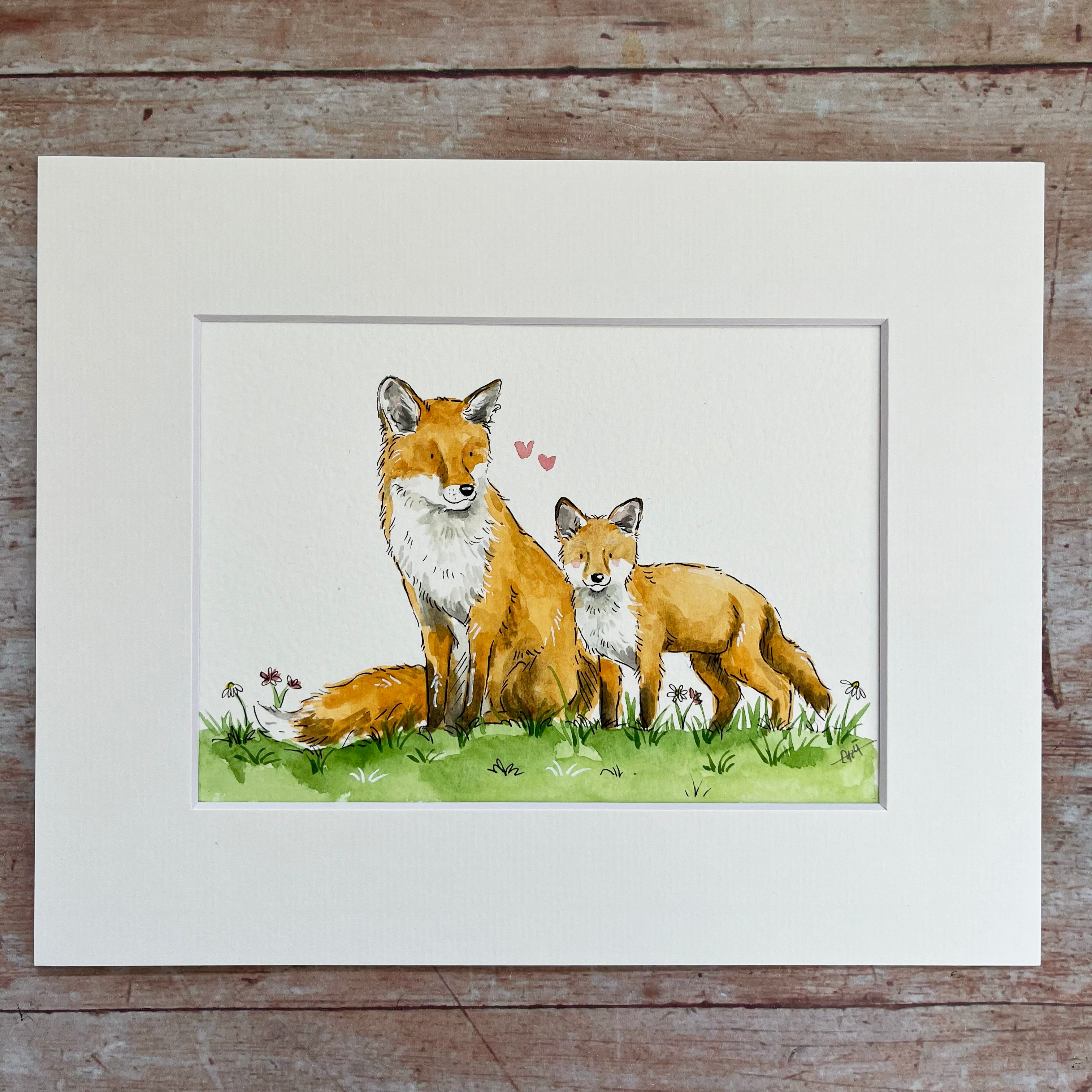 An original watercolour illustration of 'Fifi and Frances' the fox and fox cub. This watercolour illustration is one of a kind and shows a beautiful fox and fox cub in a spring field of daisies and campion.
