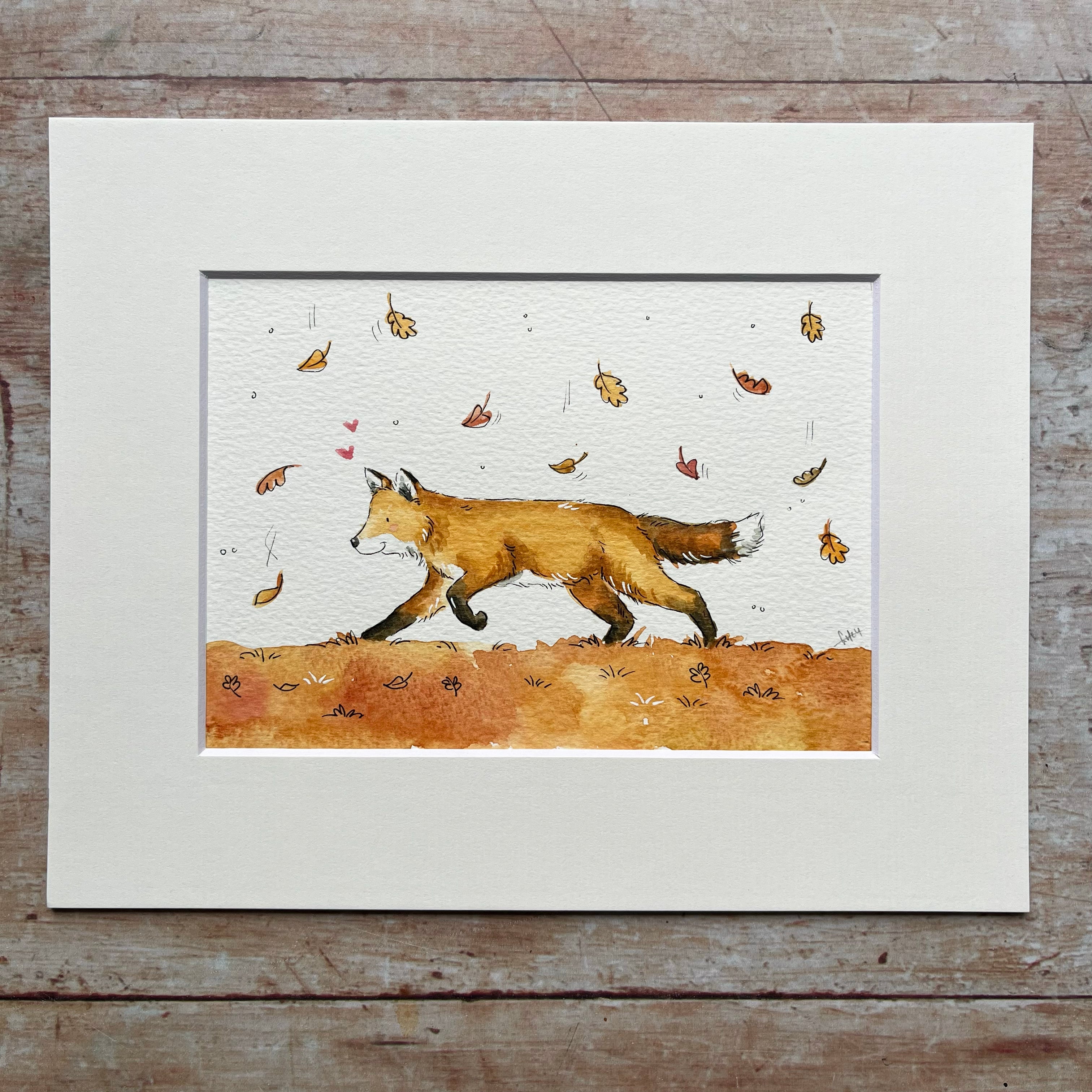 An original watercolour illustration of 'Finley' the fox. This watercolour illustration is one of a kind and shows a handsome fox strolling through autumn leaves. One of a kind as the original artwork.