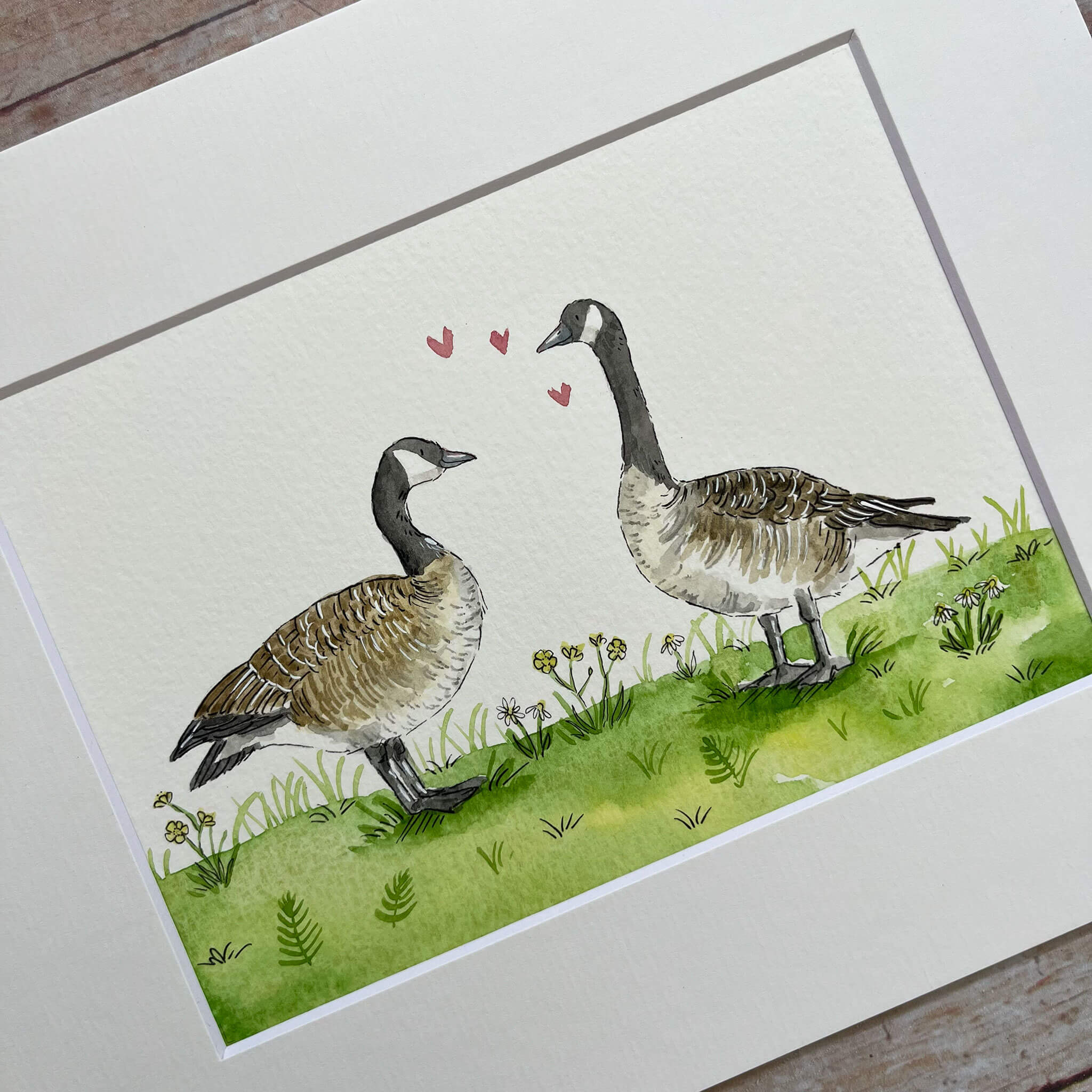 An original watercolour illustration of 'Gwen and Geraint' the Geese. This artwork was inspired by lovely Canada Geese I see on my local walk around Roath Park Lake. These charming geese are enjoying the summer flowers. This watercolour illustration is one of a kind as the original.