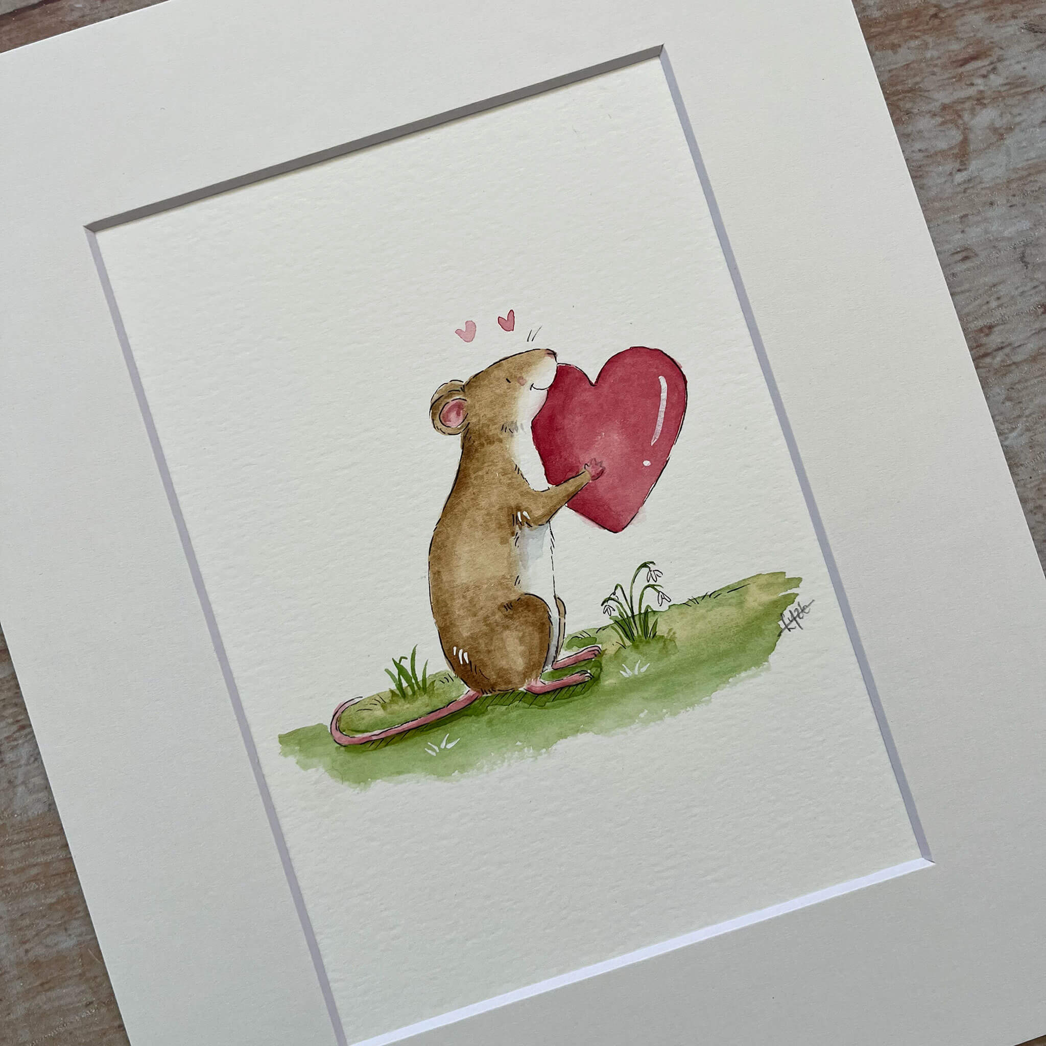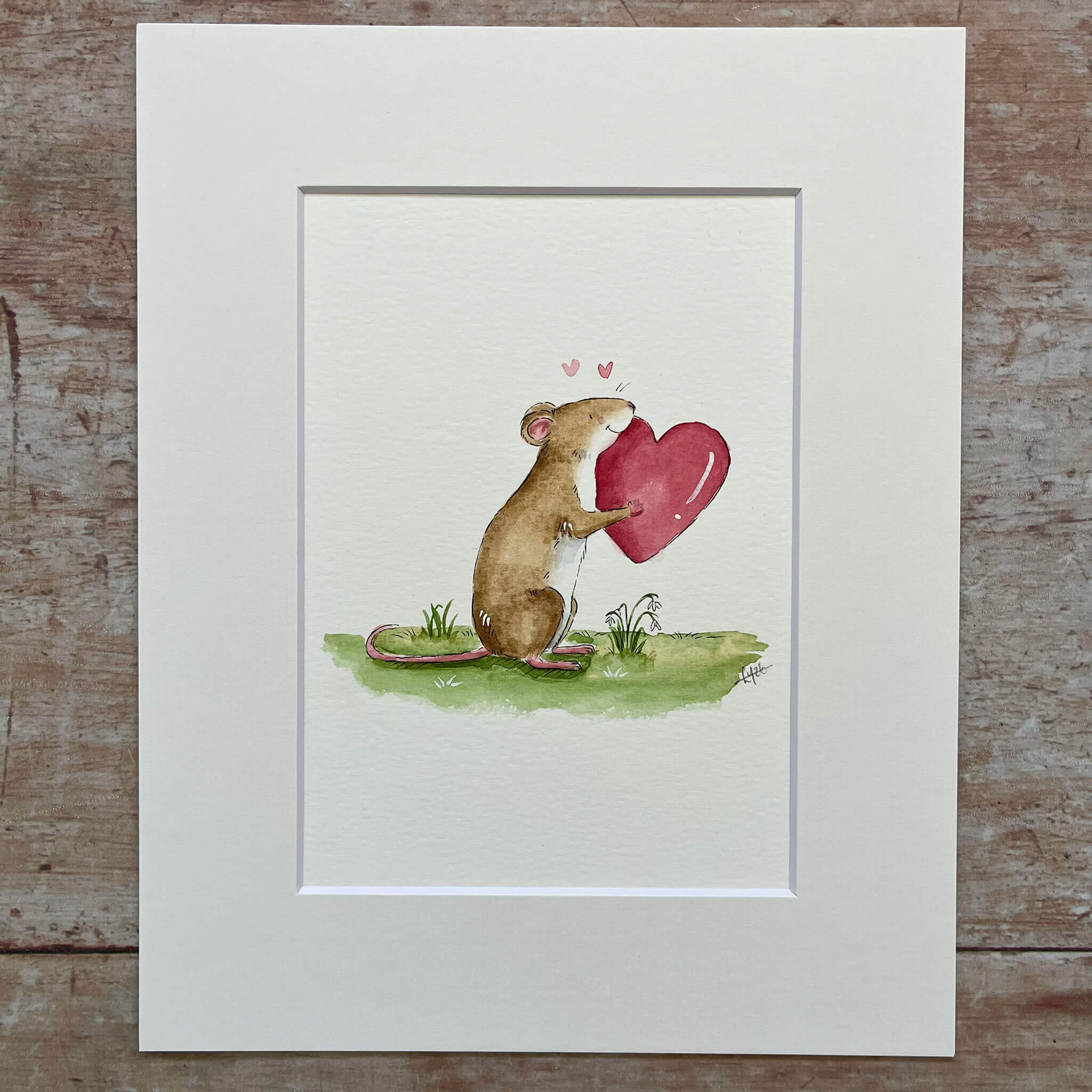 An original watercolour illustration of 'Maureen' the Mouse. Named 'Maureen' meaning beloved. This watercolour illustration is one of a kind and features a sweet little mouse holding a heart amongst some winter snowdrops. A gentle reminder to celebrate love and kindness. Perfect for bringing warmth to your home or as a thoughtful gift, this piece is painted with delicate detail and filled with character. A unique artwork to treasure, celebrating self-love, encouragement, and the simple joys of life. Please be aware that these are the original artworks and in some instances, prints may be made of the illustrations.