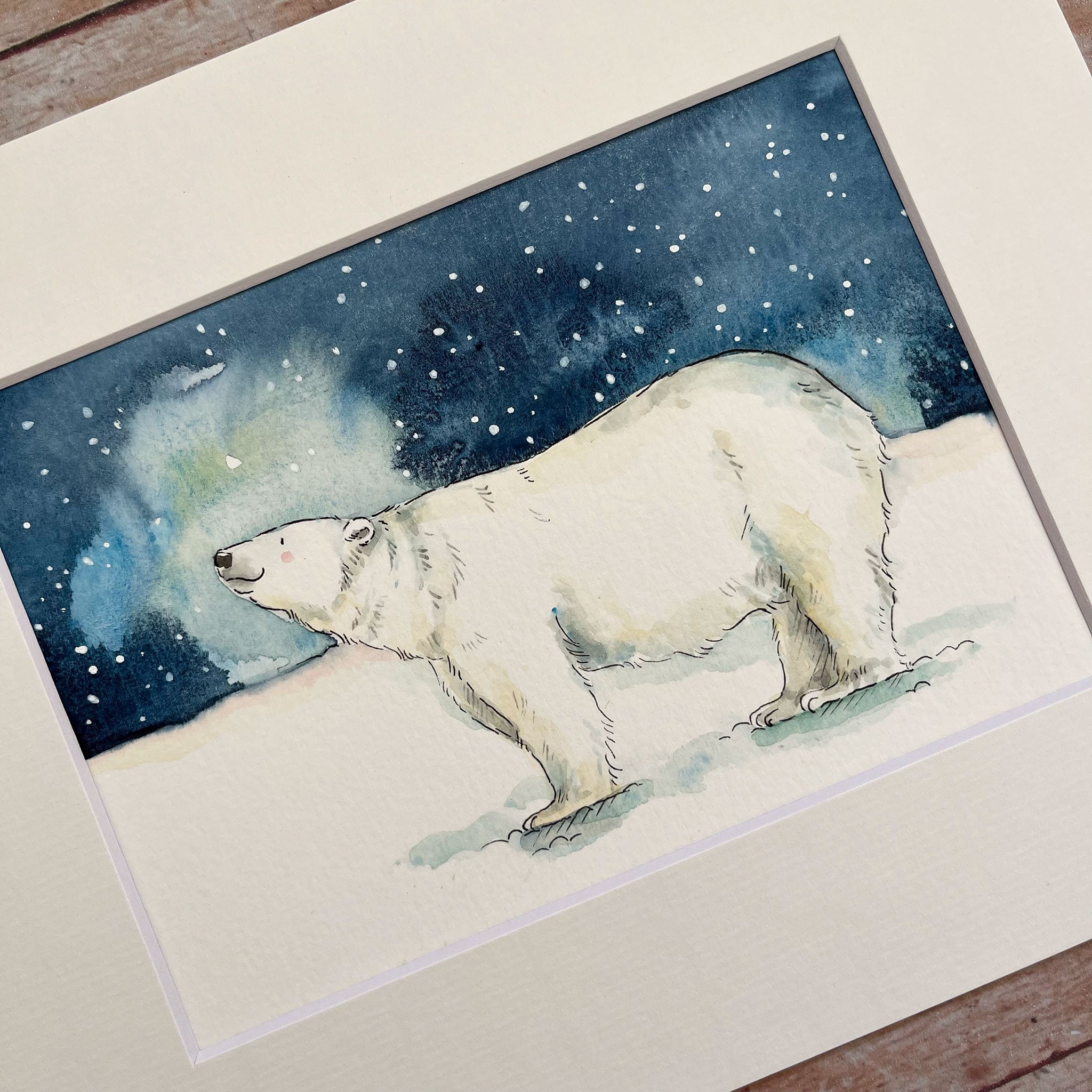 An original watercolour illustration of 'Peace' the polar bear. This beautiful polar bear is admiring the snowy sky. This watercolour illustration is one of a kind as the original.