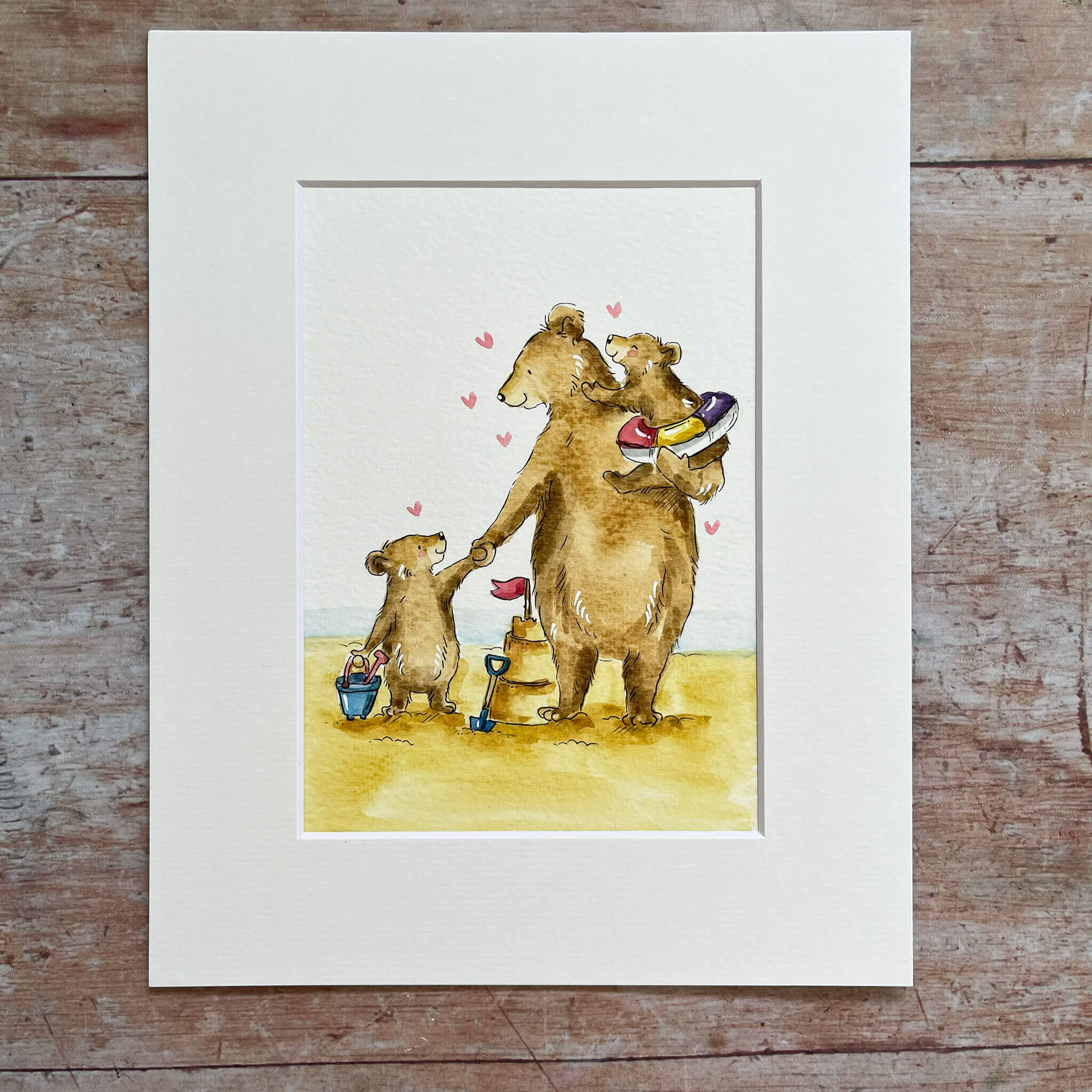 An original watercolour illustration of a family of bears enjoying their time at the beach. This watercolour illustration is one of a kind and shows 2 adorable bear cubs with their parent, enjoying some fun at the seaside. One of a kind as the original artwork.