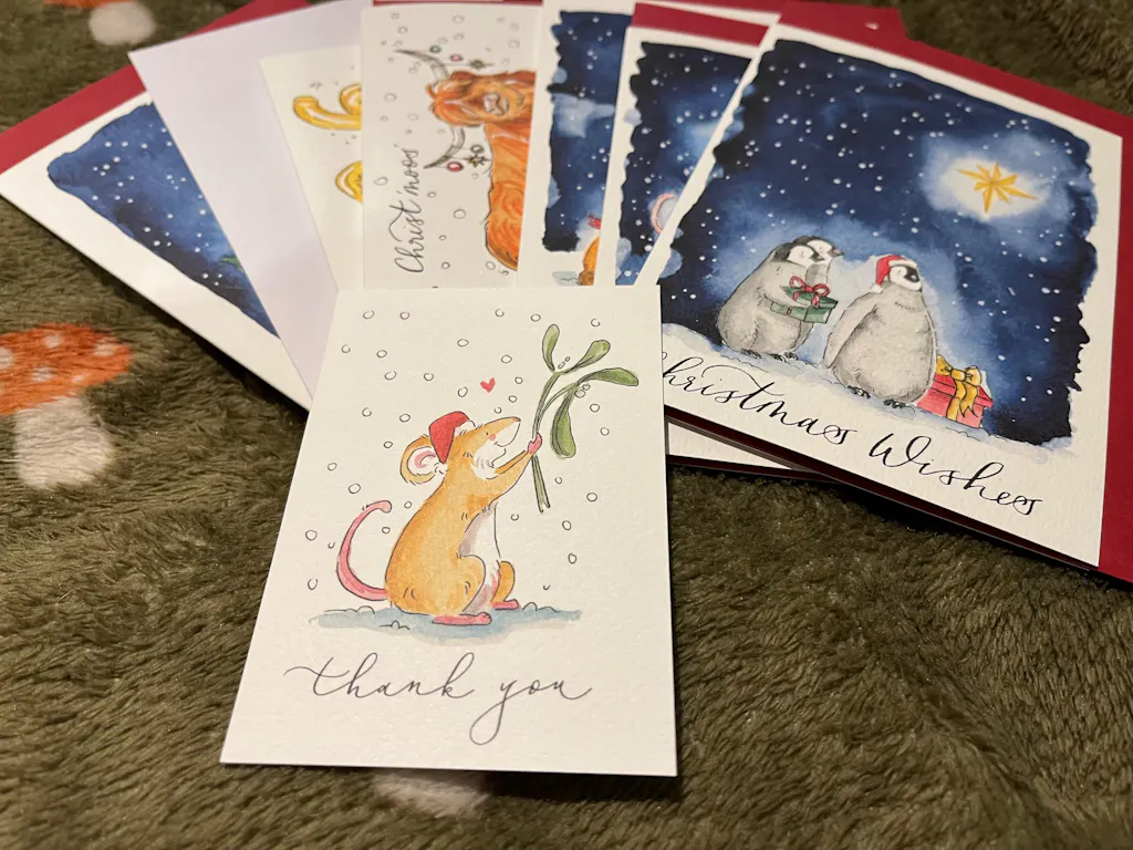 The cards are blank inside for your own message, the Christmas designs come with a red envelope and the 2026 mice card comes with a white envelope