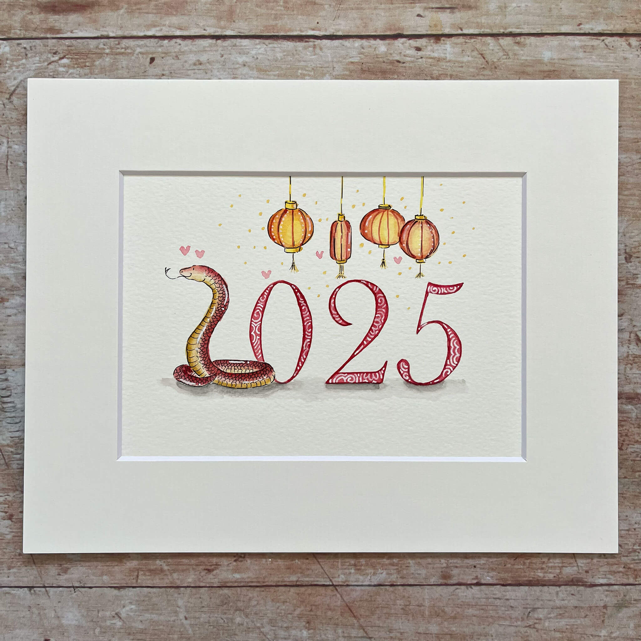 An original watercolour illustration of a wonderful Snake to celebrate the Lunar New Year and the Year of the Snake. This watercolour illustration is one of a kind and shows a Snake around the year 2025 with Chinese lanterns in the background. One of a kind as the original artwork.